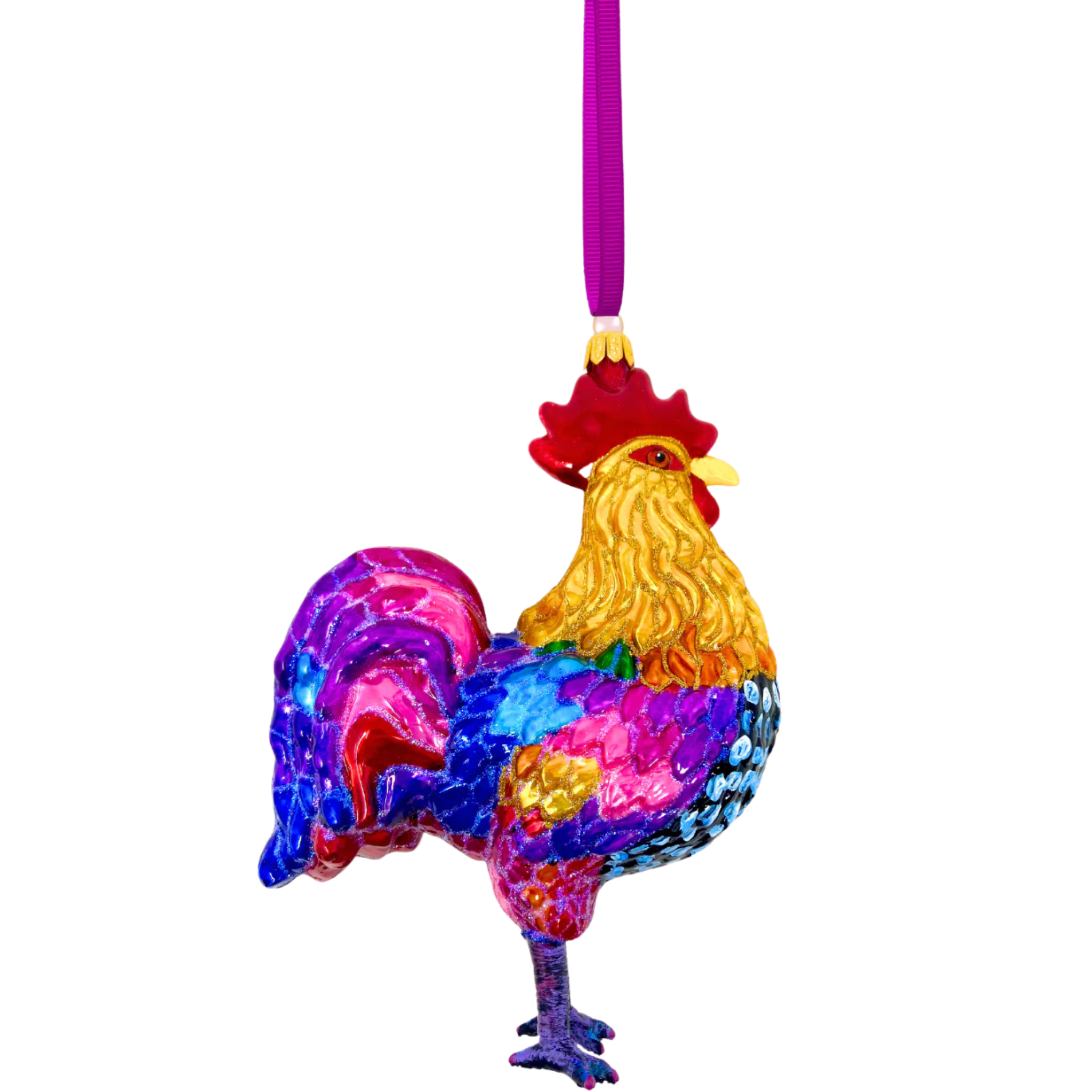 Striking and full of character, this Rooster Glass Ornament bursts with personality and color. Lush jewel tones of sapphire, fuchsia, and crimson layer beautifully across its sculpted plumage, creating a rich, iridescent finish that catches the light from every angle. With fine detailing and a proud stance, this ornament adds a touch of whimsy and elegance to your holiday décor - perfect for those who appreciate bold design and vibrant craftsmanship.