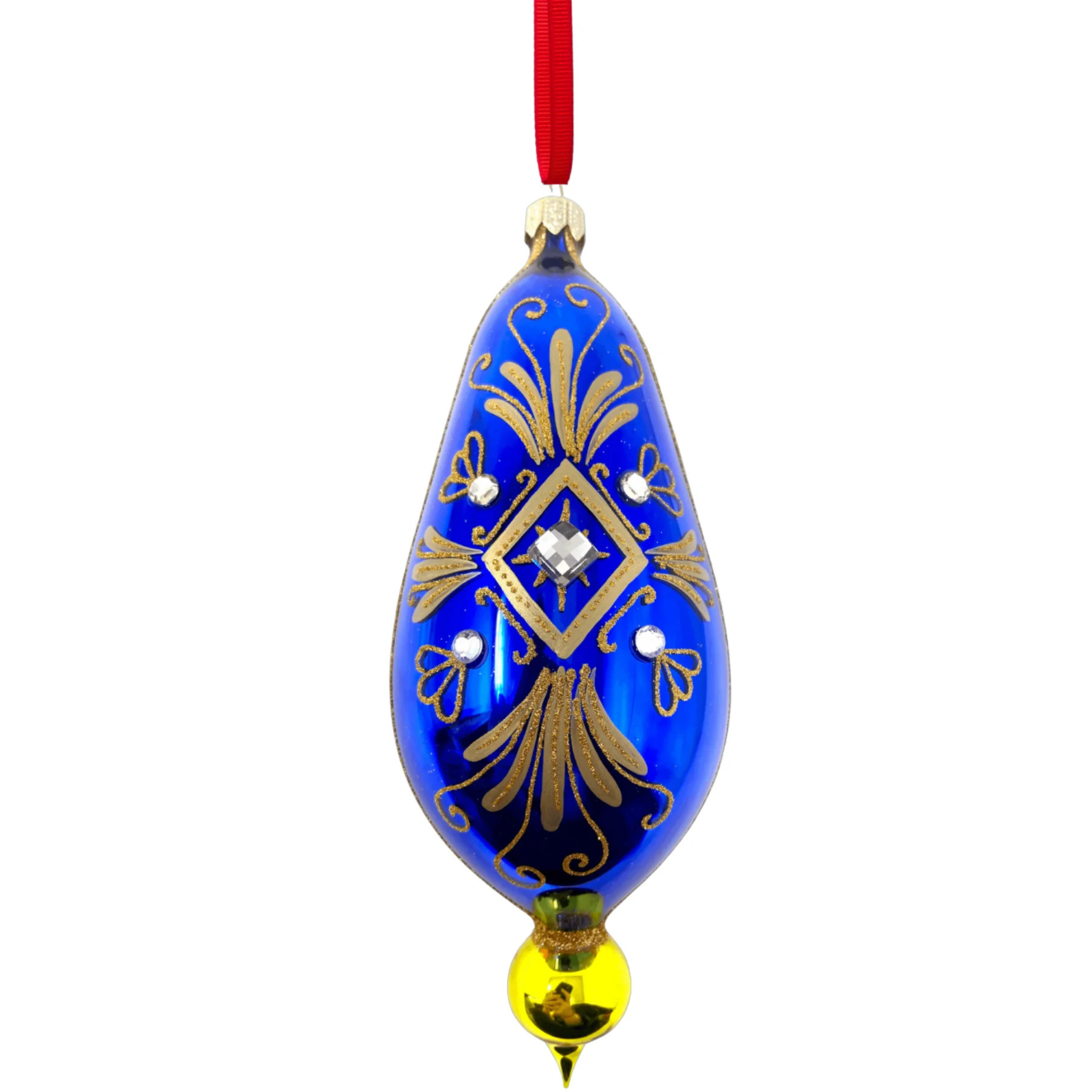 Add a touch of regal elegance to your tree with this elongated glass ornament, shimmering in rich royal cobalt blue. Delicate golden flourishes wrap around its sleek silhouette, creating a timeless and luxurious look. A perfect accent for classic, elegant, or jewel-toned holiday themes.