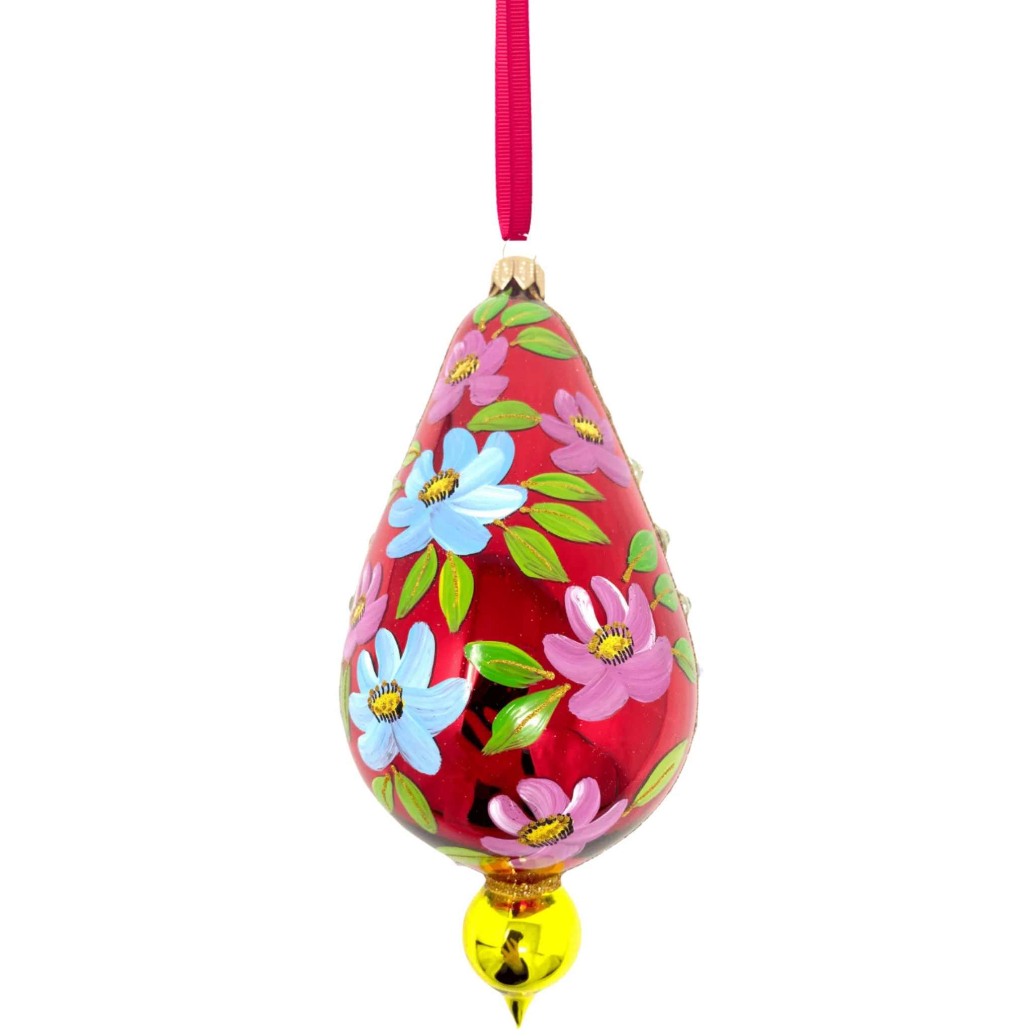 Delicate and timeless, this glass ornament features soft blue and blush petals gracefully blooming against a rich red backdrop. The gentle color contrast evokes a sense of warmth and serenity, making it a perfect addition to any holiday tree or floral-inspired decor. The intricate design and subtle elegance bring a touch of nature’s beauty to your festive display.