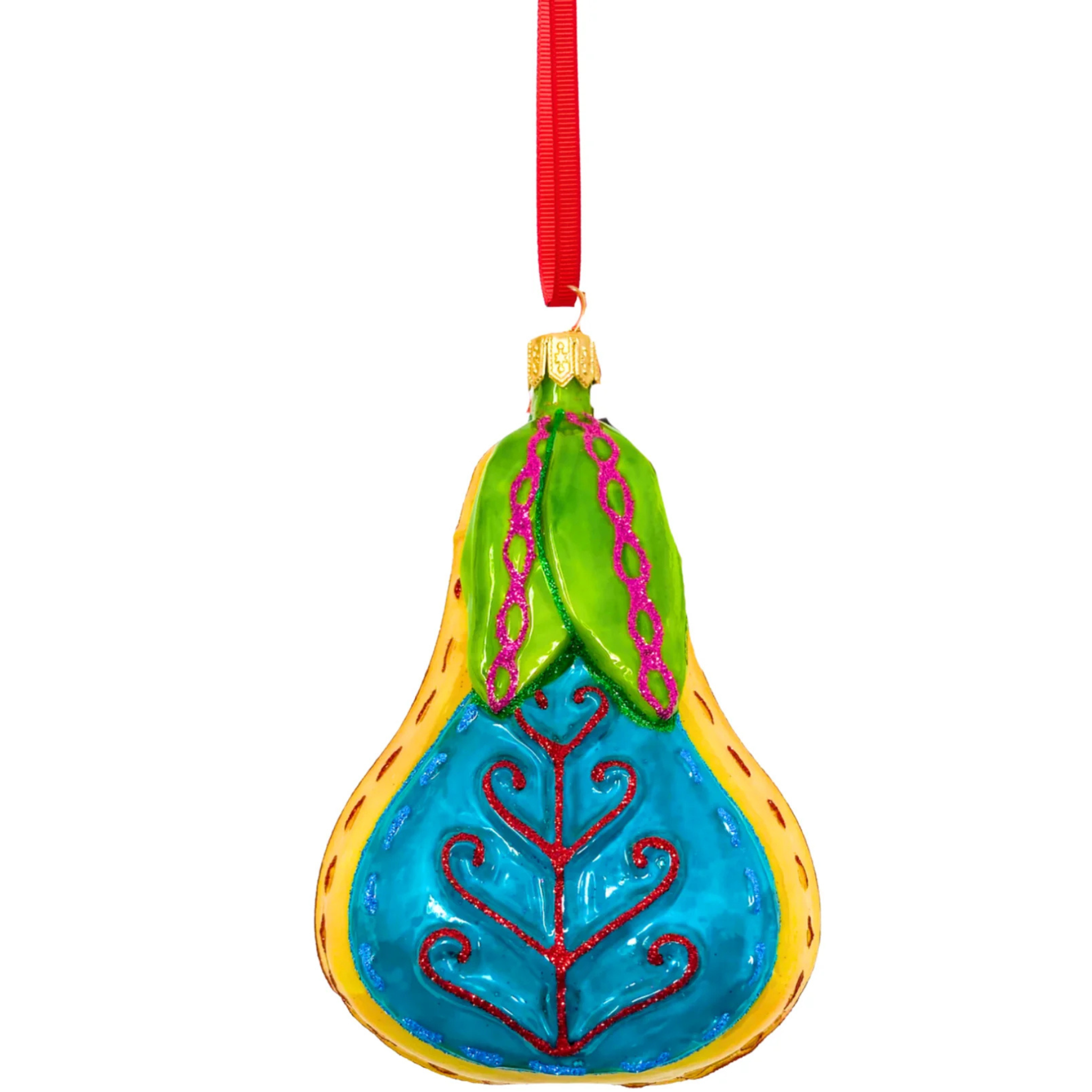 Inspired by the timeless beauty of handcrafted folk art, this pear-shaped glass ornament features a harmonious blend of turquoise, golden yellow, and lively green hues. Delicate vine-like patterns weave across its surface, adding a touch of nature’s elegance and intricate craftsmanship. The combination of bold colors and fine detailing makes this ornament a unique and captivating addition to any holiday decor.