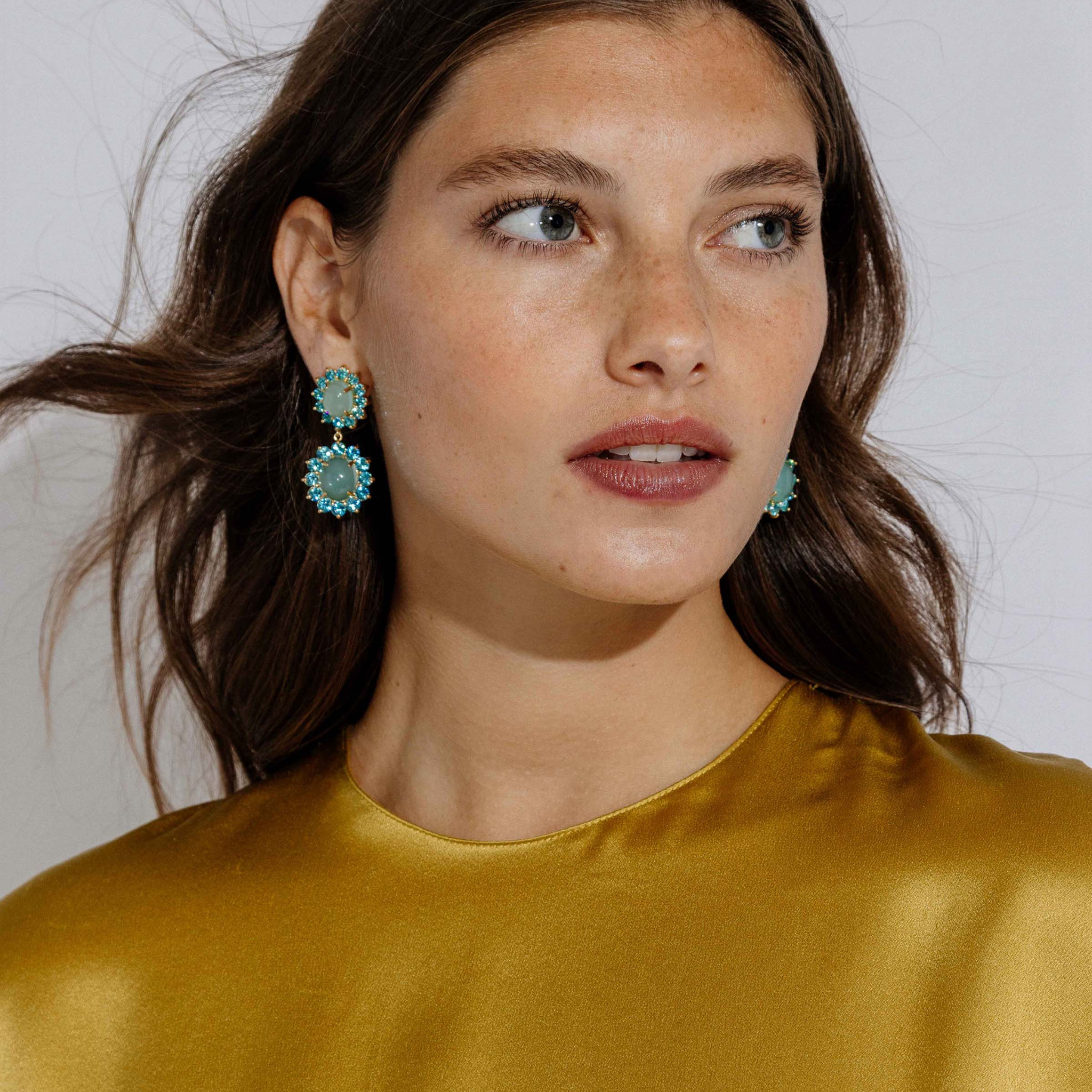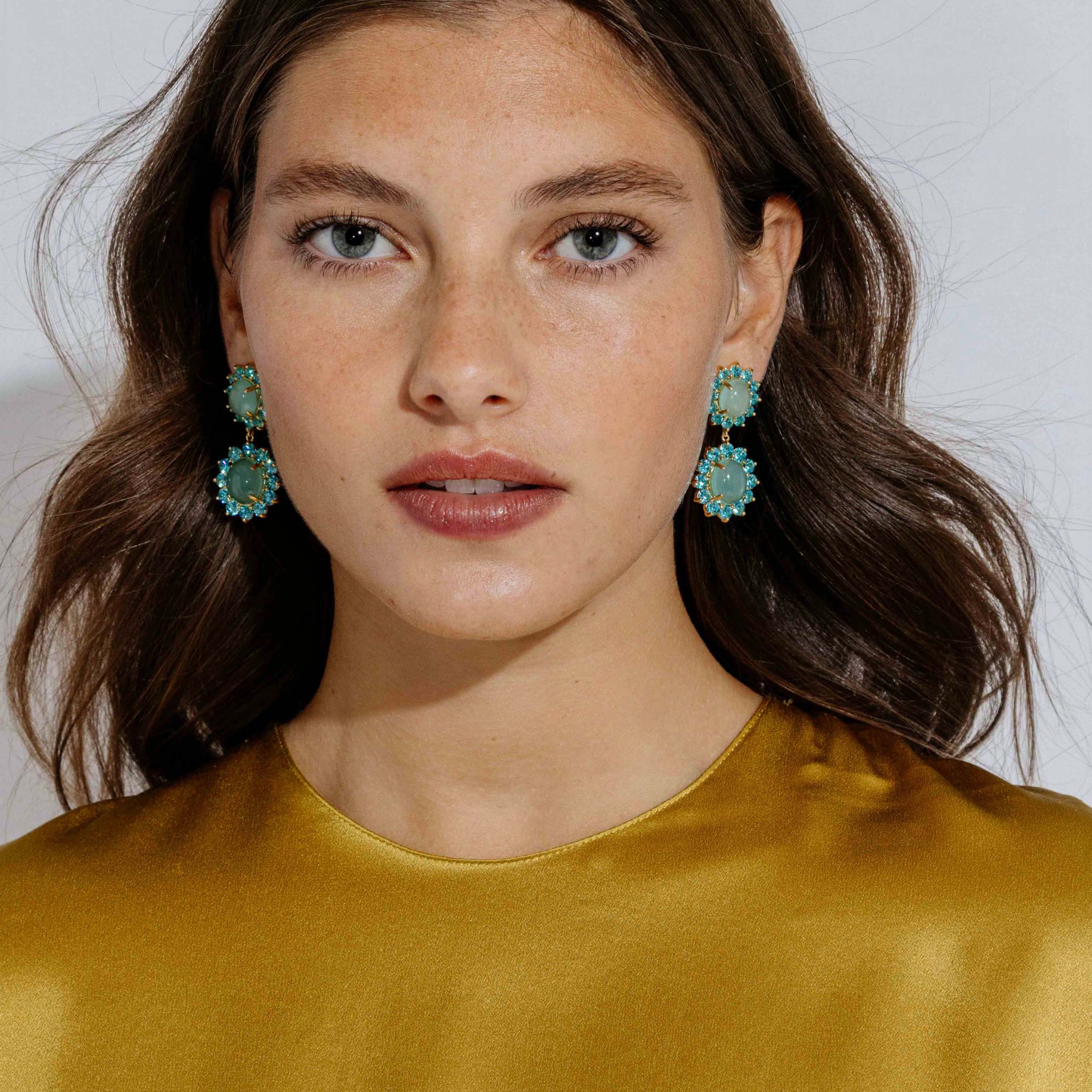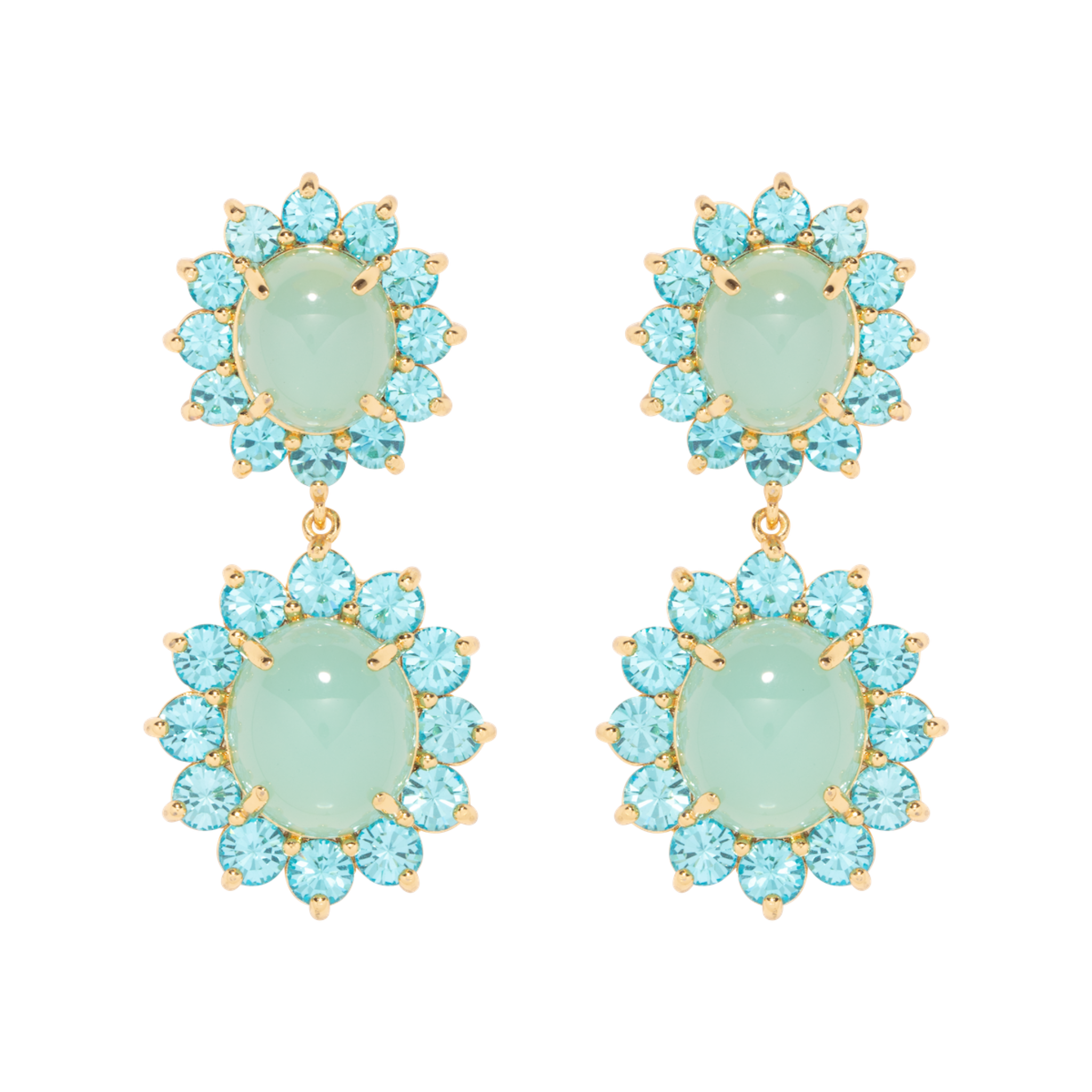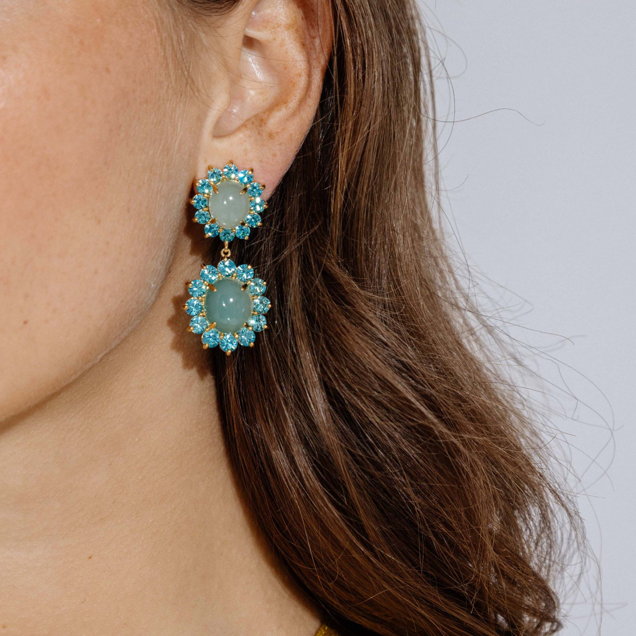 For a timeless style in a bold, monochrome pop, meet the Georgie Drop earrings. Two sets of cabochons framed with coordinating crystals dangle with ease and catch the light - ideal for turning heads on an evening out. Obsessed? Switch it up with the Georgie Studs for daily wear in the same vibe.