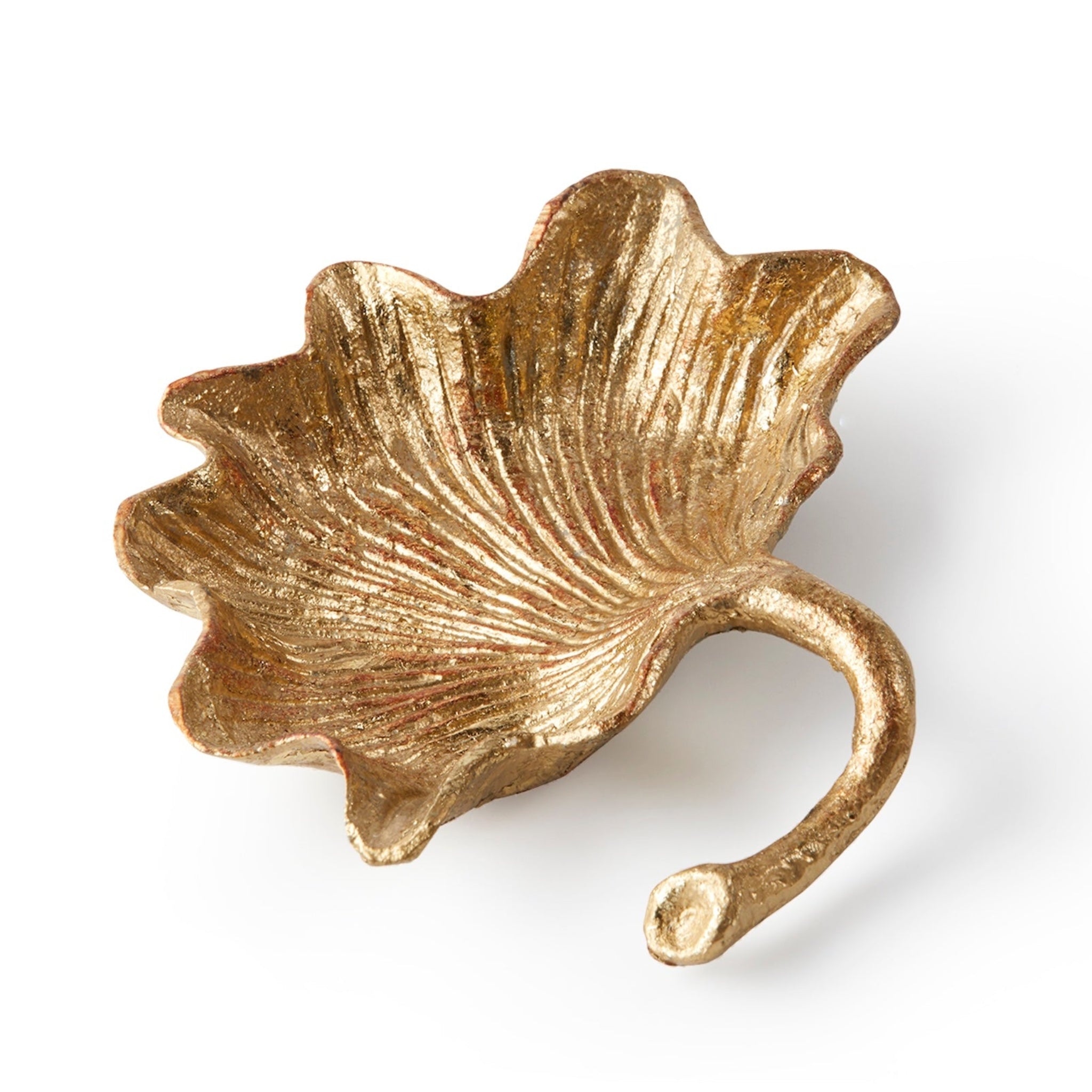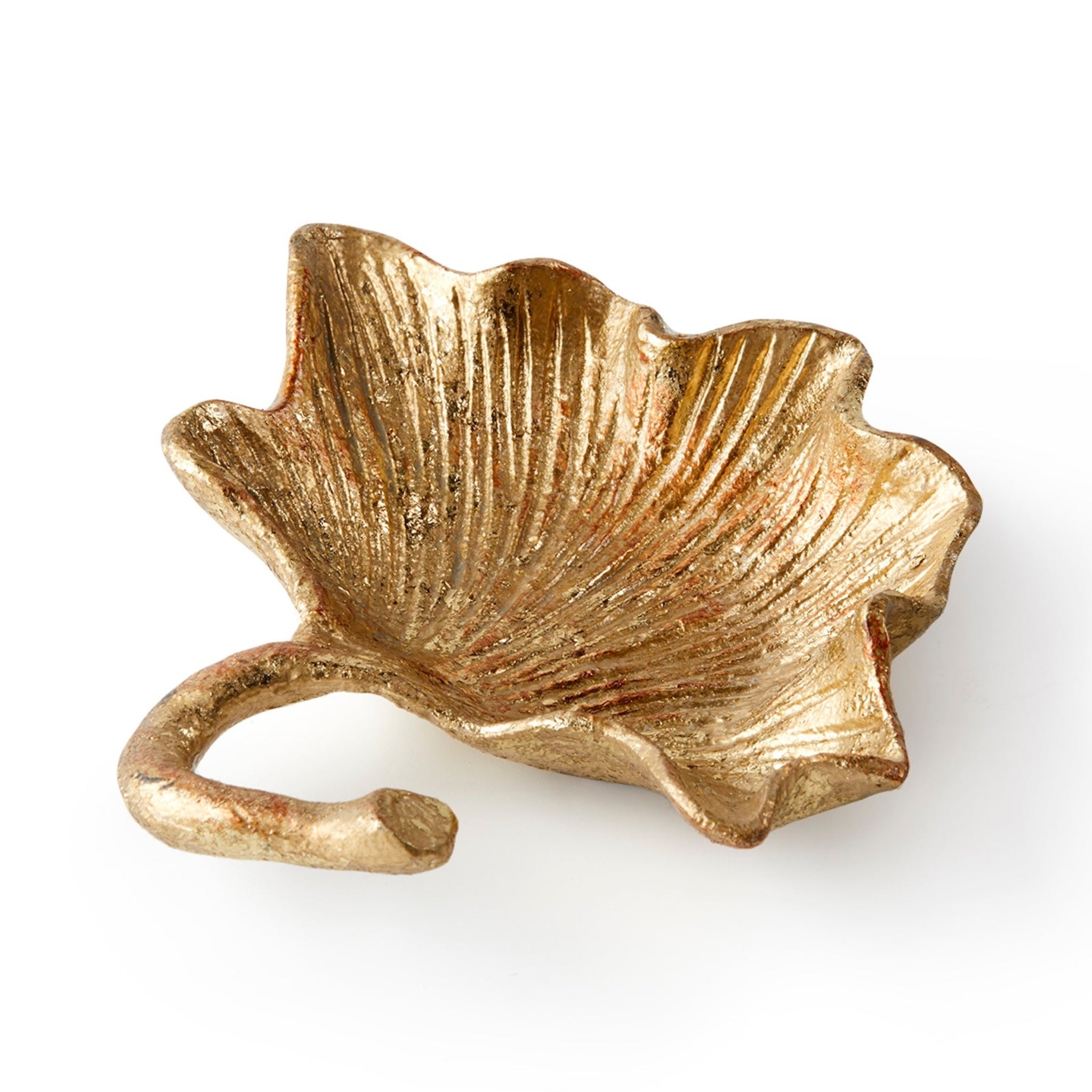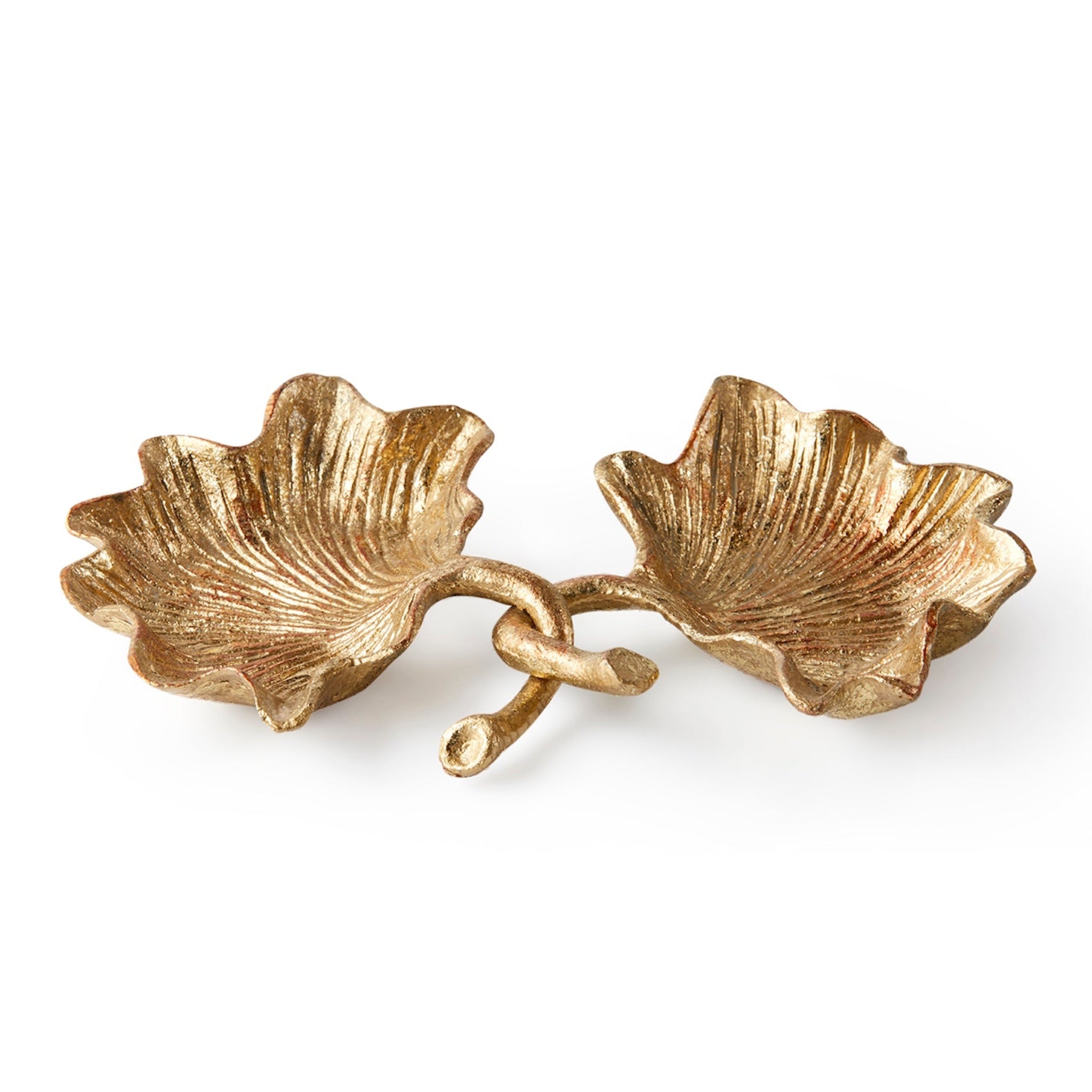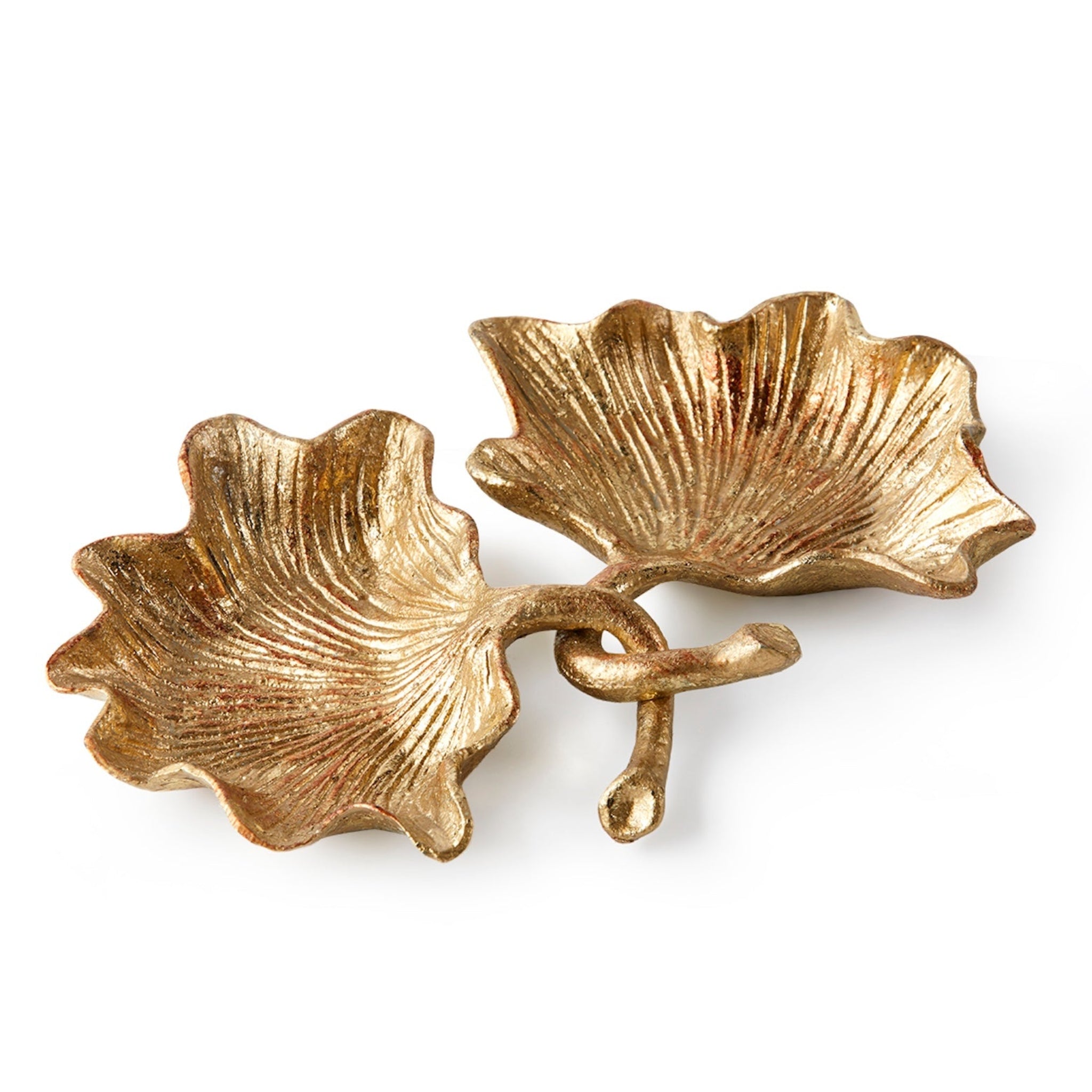 The Ginko Small Bowl Set of 2 features delicately sculpted, gold-leafed cast metal leaves with beautiful natural veining for an elegant, organic look. Use them individually or intertwined as a paired accent—perfect as decorative objets d’art or functional catchalls.