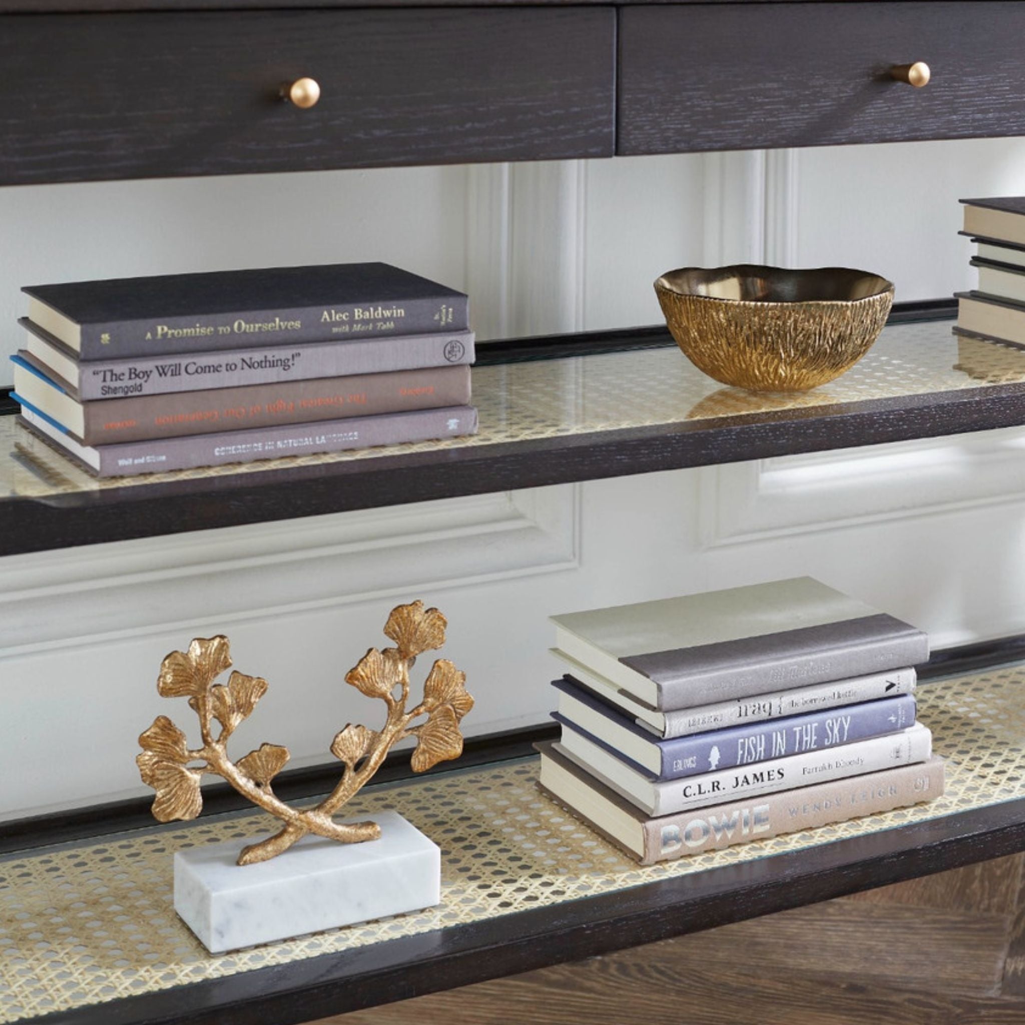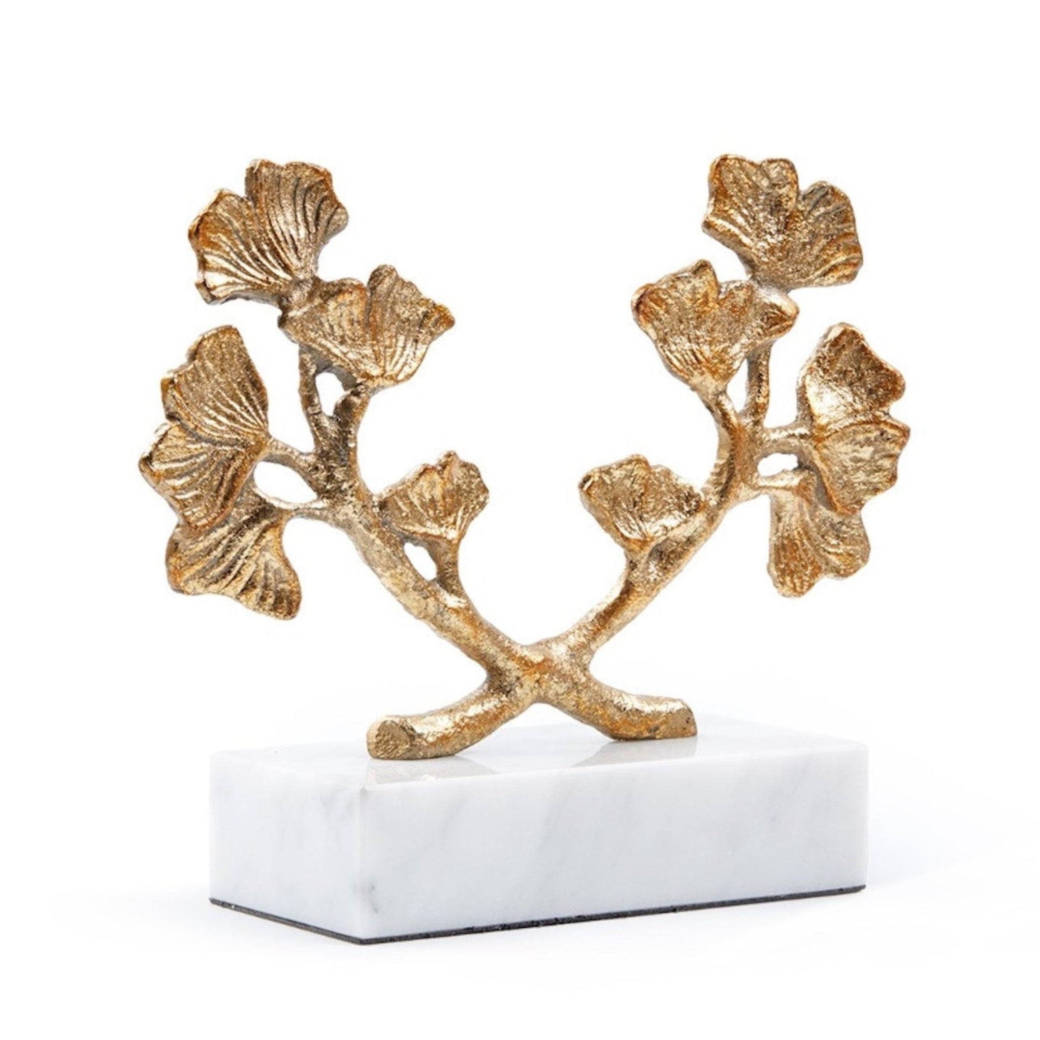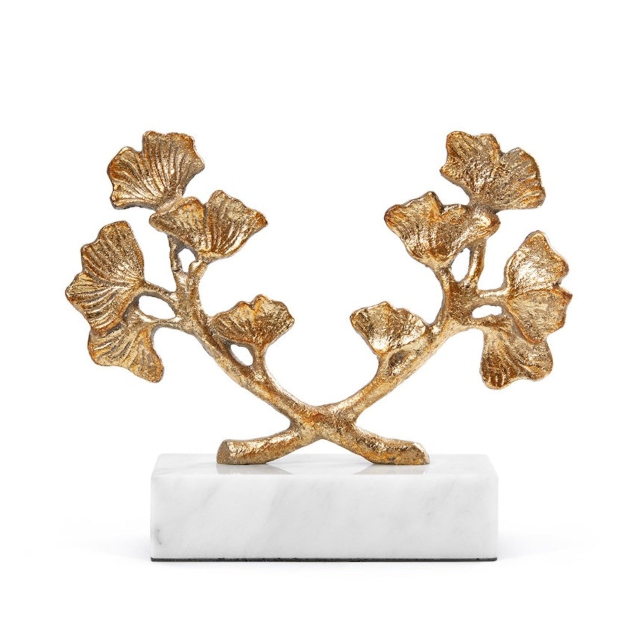 The Ginko Statue showcases two delicately sculpted ginkgo leaves finished in hand-applied gold leaf, beautifully mounted on a polished white marble base. Symbolizing resilience and longevity, it serves as an elegant standalone accent or a sophisticated pair of bookends.
