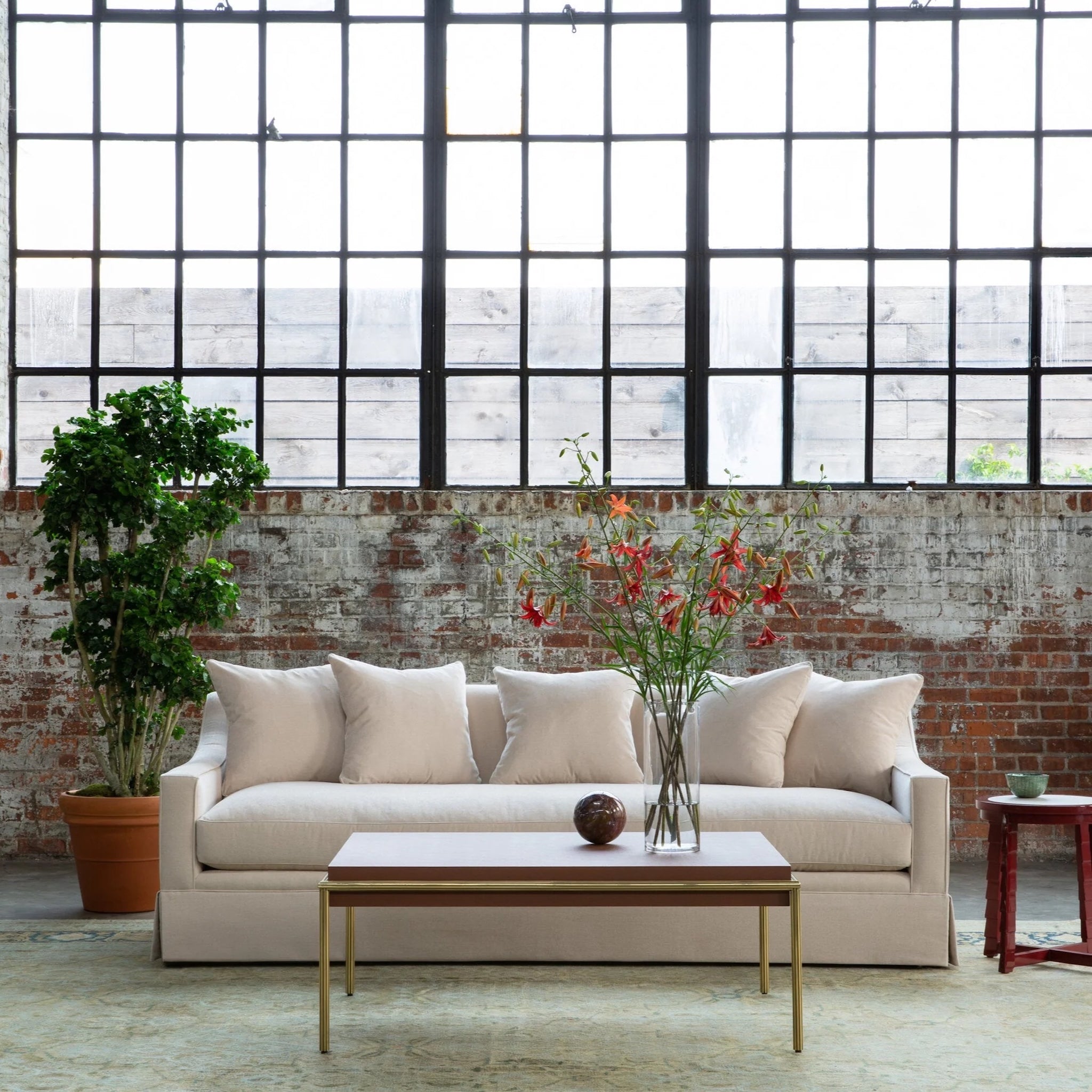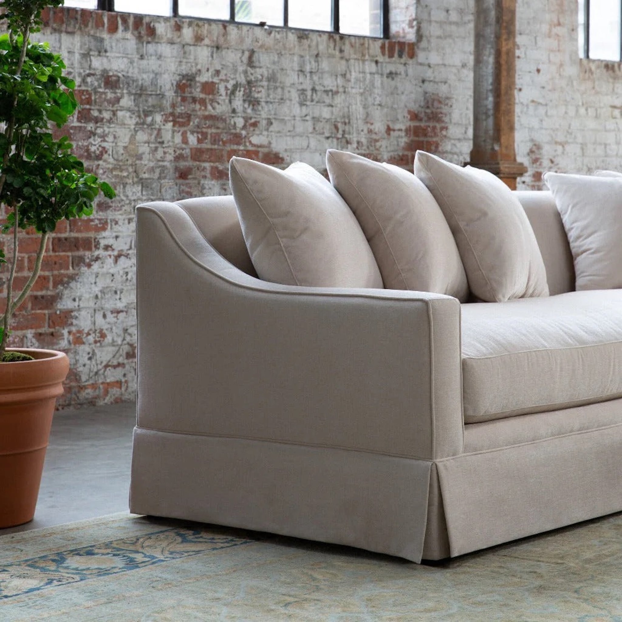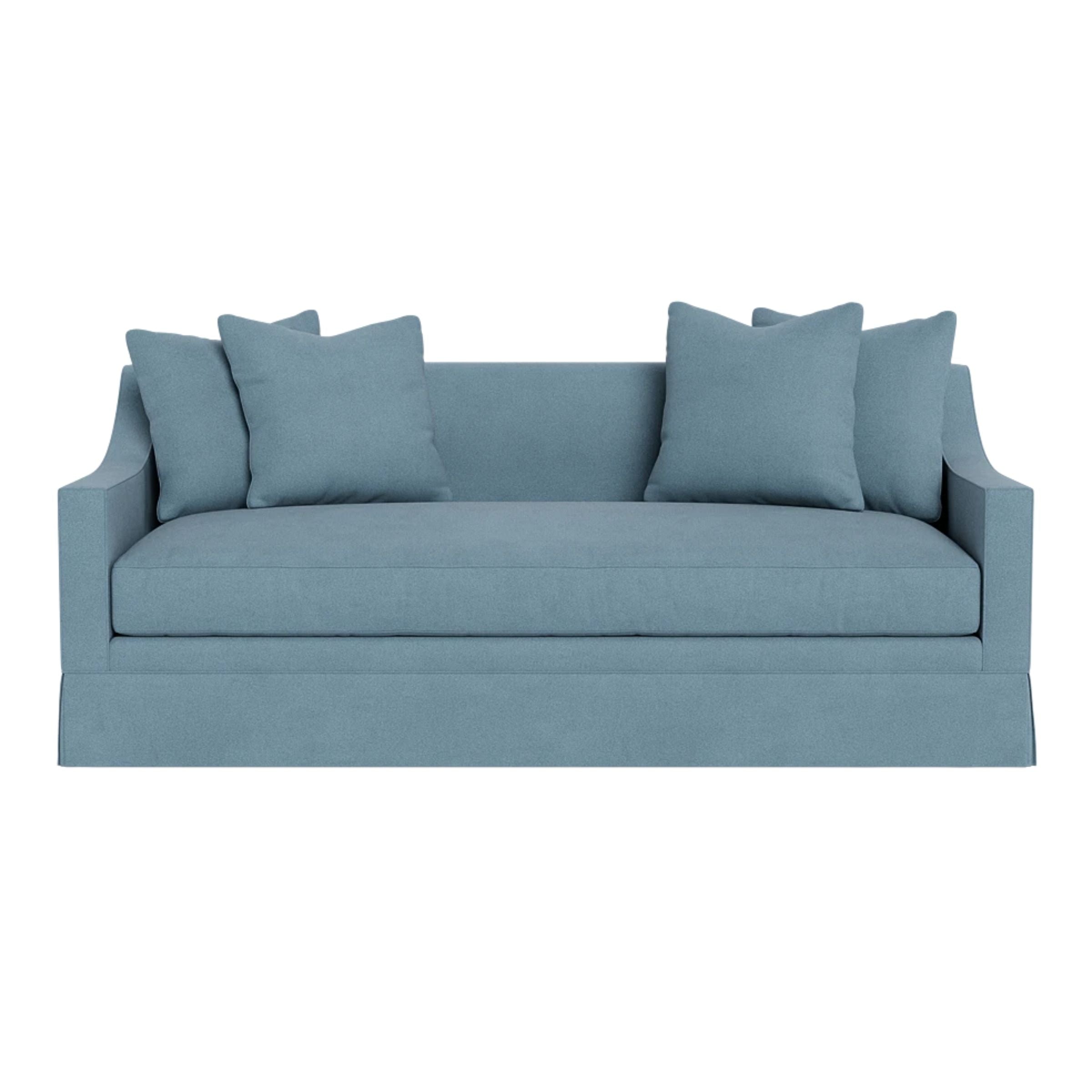 This handsome skirted sofa features sleek tailoring, sloped arms, and an extra-deep seat perfect for lounging. It offers a refined look and includes up to five matching loose 21" x 21" pillows for ultimate comfort.