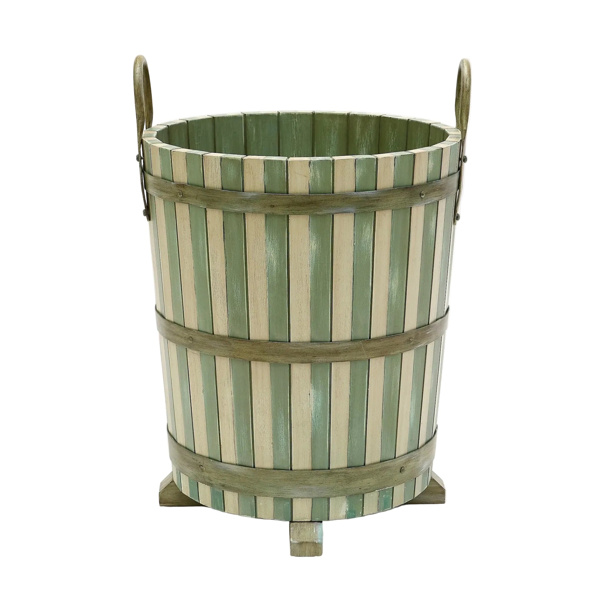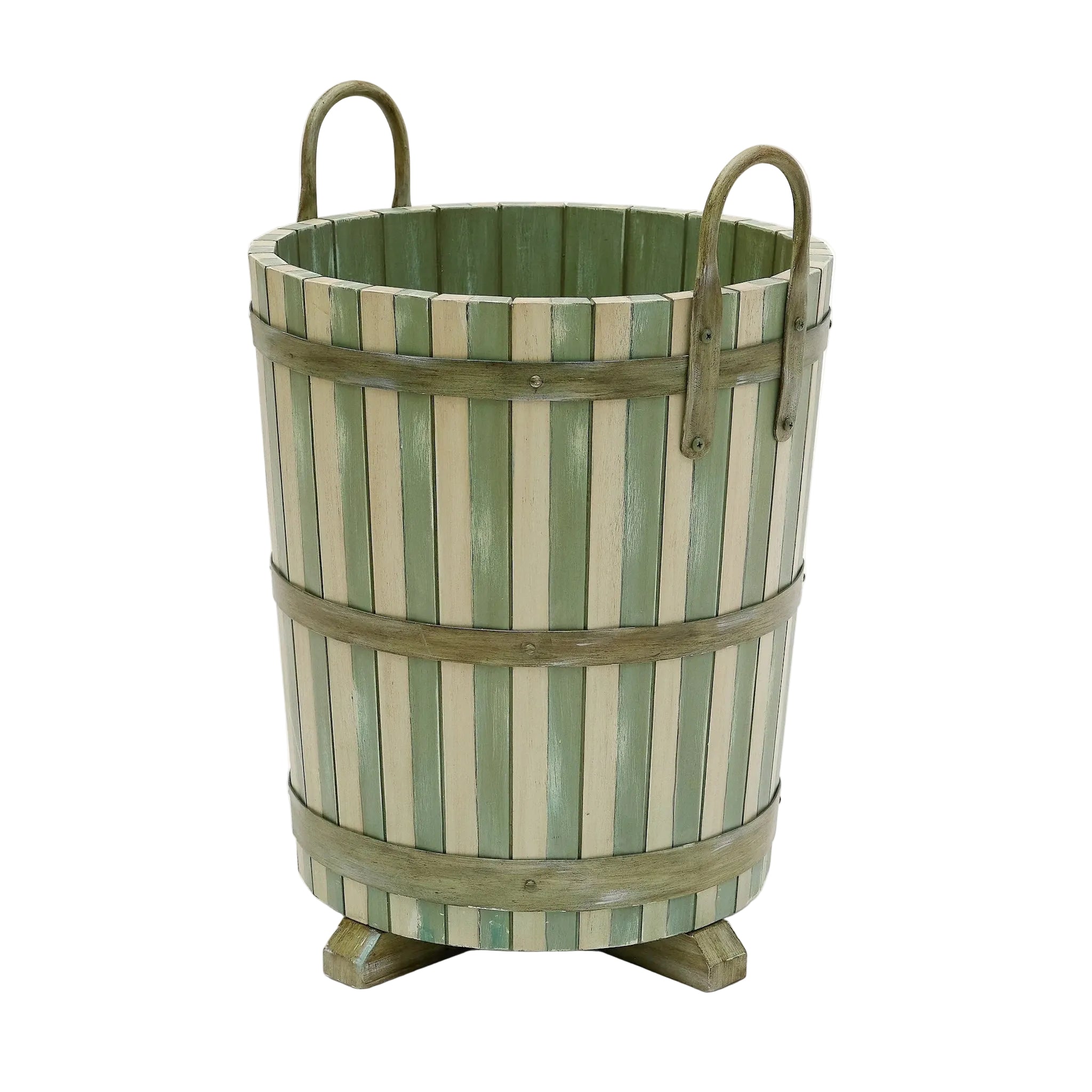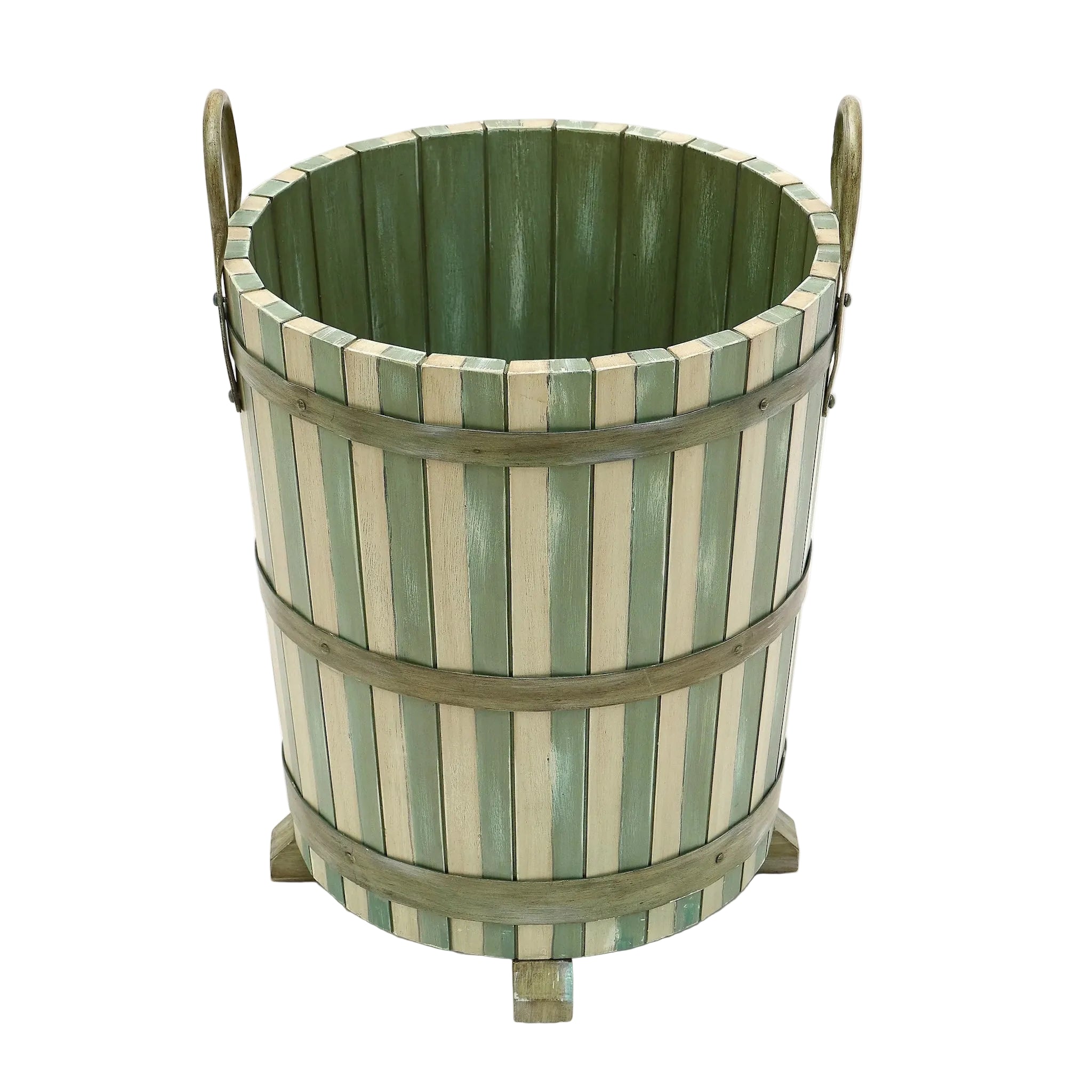 Inspired by style icon Deeda Blair, this barrel-shaped wooden planter features hand-painted gray and green stripes with aged metal straps and functional handles. It includes a custom aluminum insert designed for indoor use, providing a glamorous home for your favorite topiaries or citrus trees.
