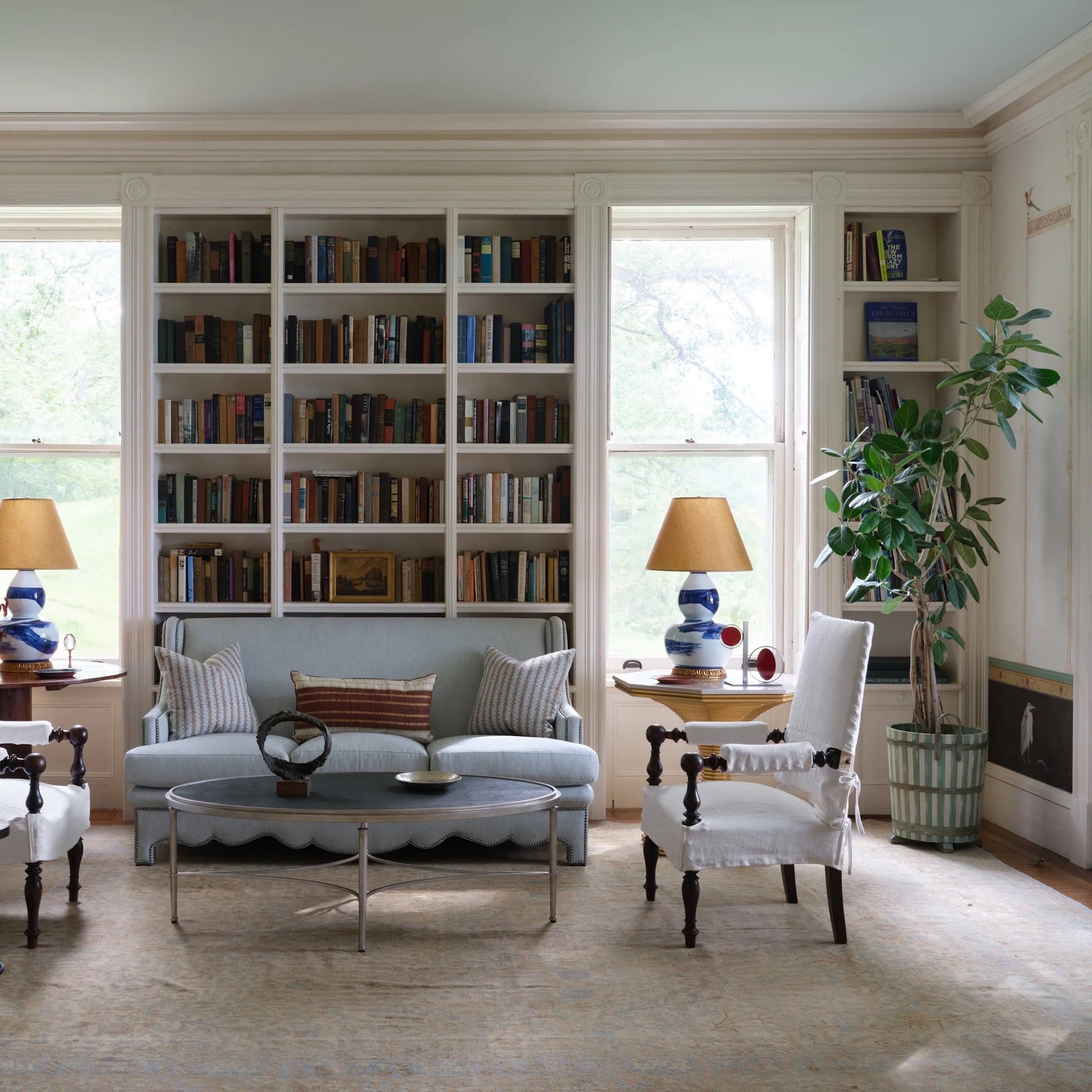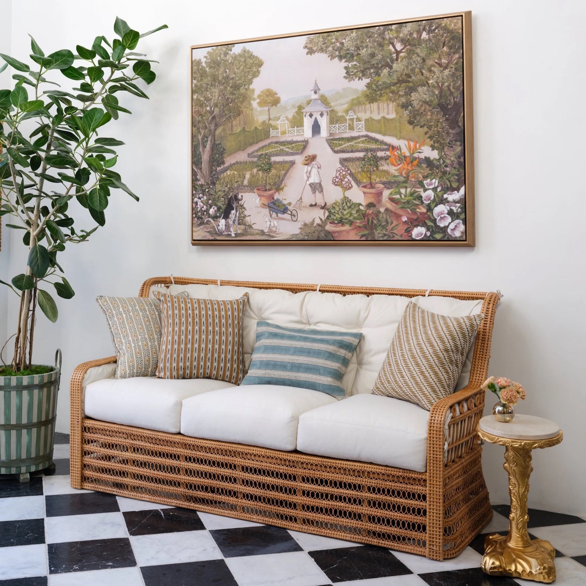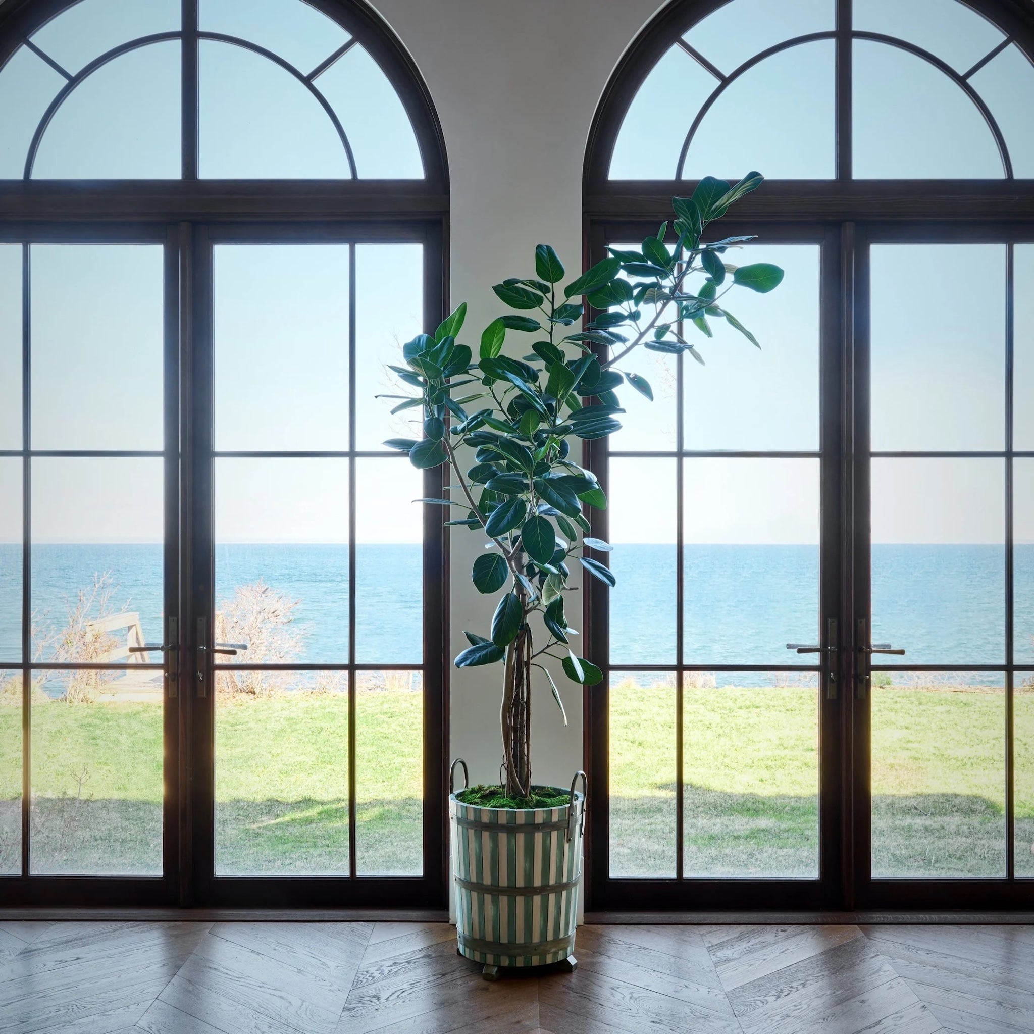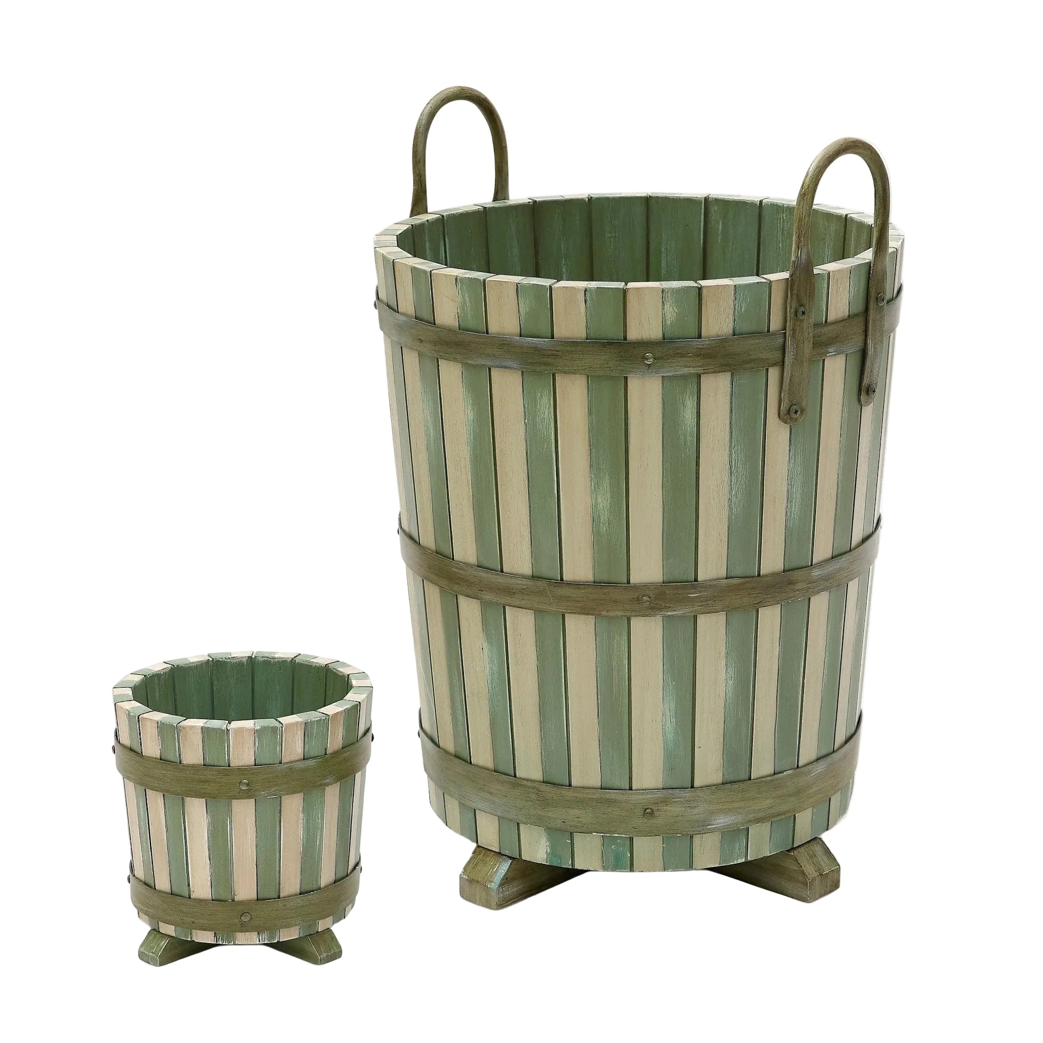 Inspired by style icon Deeda Blair, this barrel-shaped wooden planter features hand-painted gray and green stripes with aged metal straps and functional handles. It includes a custom aluminum insert designed for indoor use, providing a glamorous home for your favorite topiaries or citrus trees.