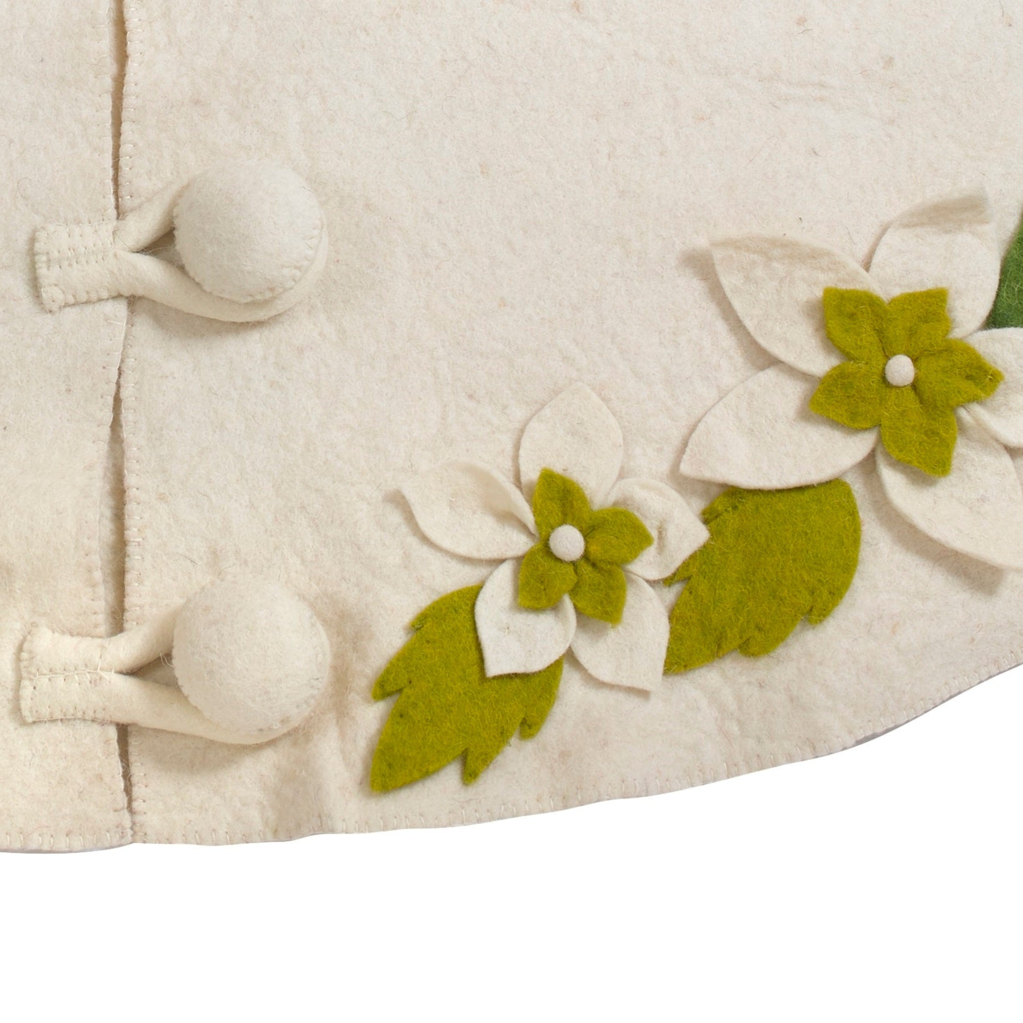 A wonderful display of greenery decorates this lovely tree skirt. Ferns, flowers, and fronds form an elegant border, and five oversized felt buttons secure closure in style.