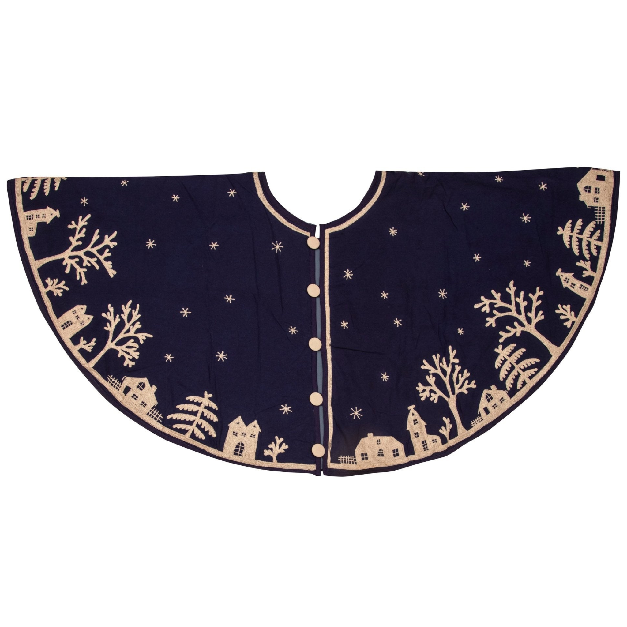A lovingly embroidered snowy village scene silhouette is set against a navy blue  background on this lovely tree skirt. Its peaceful, cozy winter vibes will fill the whole room. Uniquely pretty and tidy button closure. Cotton with crewel embroidery. Each design is as unique as the artisan who creates it. The artisans are experts in their craft - creating the heirloom of tomorrow.