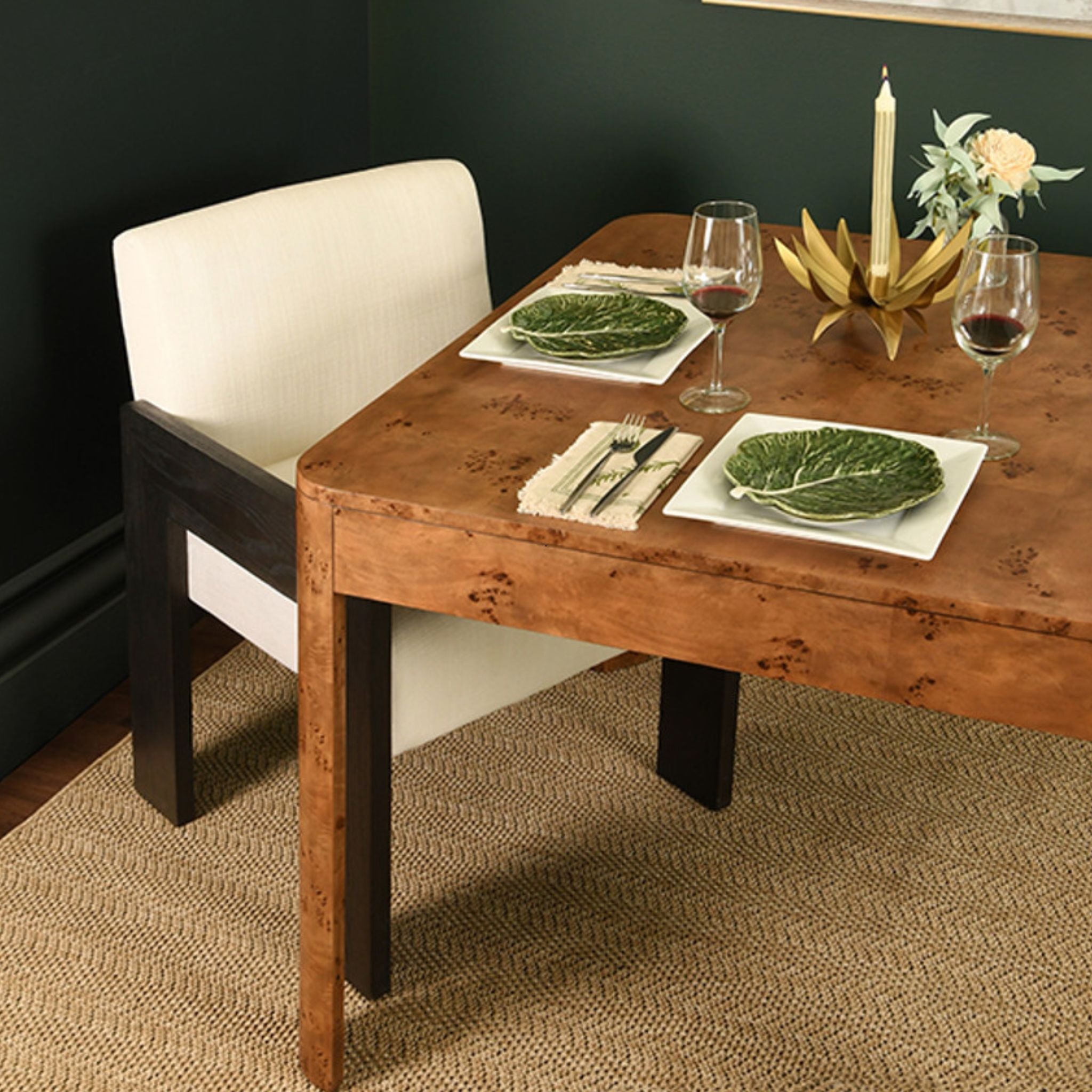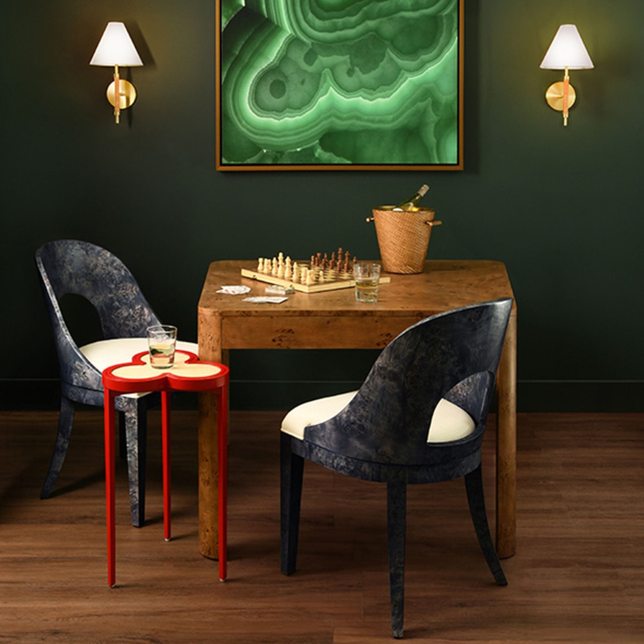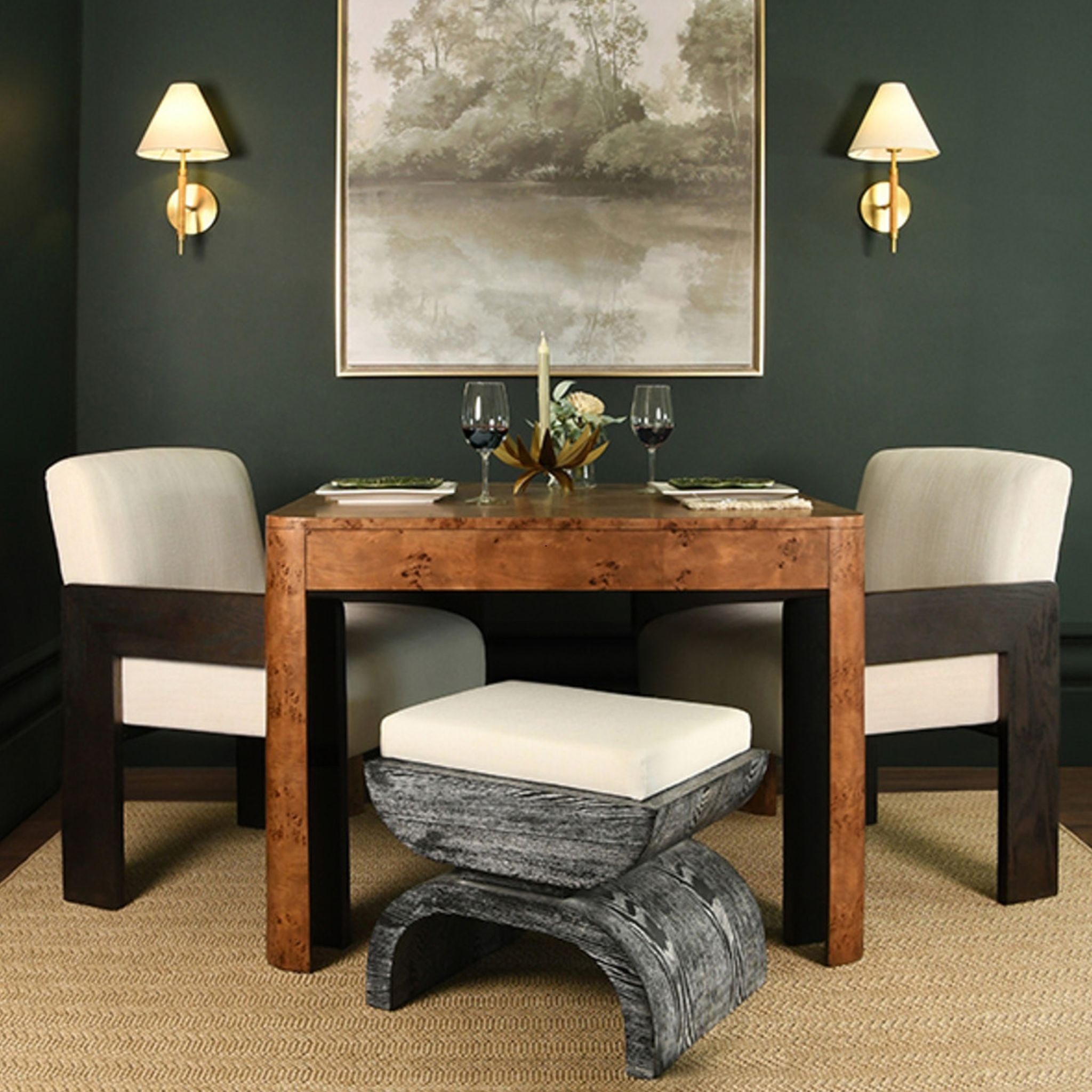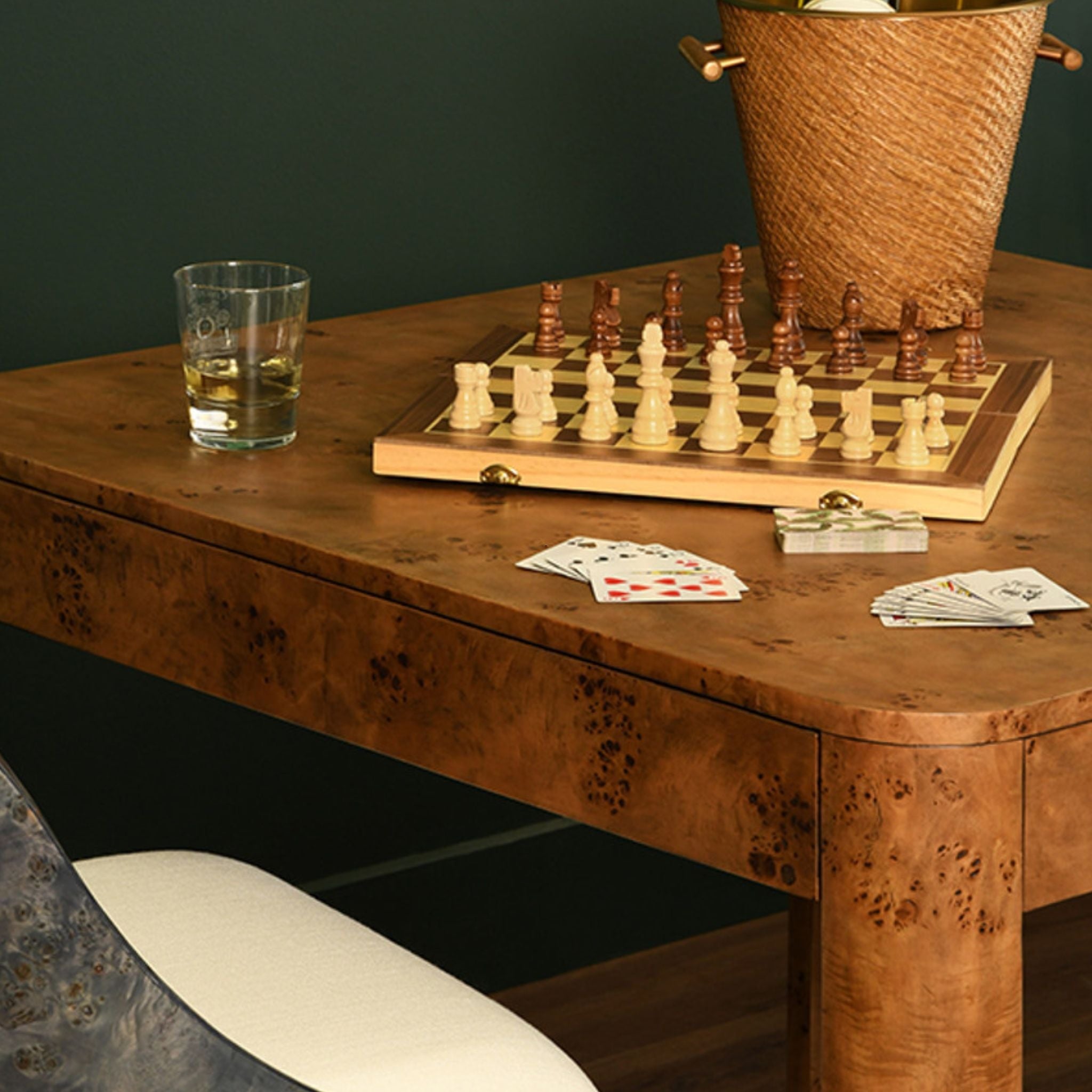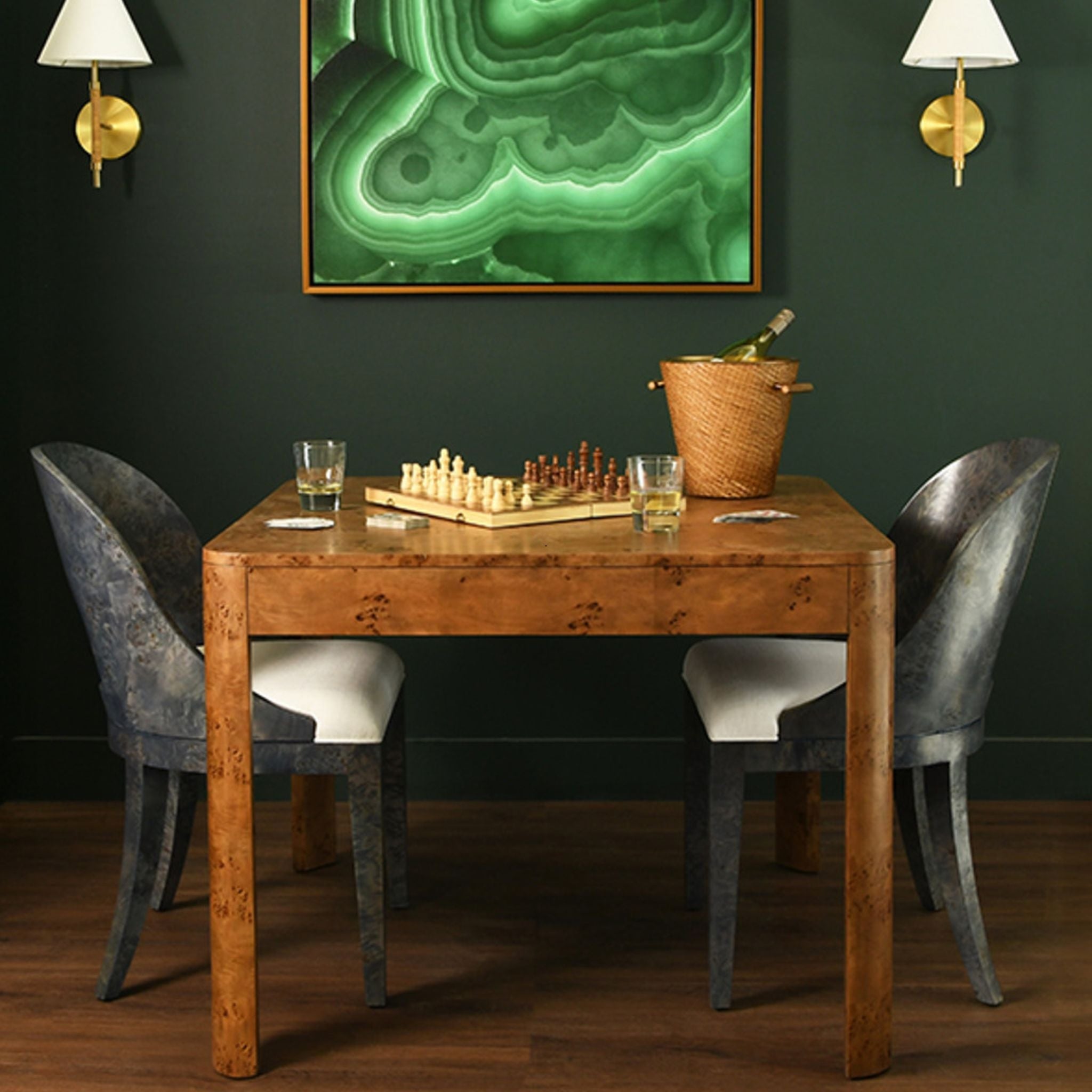 The Jett Game Table features a sleek square design with gently curved corners, crafted in rich dark burl wood for a sophisticated look.