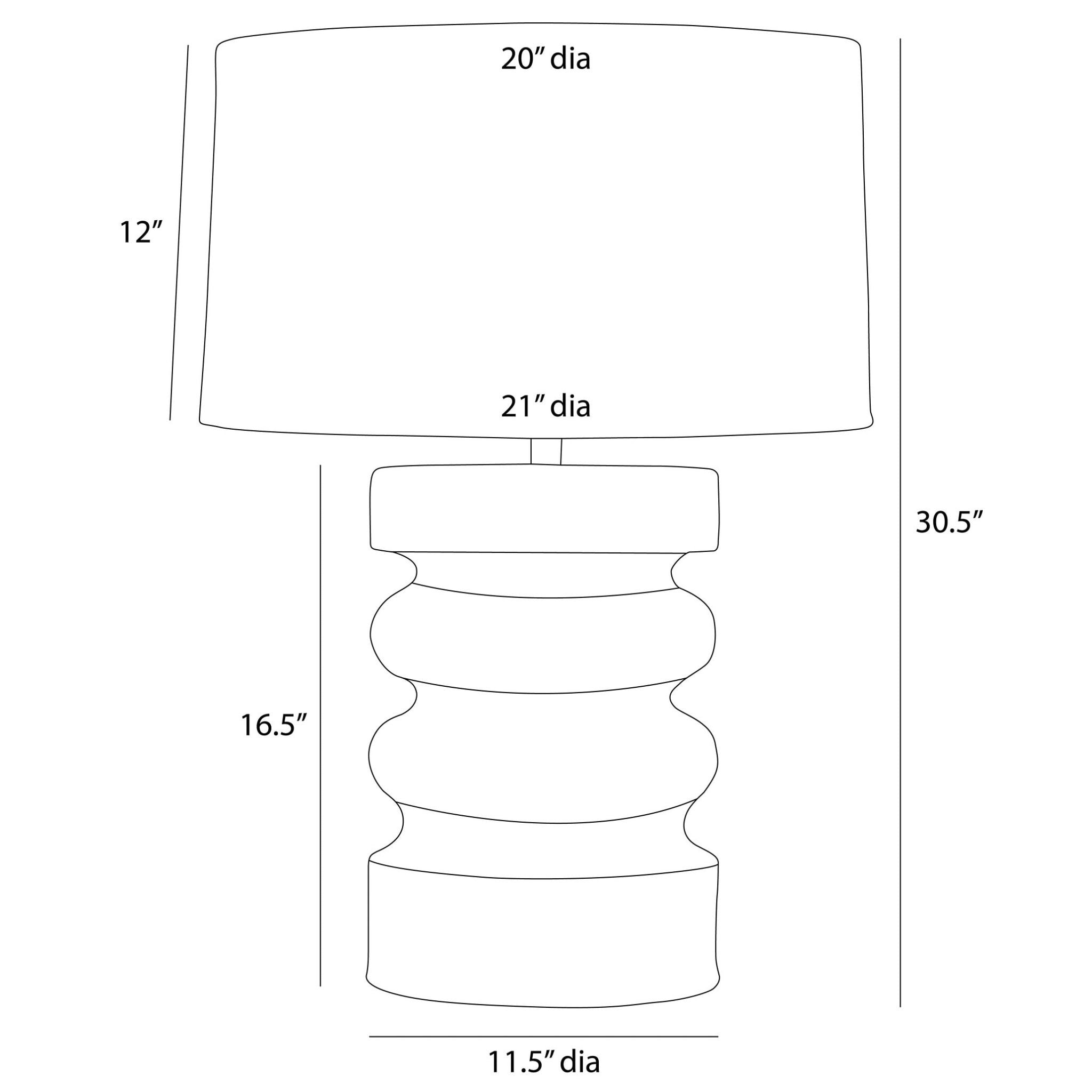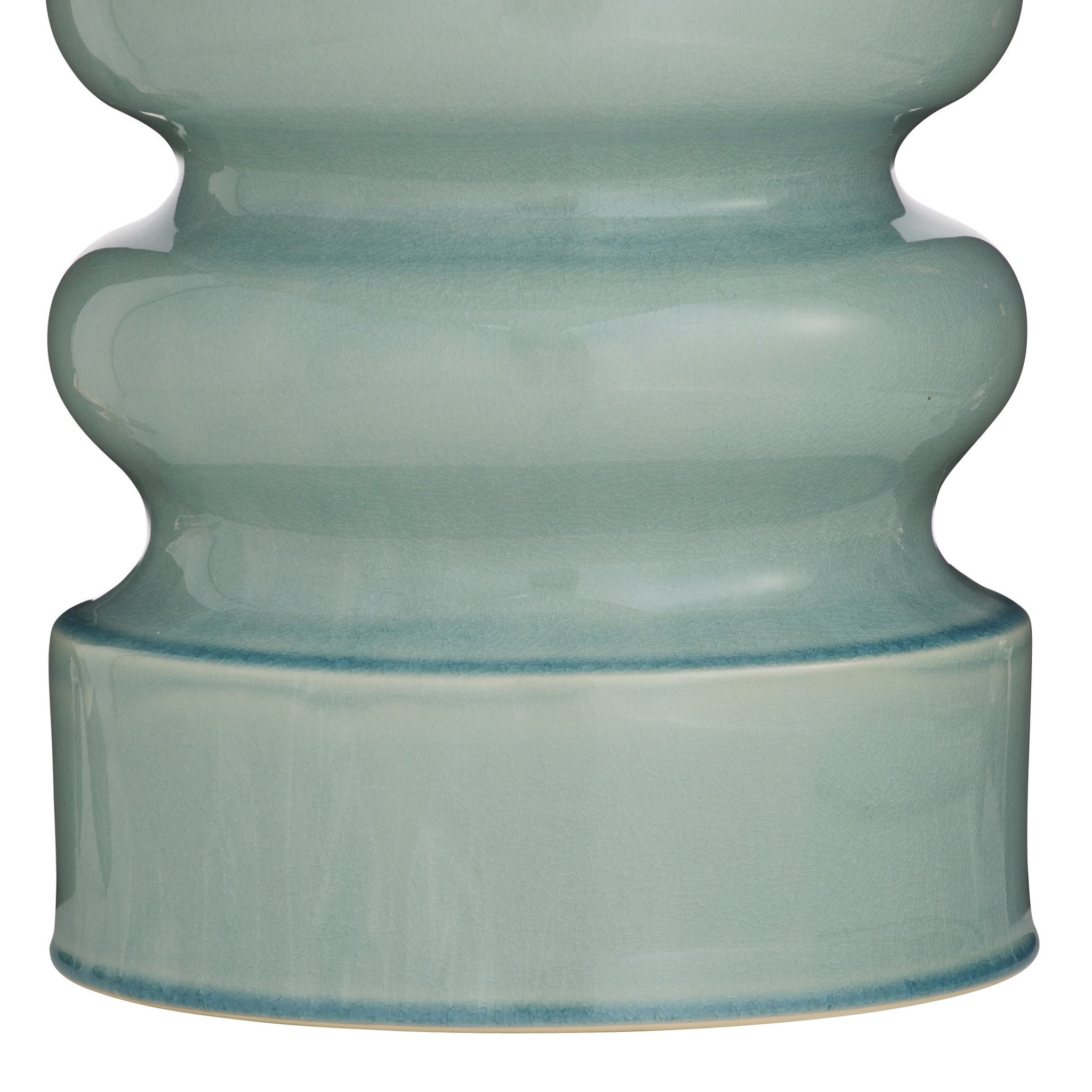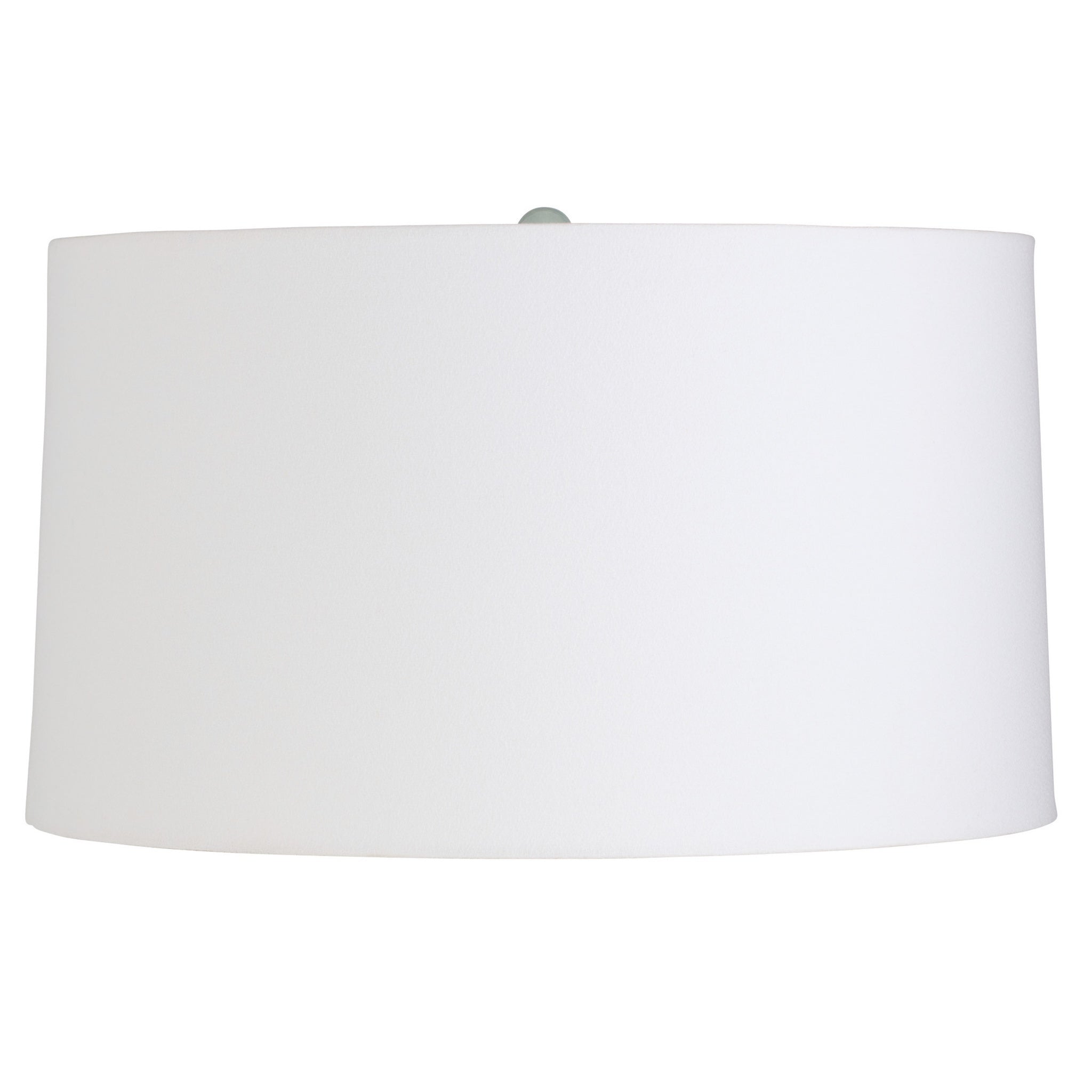 This oversized porcelain lamp features a graceful, undulating silhouette finished in a serene celadon glaze. It’s topped with a white linen drum shade lined in crisp white cotton and accented with an antique brass sphere finial.