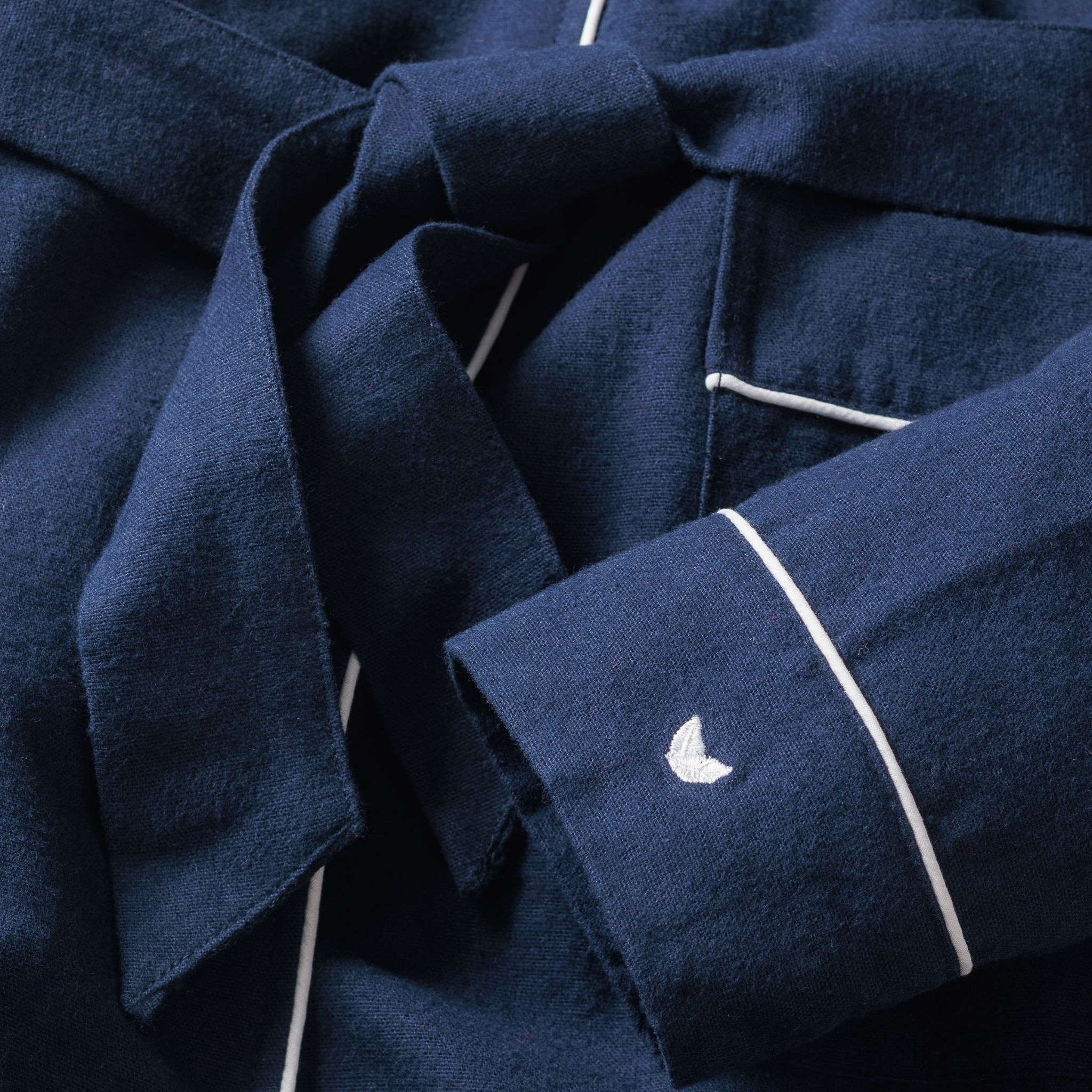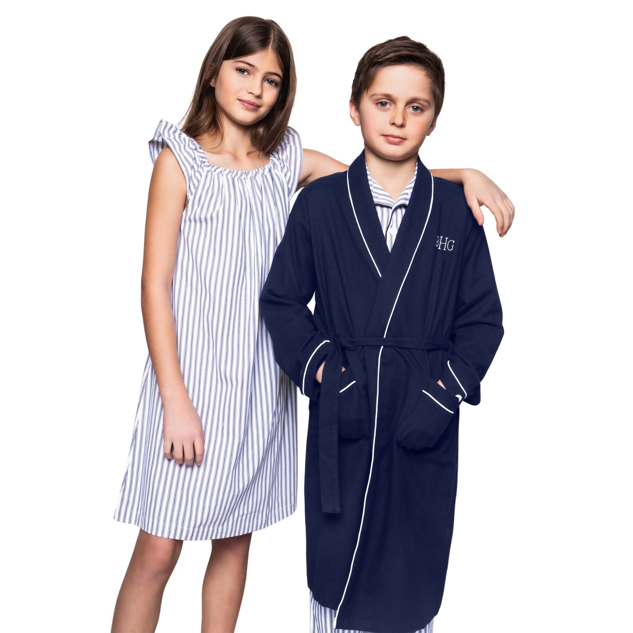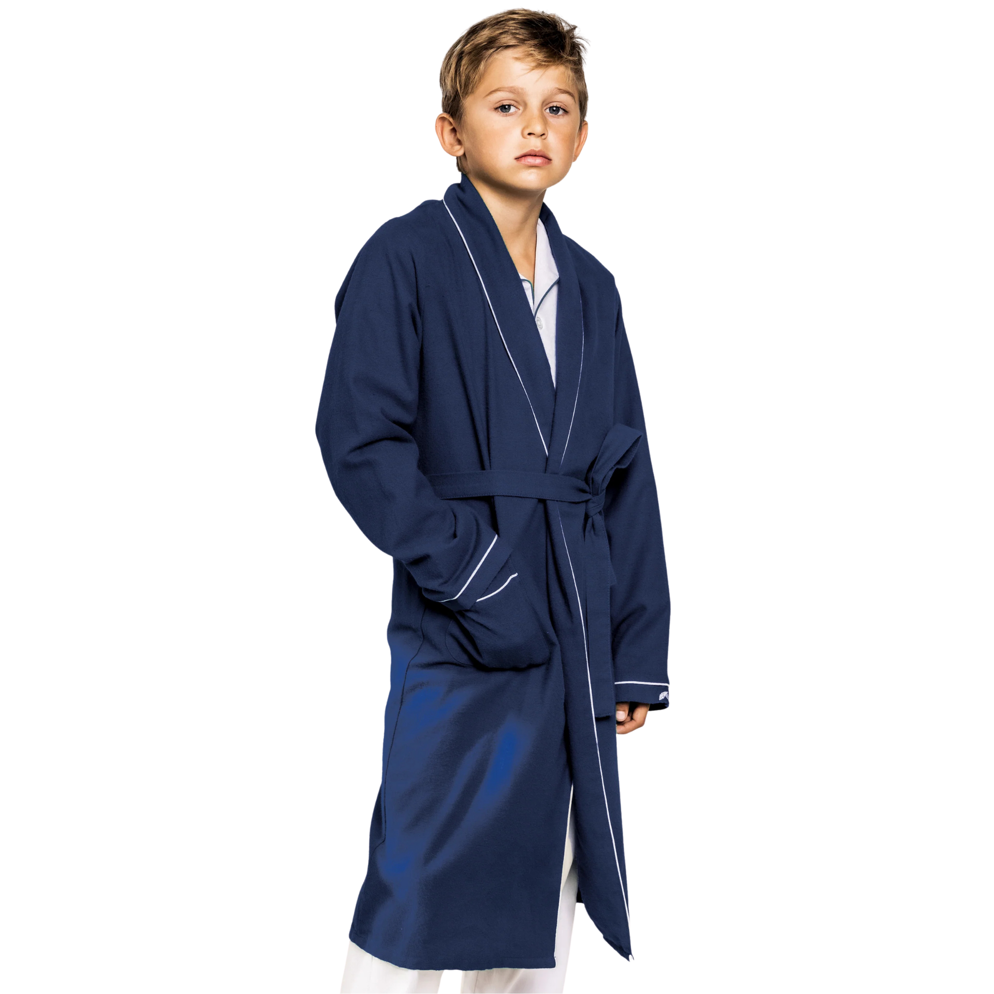 Classic and cozy, this Kid's Navy Flannel Robe is crafted from soft, brushed cotton flannel for ultimate comfort. Featuring crisp white piping, a shawl collar, adjustable tie belt, and roomy front pockets, it's perfect for relaxing mornings and bedtime routines. The deep navy hue adds a timeless, polished look.