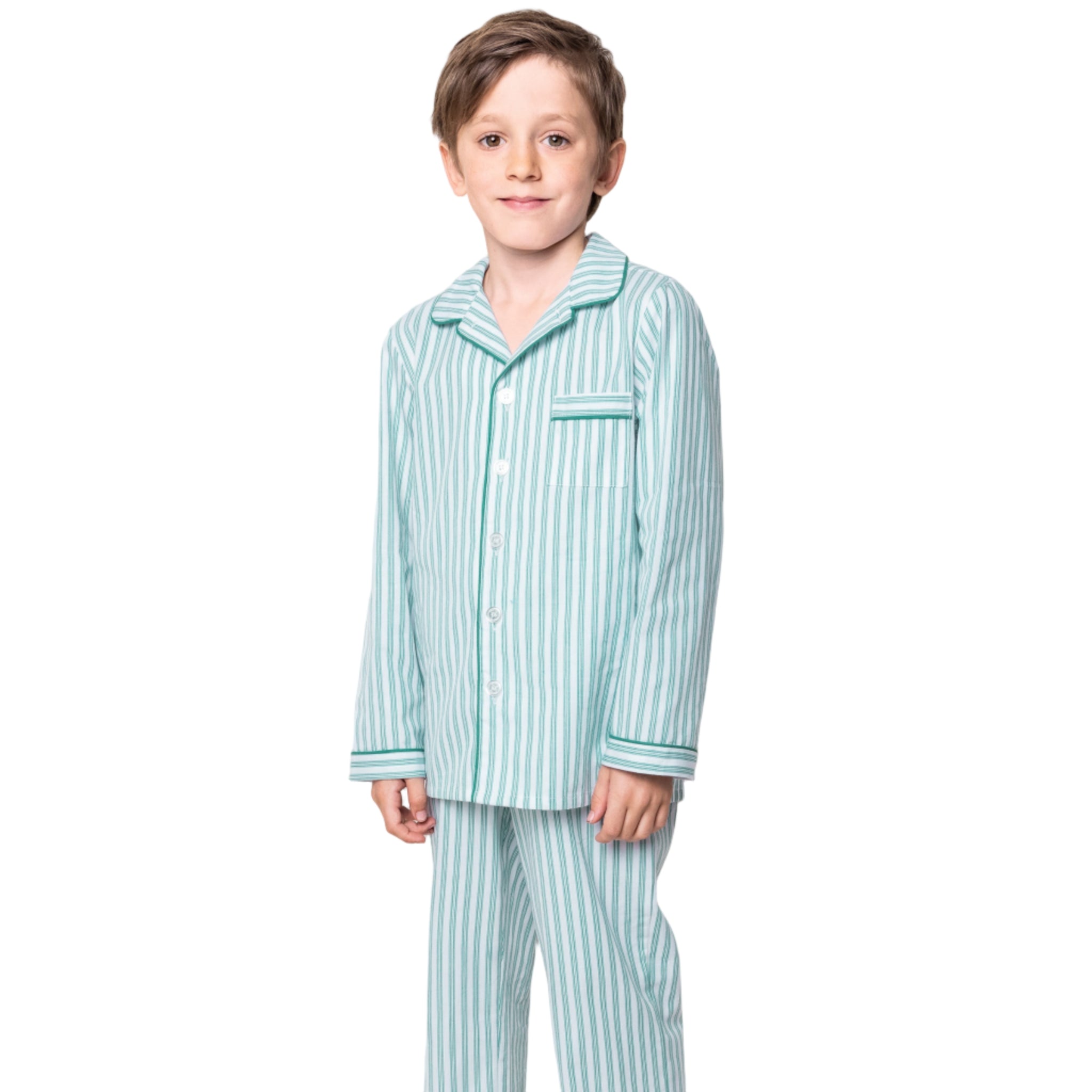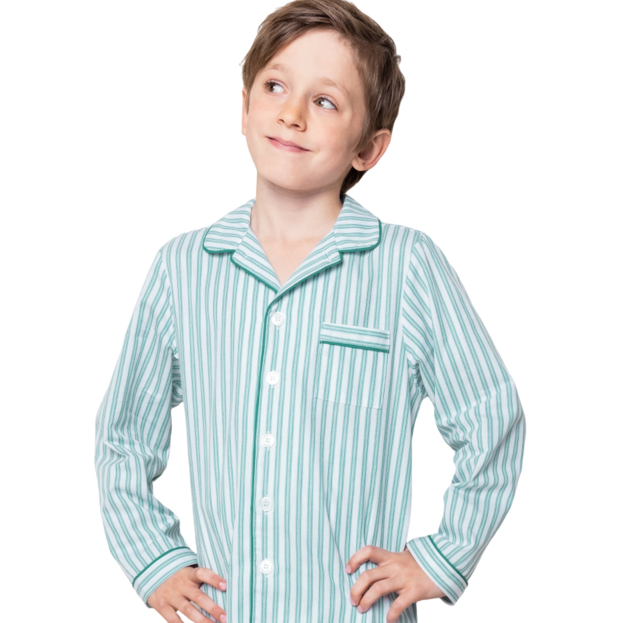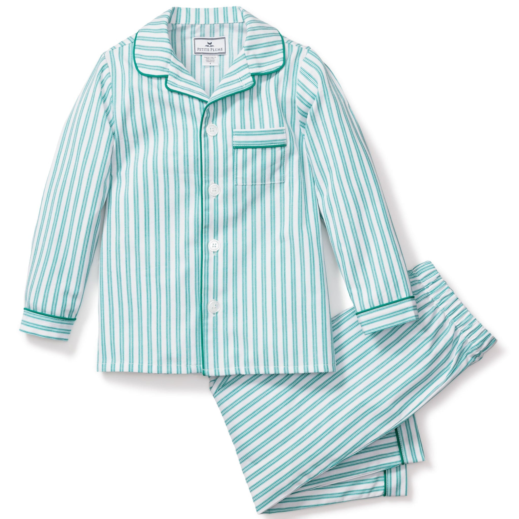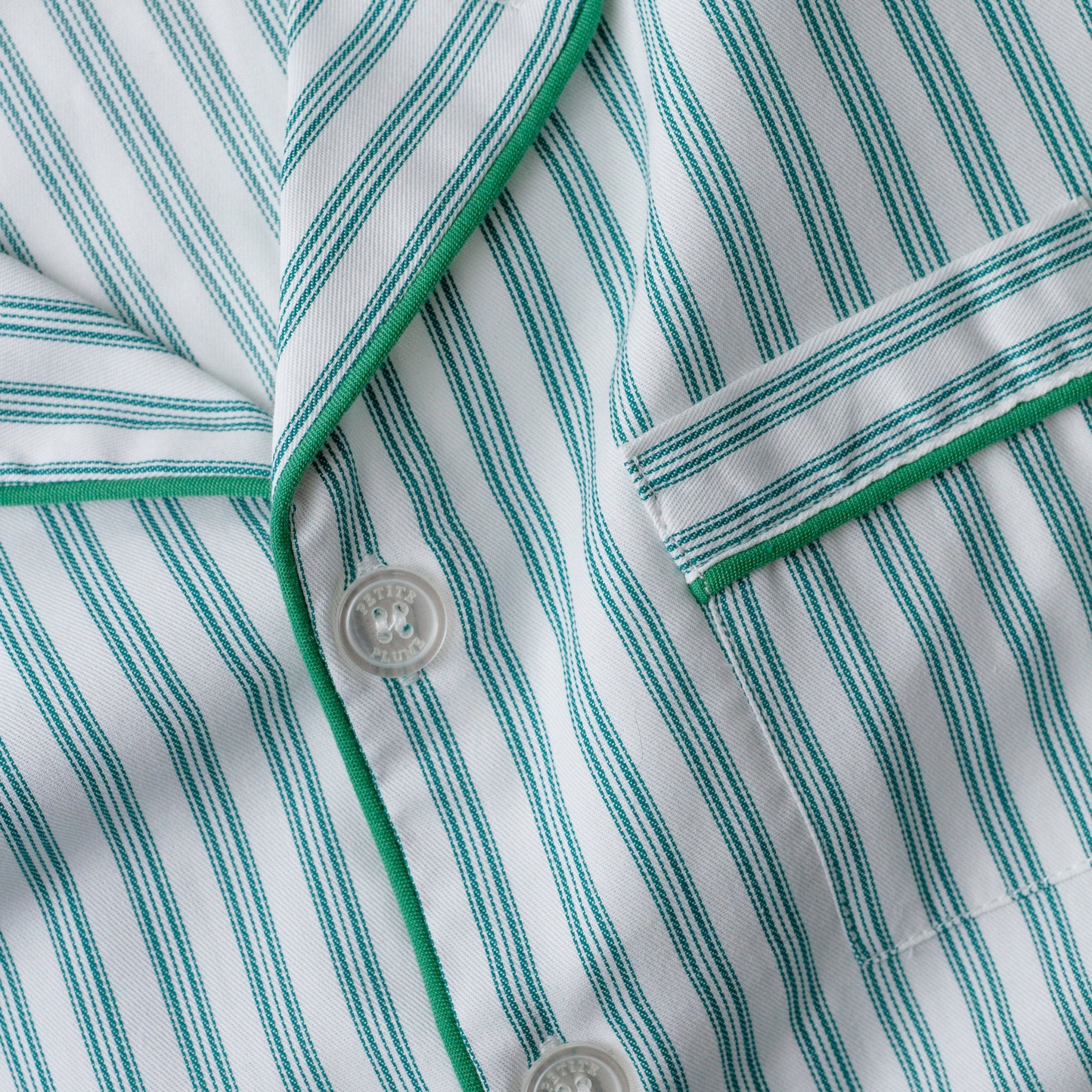 Our classic French ticking pattern takes on a new seasonal hue in a lush, deep green that channels the color of evergreen trees. The versatility of this print allows seamless transition from bedtime to holiday festivities in a snap. The classic twill pajama set is accented with green piping and finished with pearl buttons. The sleepwear is made from the finest quality yarn-dyed cotton and blended with just enough inherently flame retardant fiber to allow it to pass strict CPSC flame retardant laws without using harmful chemicals. This set gets cozier after each wash.