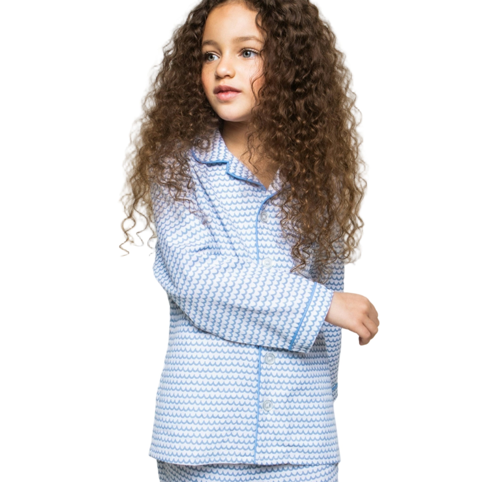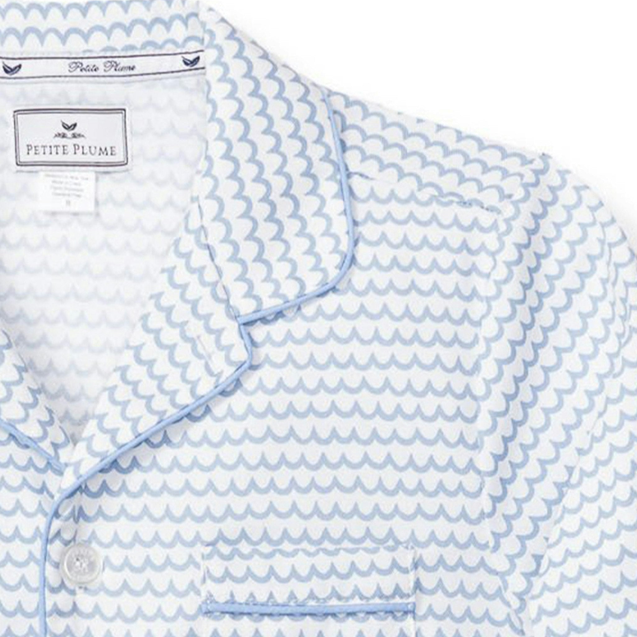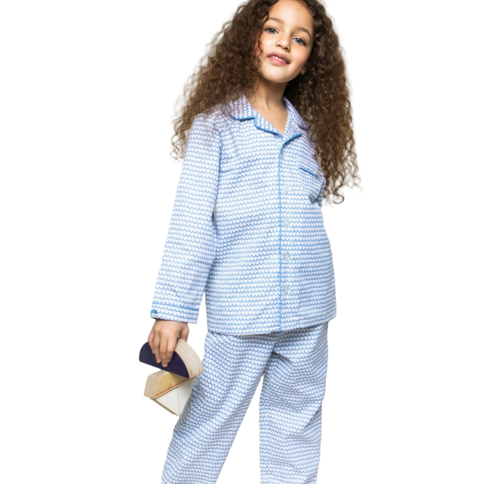 This classic, clean-lined pajama set is an instant keepsake to pass down for generations. The twill design is comfortable and durable, with sweet touches like logo buttons and crisp piping. Colors stay true after multiple washes, so you can rest easy knowing it'll remain a wardrobe favorite. Petite Plume debuted the world's first chemical-free, flame-retardant fabric for children's sleepwear. Fine yarn-dyed cotton is blended with a touch of inherently flame-retardant fiber to pass strict CPSC safety laws without relying on harmful additives. The fabric is brushed for added softness and grows cozier with every wash, letting little ones snuggle up safe and sound. Your little one will be tucked in love and off to dreamland.