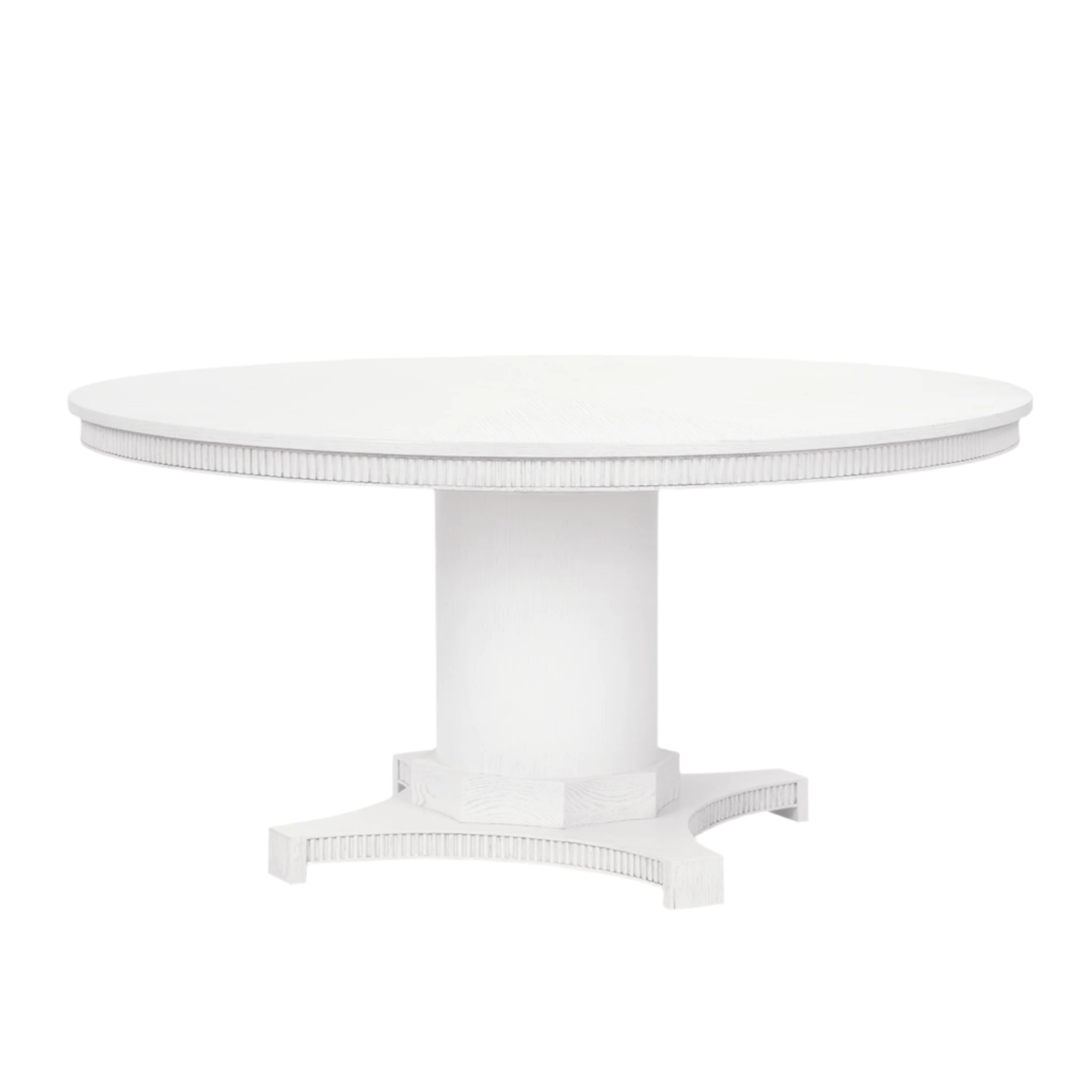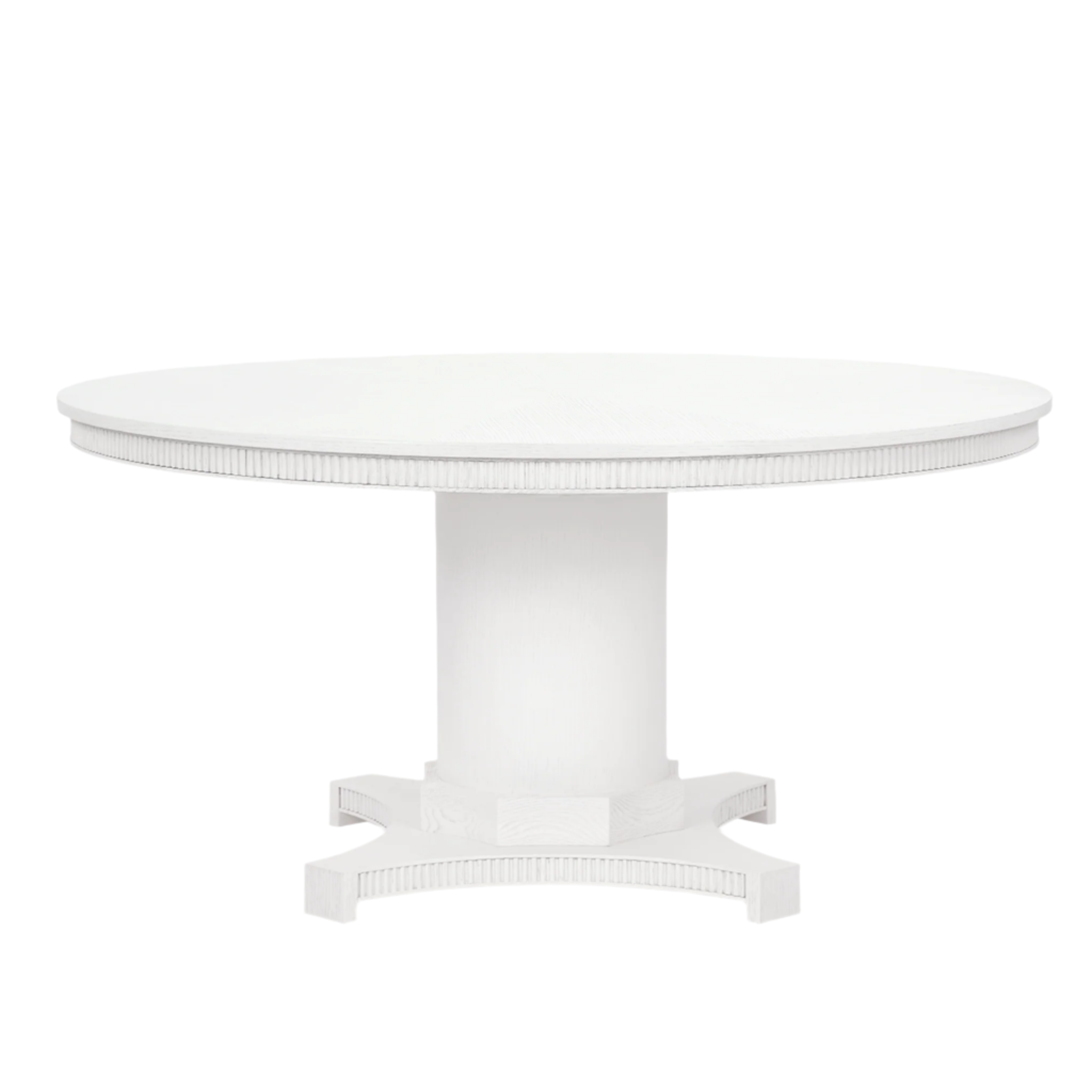 The Kinsley Dining Table is a masterful blend of bold proportions and timeless elegance. Crafted from oak, its round silhouette features grooved details on the apron and base. The subtly neo-classical shape strikes the perfect balance between traditional craftsmanship and modern versatility. The curved octagonal detailing around the base of the central column is a standout feature, adding a touch of architectural refinement. Finished to highlight the natural oak grain with a lustrous white sheen, this table exudes sophistication. It is equally at home in traditional, contemporary, or transitional interiors, making the Kinsey Dining Table a versatile centerpiece that enhances any dining space.