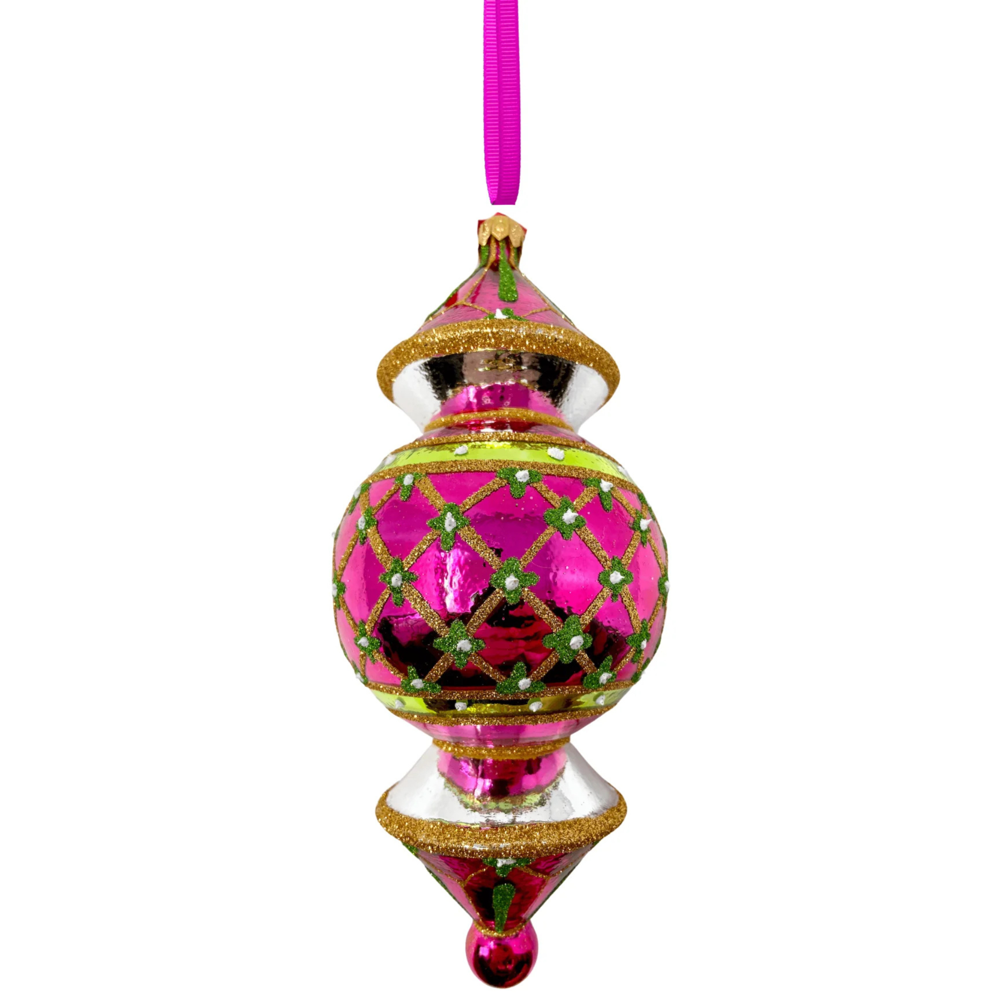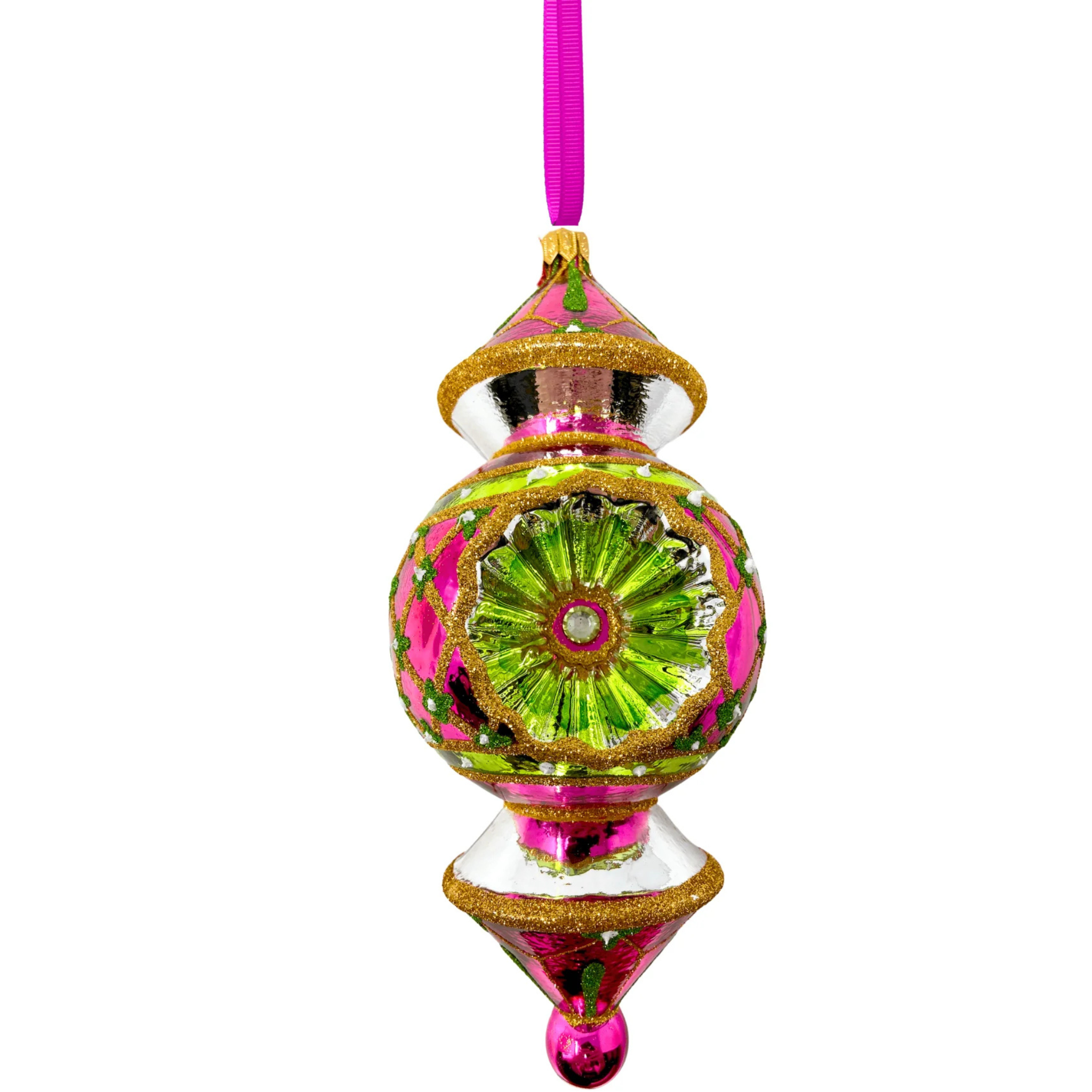 This eye-catching pink reflector glass ornament is a dazzling blend of color and sparkle, designed to be the star of your holiday décor. The ornament’s vibrant pink base is beautifully criss-crossed with bold lime and gold lines, creating a dynamic and striking pattern. Tiny starbursts, reminiscent of paparazzi flashbulbs, surround the center, catching the light with every movement and adding a burst of radiant shine.