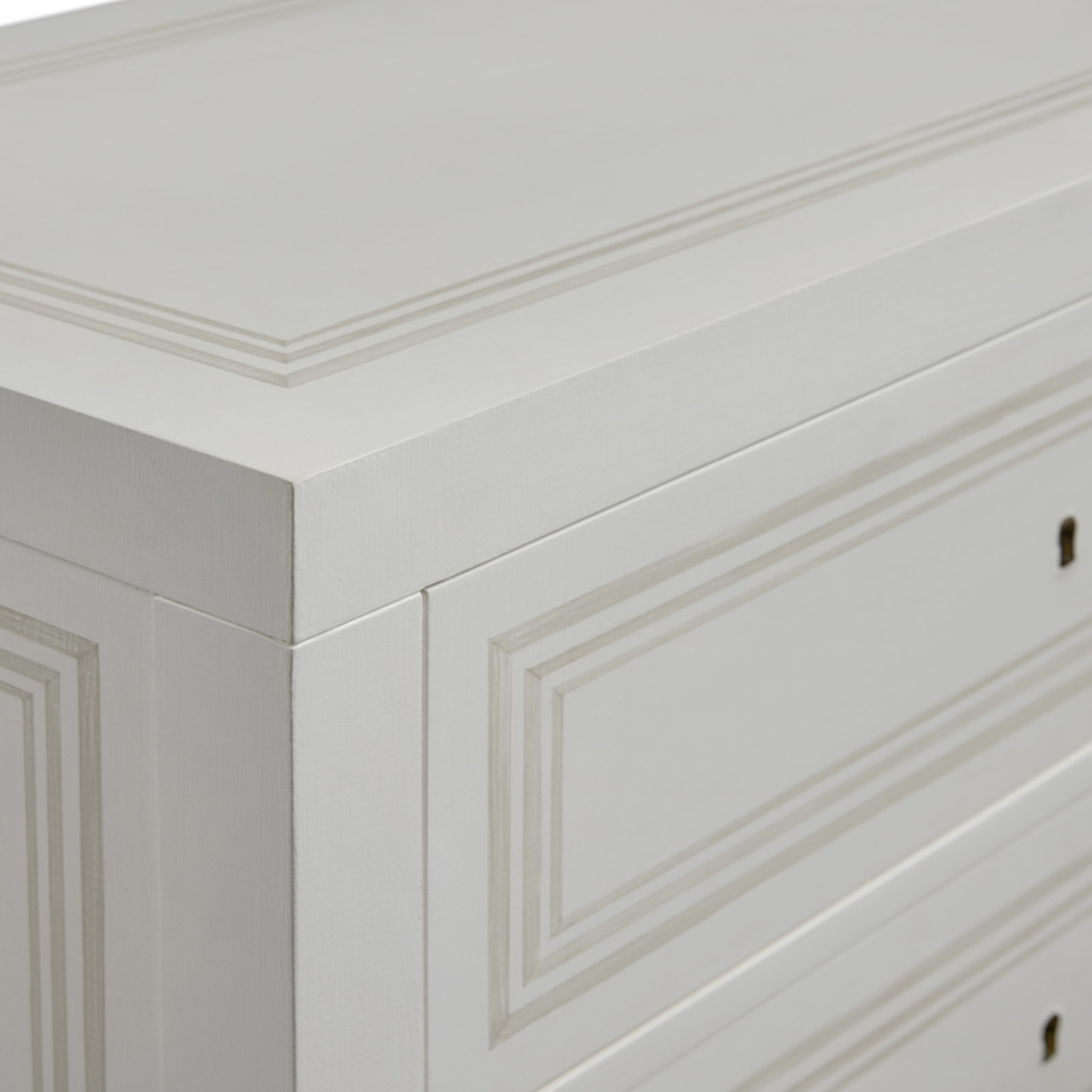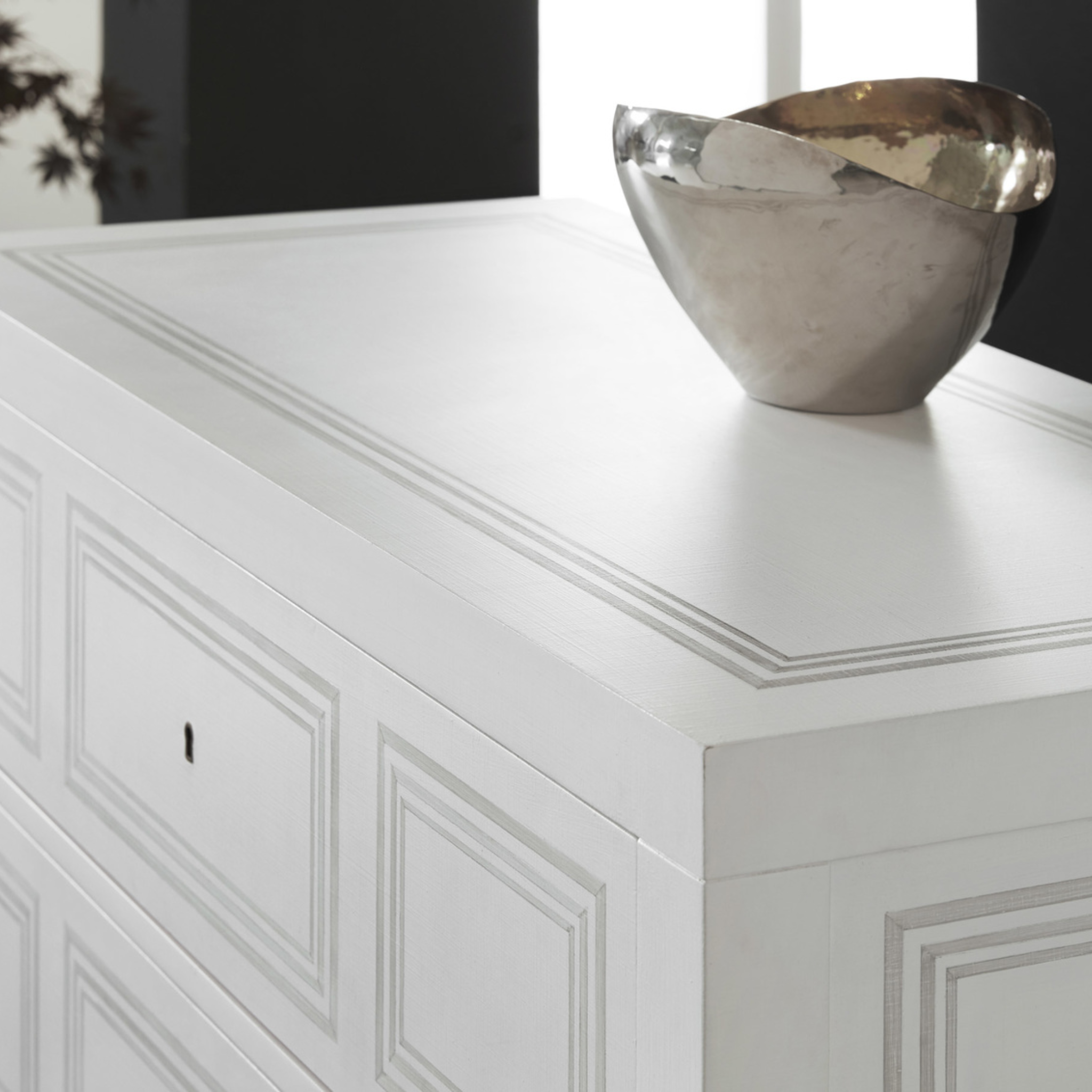 - Materials: Fruitwood With Inlay or Linen Painted Textured Finish; Brushed Accents