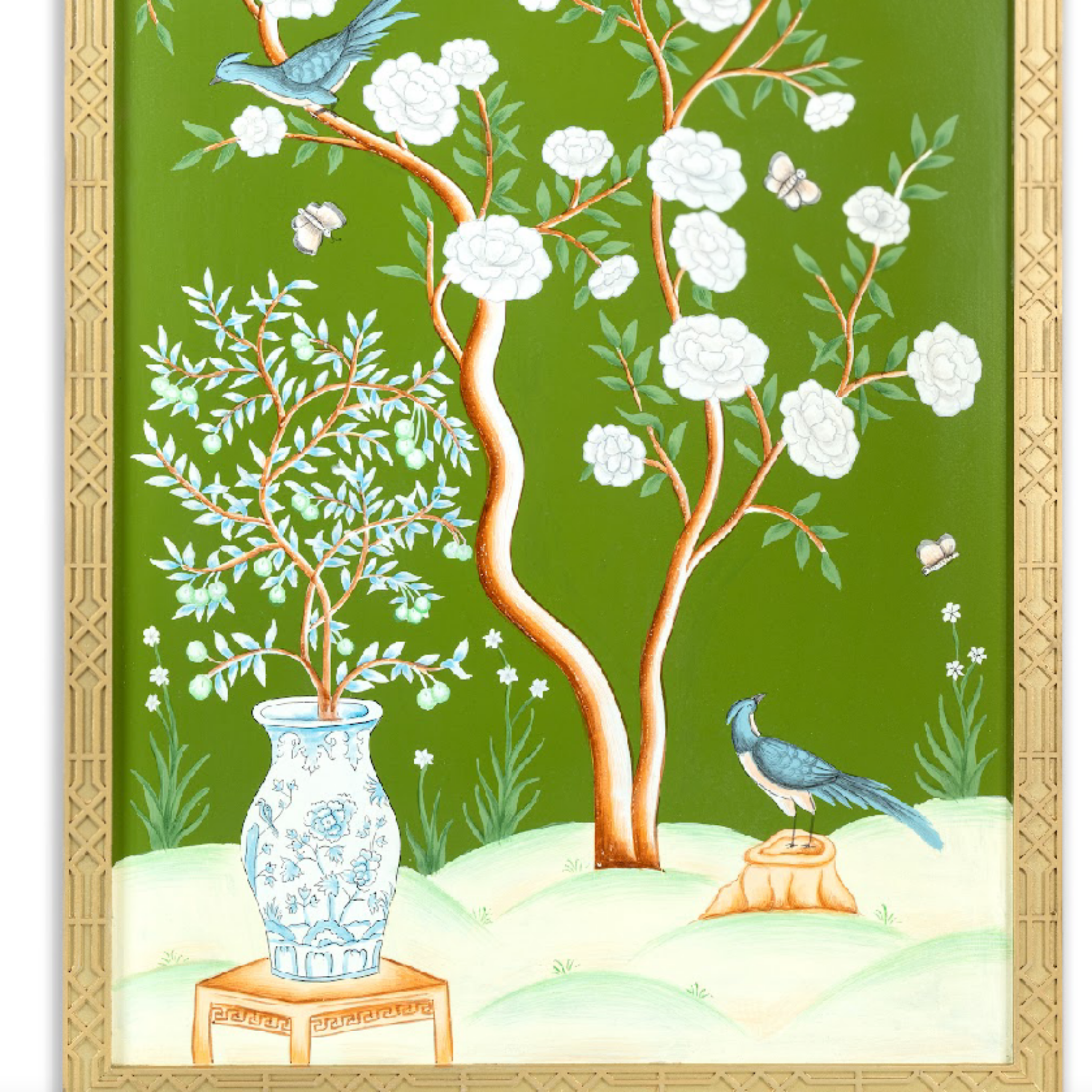 Elevate your space with the timeless elegance of chinoiserie hand-painted murals. Each mural is meticulously hand-painted by skilled artisans, capturing the intricate details and rich colors characteristic of the chinoiserie style. The design often features delicate floral patterns, serene landscapes, and intricate motifs inspired. Whether depicting graceful birds perched among lush foliage or tranquil scenes of nature, these murals are crafted to transport you to a world of beauty and refinement.