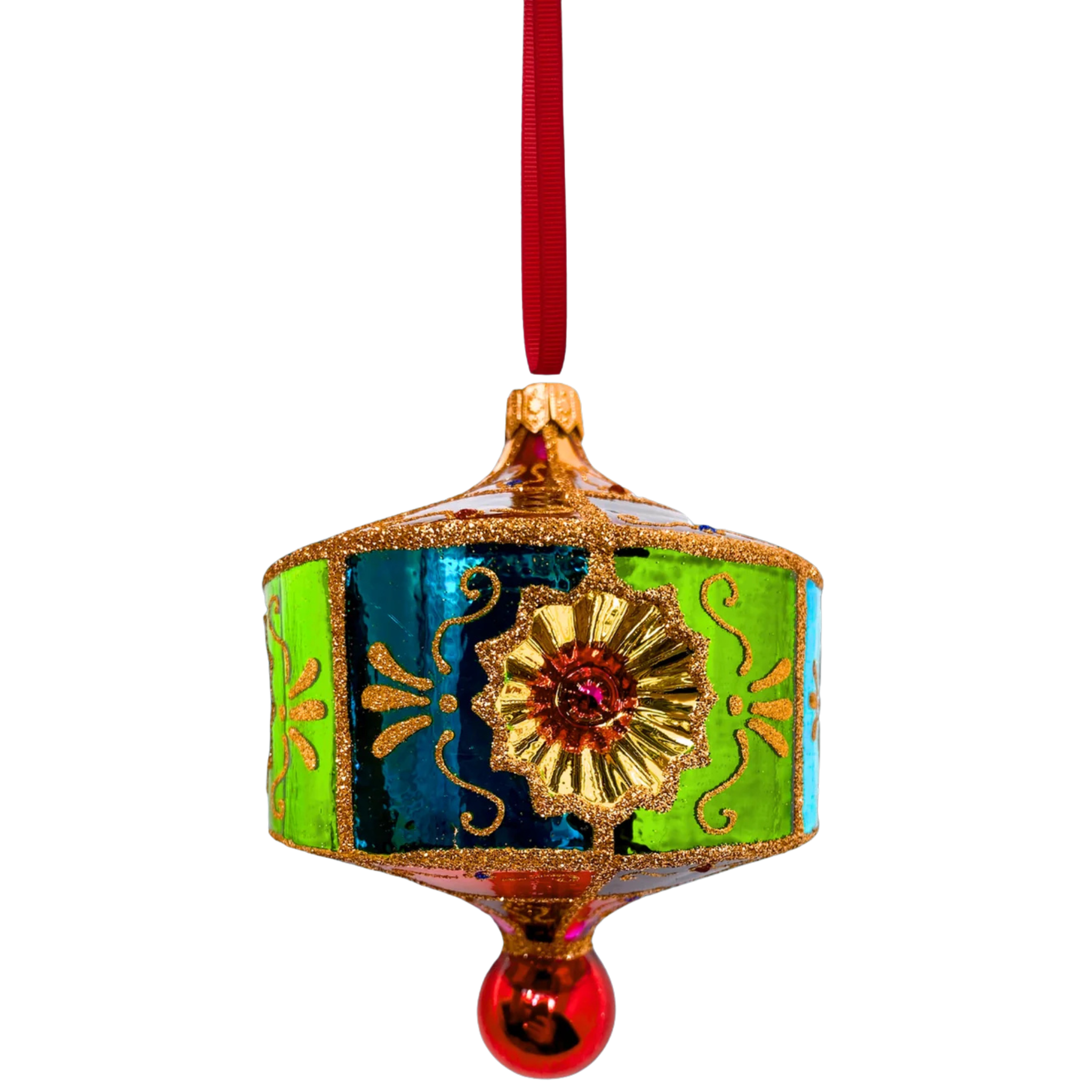 Elevate your decor with this luxurious glass ornament, adorned in rich emerald and sapphire hues. Delicate golden flourishes dance across its surface, bringing an air of elegance and timeless beauty. At its heart, a ruby-gilded rosette adds a regal focal point, catching the light with a warm, jewel-toned glow.