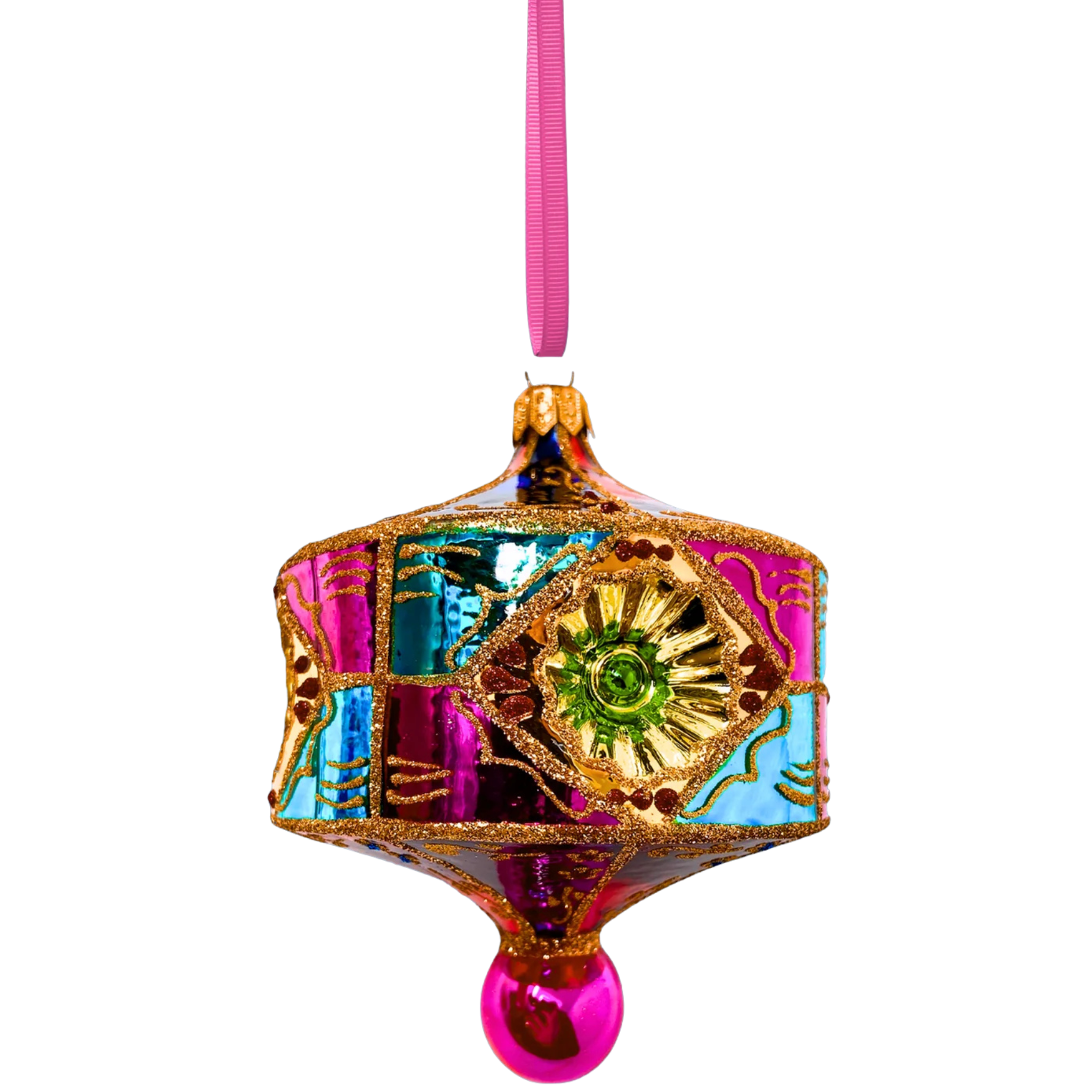 This breathtaking glass ornament is a true masterpiece, designed to captivate with its rich colors and exquisite craftsmanship. Panels of iridescent sapphire, fuchsia, and aquamarine shimmer with a delicate, glowing brilliance, each hue transitioning seamlessly into the next. These vibrant colors are framed by intricate golden scrollwork, as delicate and detailed as lace, adding an elegant, vintage-inspired touch to the piece. At the heart of the ornament, an emerald rosette sparkles with a touch of opulence, its deep green hue providing a stunning contrast to the surrounding colors.
