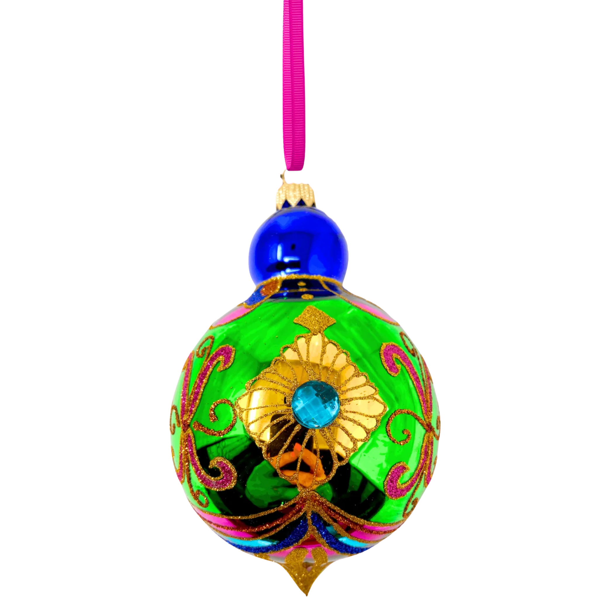 A celebration of opulence and color, this glass bauble ornament dazzles with a vibrant pattern of peridot brilliance, electric sapphire, and fuchsia decadence. Every inch is a visual feast, adorned with gilded swirls and sparkling gemstone embellishments that shimmer with movement and light.