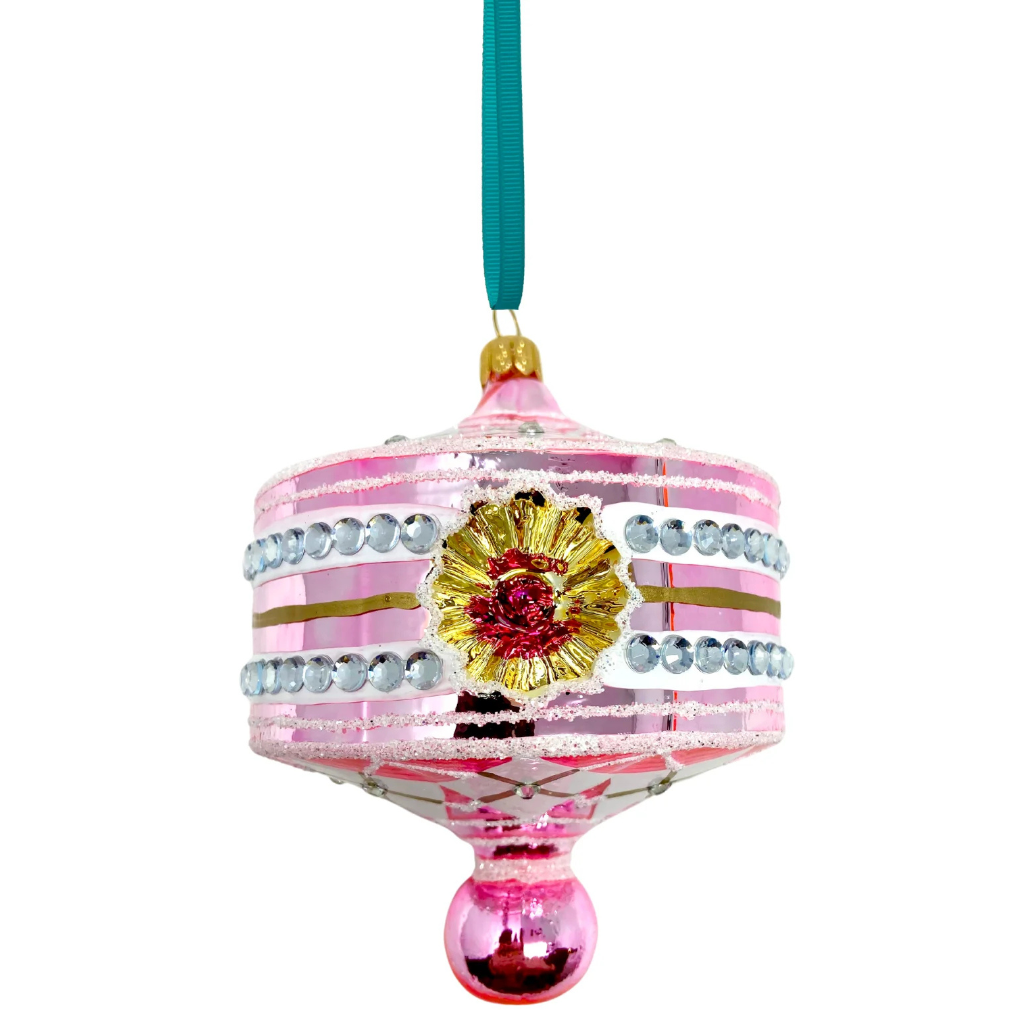 This enchanting harlequin lantern glass ornament is a delightful fusion of playful charm and subtle elegance. In soft, pastel hues of pink and silver, the ornament features a stunning harlequin pattern that wraps around its form, creating a visually striking design. At the heart of the lantern, a sunburst glow emerges, radiating a warm, golden light that adds a touch of magic to the piece.