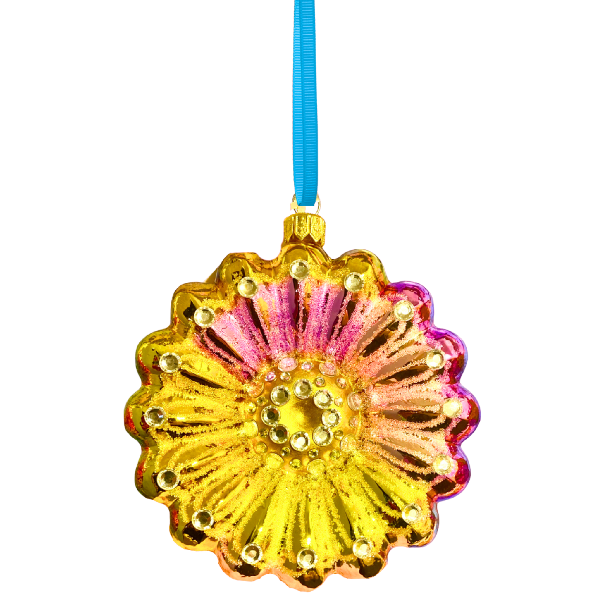 Brighten your holiday décor with this cheerful yellow and pink daisy glass ornament. Featuring delicate petals in soft, hand-painted hues, this floral-inspired piece adds a fresh, whimsical touch to your Christmas tree.