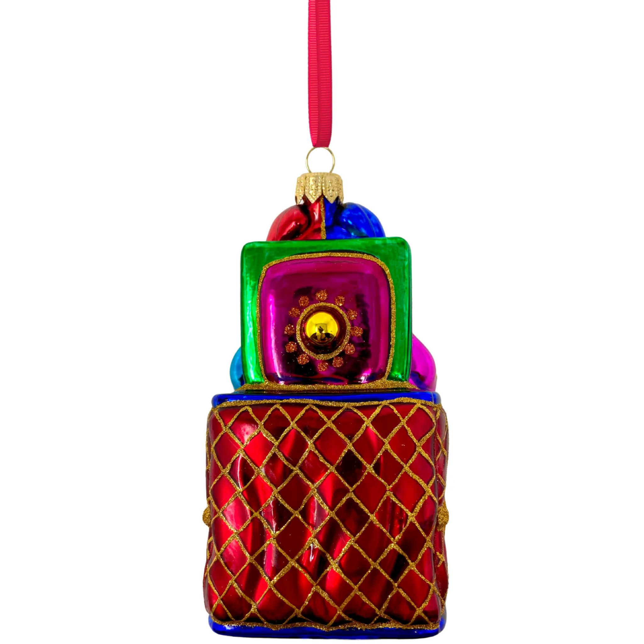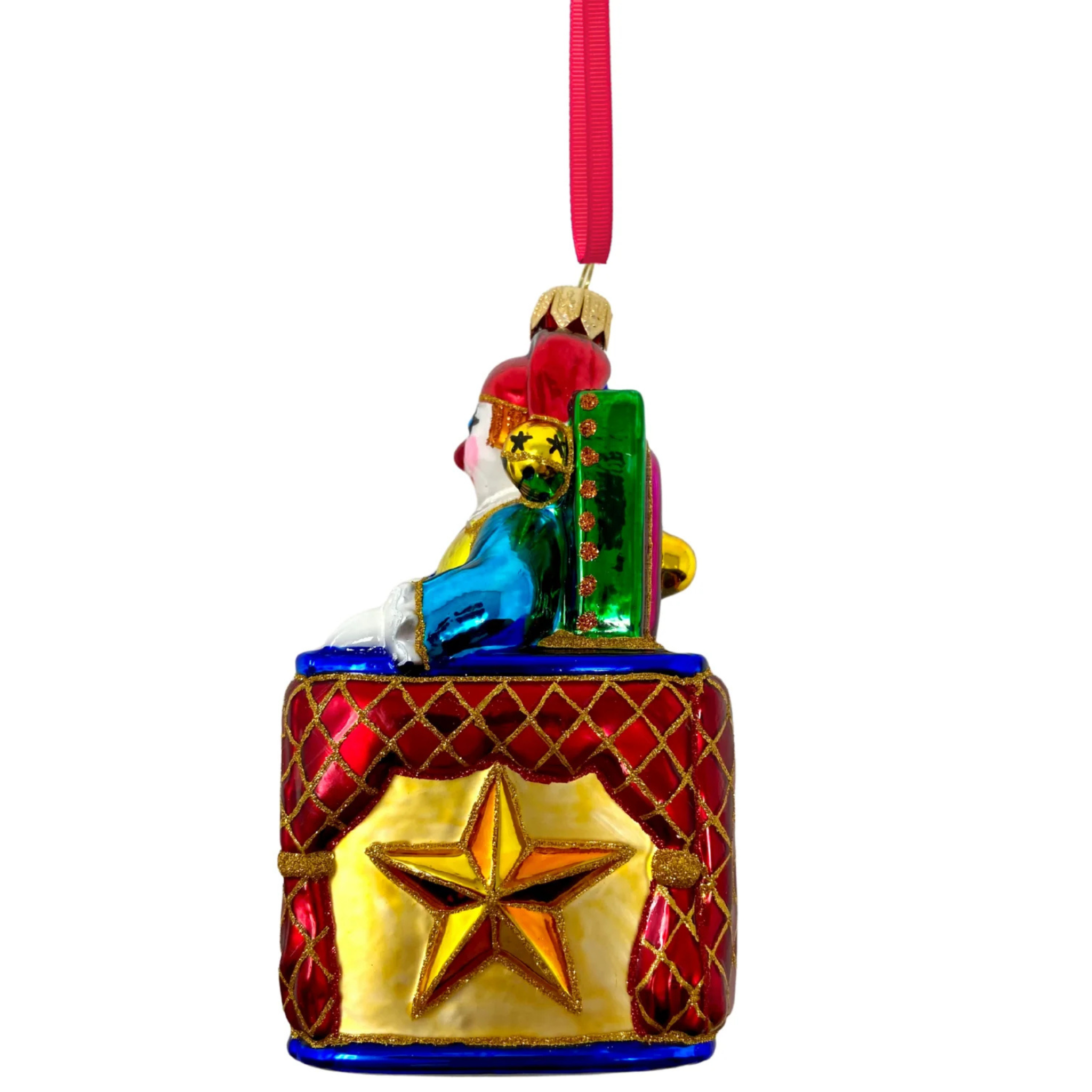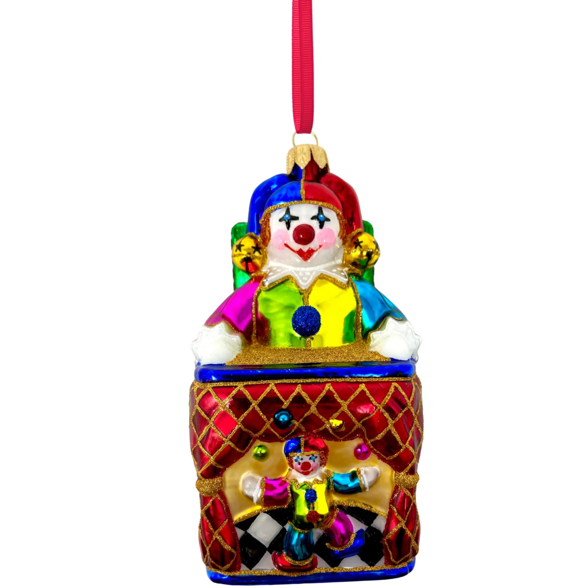 With its vibrant colors and whimsical charm, this ornament features a cheerful jack-in-the-box figure wearing a fun pom-pom hat. The detailed glass design captures the magic of childhood wonder, bringing a nostalgic touch to your tree. Whether it's the quirky smile on the toy's face or the colorful pom-pom perched on its head, this ornament is sure to delight and add a joyful, lighthearted spirit to your festive decorations.