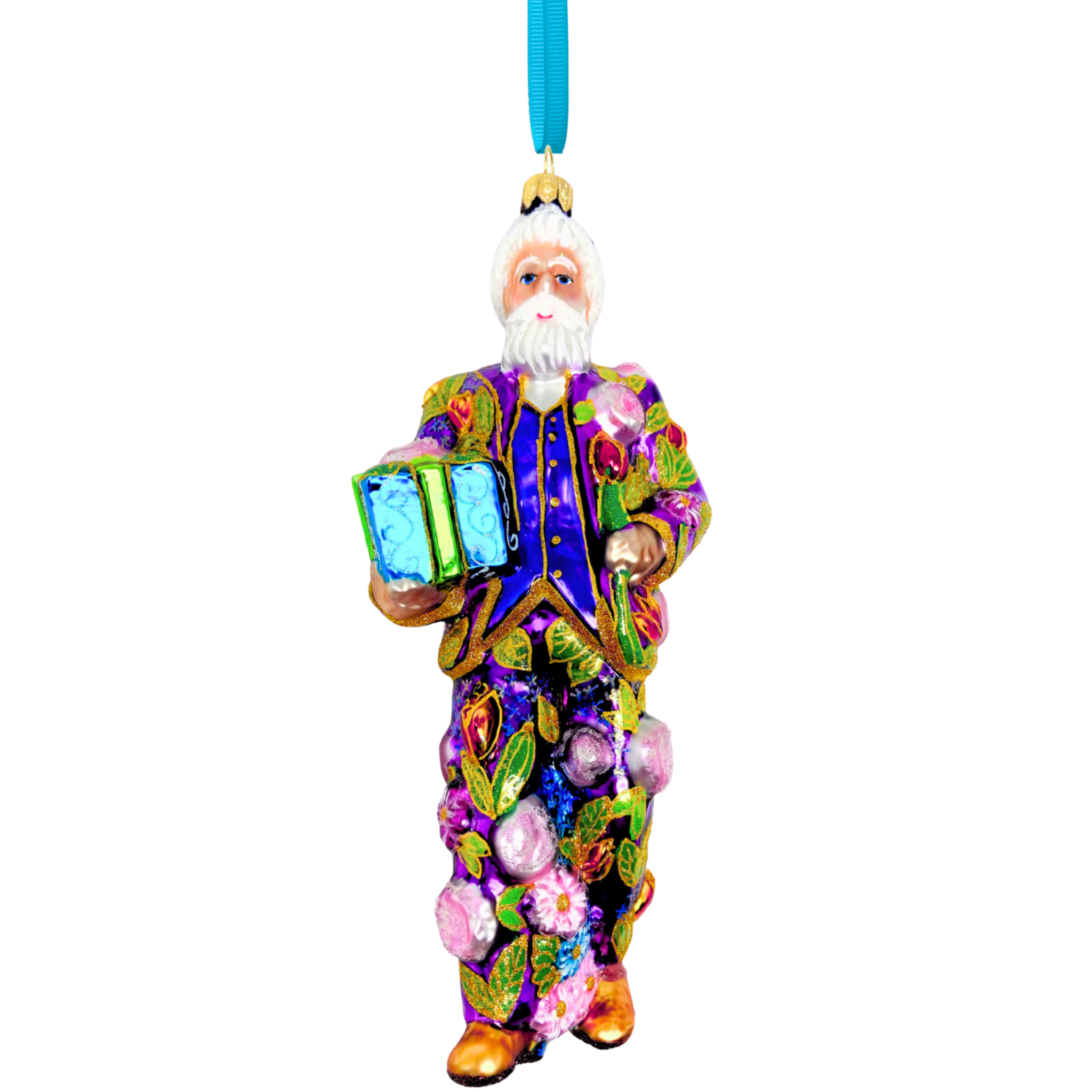 Elevate your holiday collection with this striking Santa glass ornament, dressed in a regal deep violet robe adorned with sculpted florals. Each petal and fold is meticulously crafted, then brushed with a soft metallic luster that catches the light with a gentle shimmer. A modern take on a classic figure, this ornament brings a sense of opulence and artistry to your tree - perfect for those who favor rich color palettes and refined festive charm.