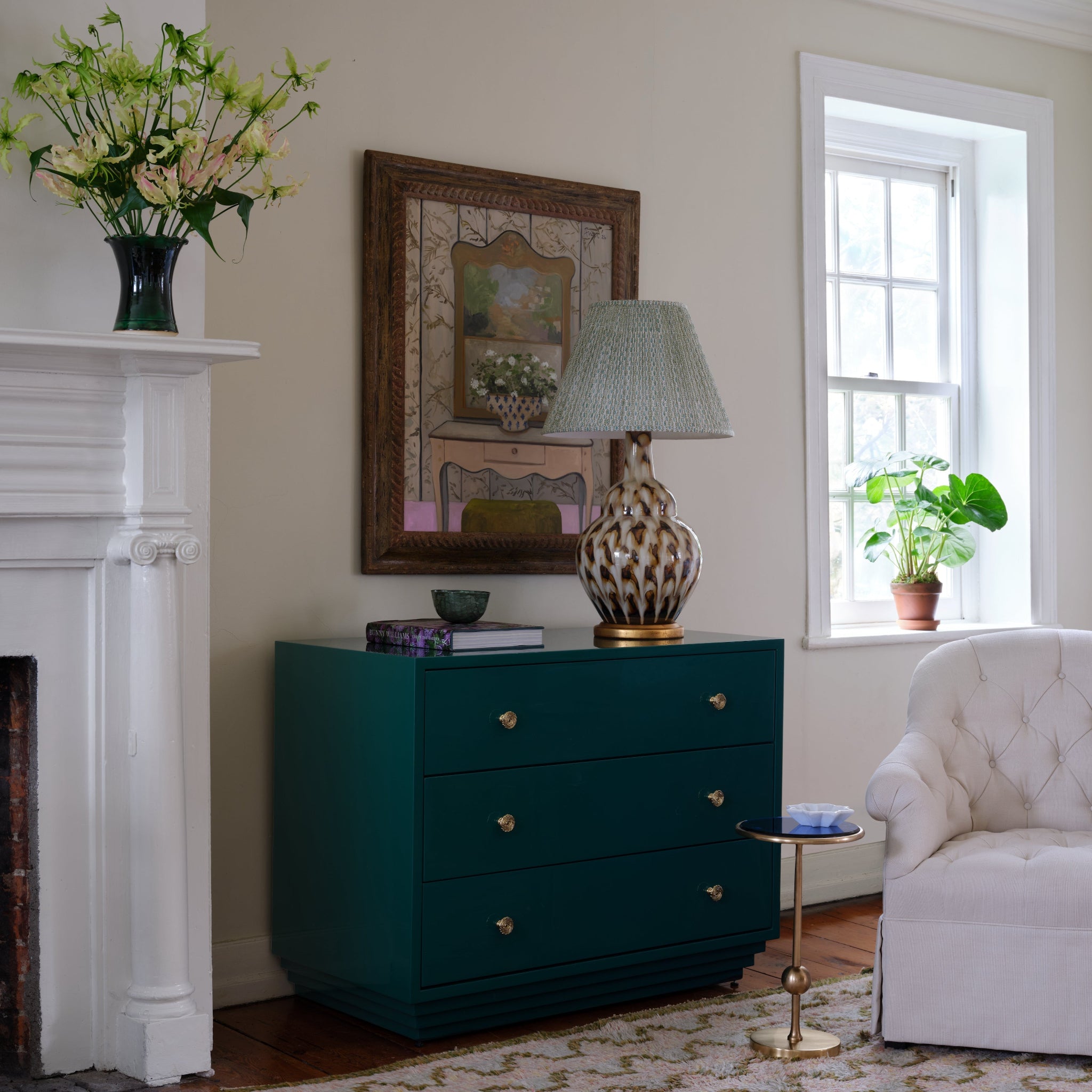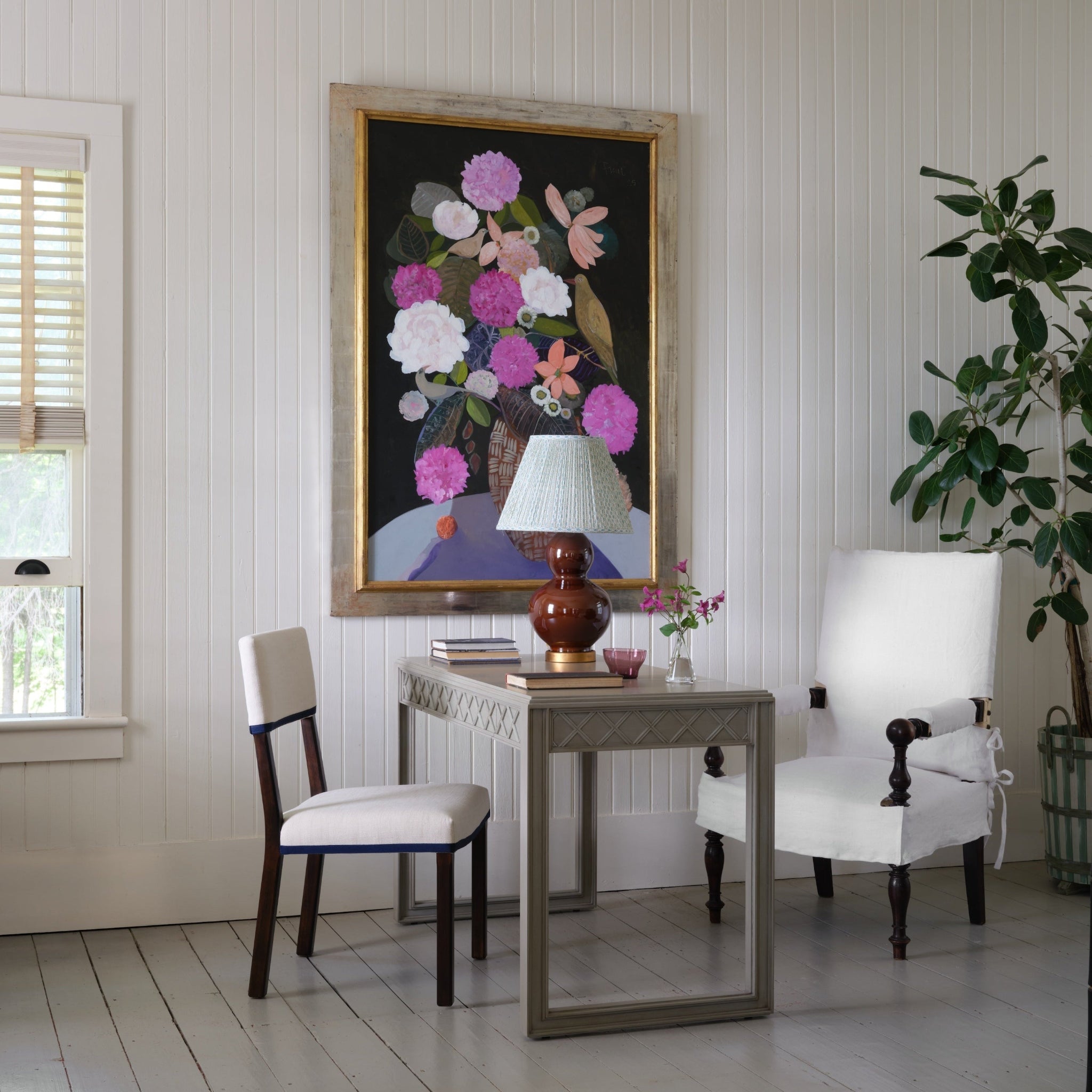 Bring an artisanal touch to your lighting with this hand block printed lampshade, featuring a stylized vine pattern in mellow greens and delicate pale-blue floral buds. Expertly scaled to fit nearly all Bunny Williams Home table lamps, it offers a sophisticated, verdant aesthetic for any room.