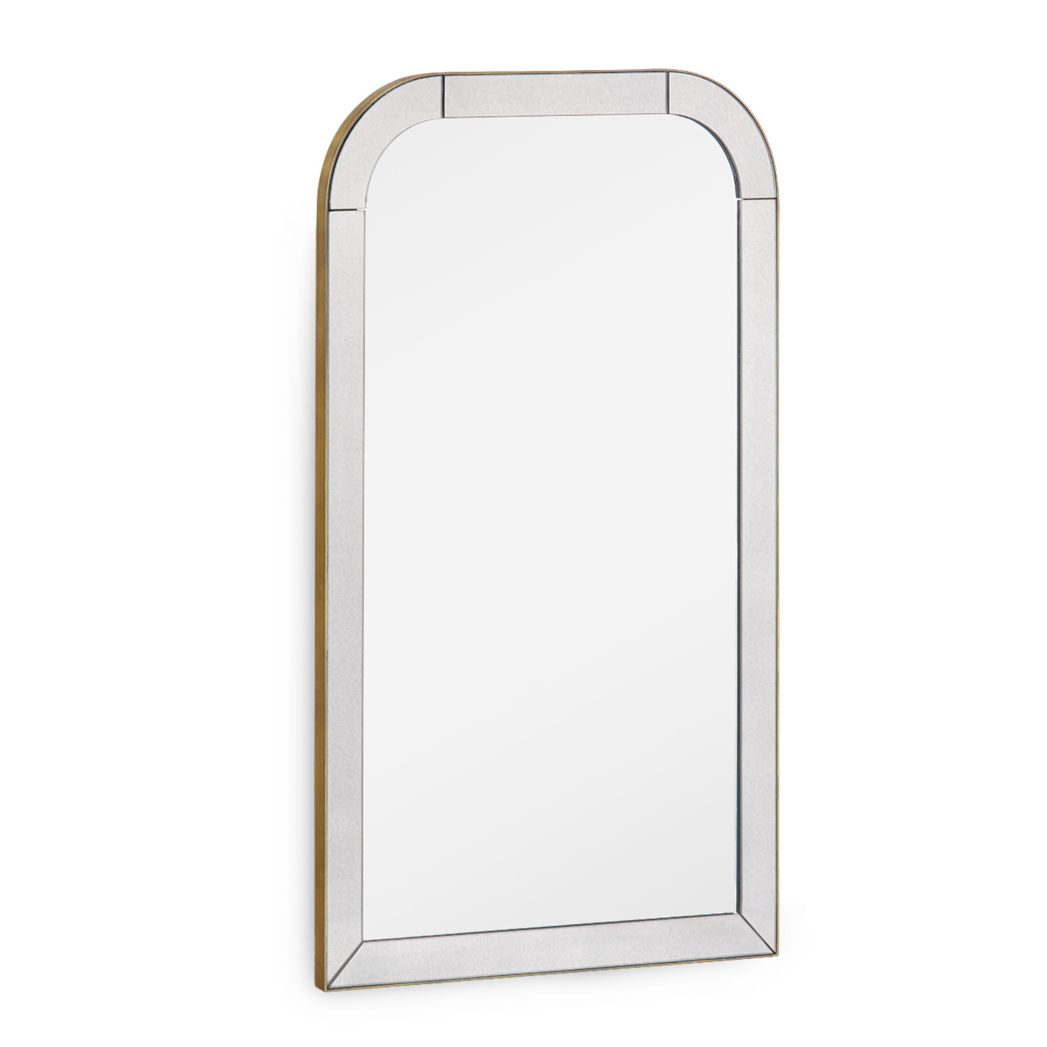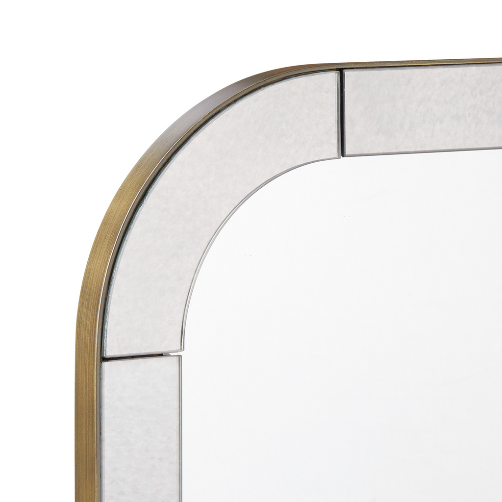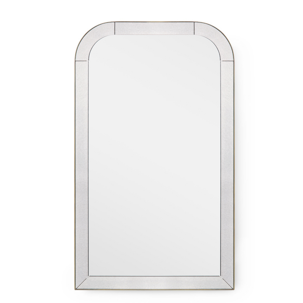 The Riley Mirror combines timeless design with modern simplicity. Its classic arched shape is complemented by a clean, minimal aesthetic. A brushed brass edge frames the piece, adding subtle warmth and sophistication. The center panel features a clear mirror, while the surrounding border of lightly antiqued mirror introduces a touch of understated character. Perfectly balanced in style, the Riley Mirror is an elegant addition to any space.