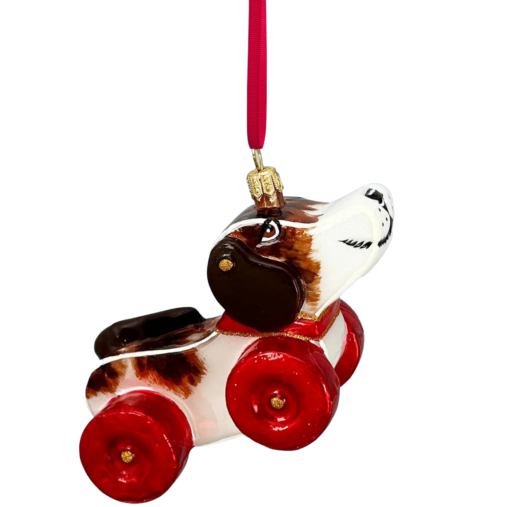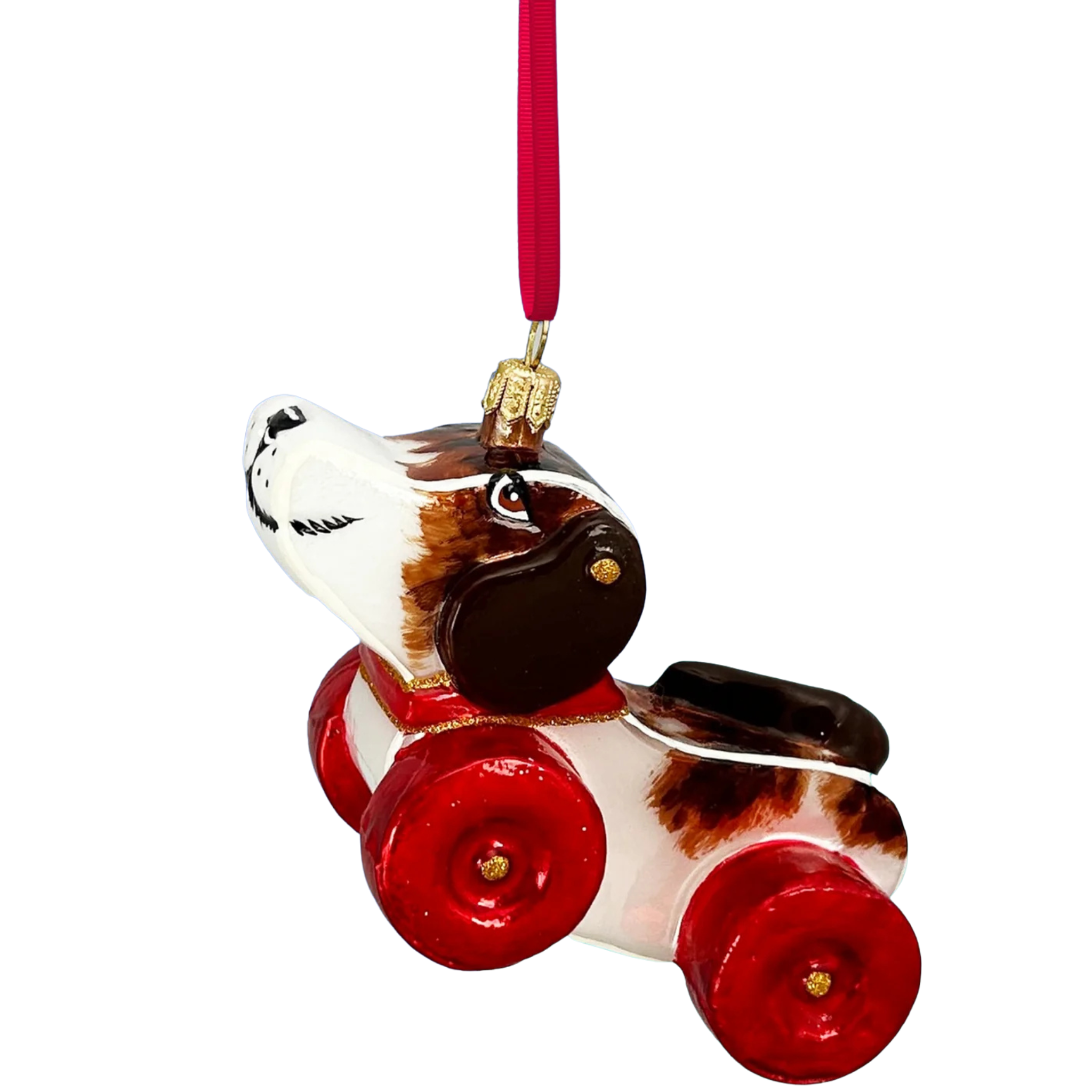 Crafted with intricate detail, this playful ornament features a sweet, smiling pup atop a colorful pull toy, complete with vibrant wheels that add a touch of whimsy. The dog’s joyful expression and the soft pastel hues bring a sense of innocence and joy, evoking the playful spirit of childhood memories. Hand-painted with precision, this ornament captures the delightful movement and charm of a vintage pull toy, making it a perfect piece for animal lovers or those who appreciate a touch of retro charm in their seasonal decorations.