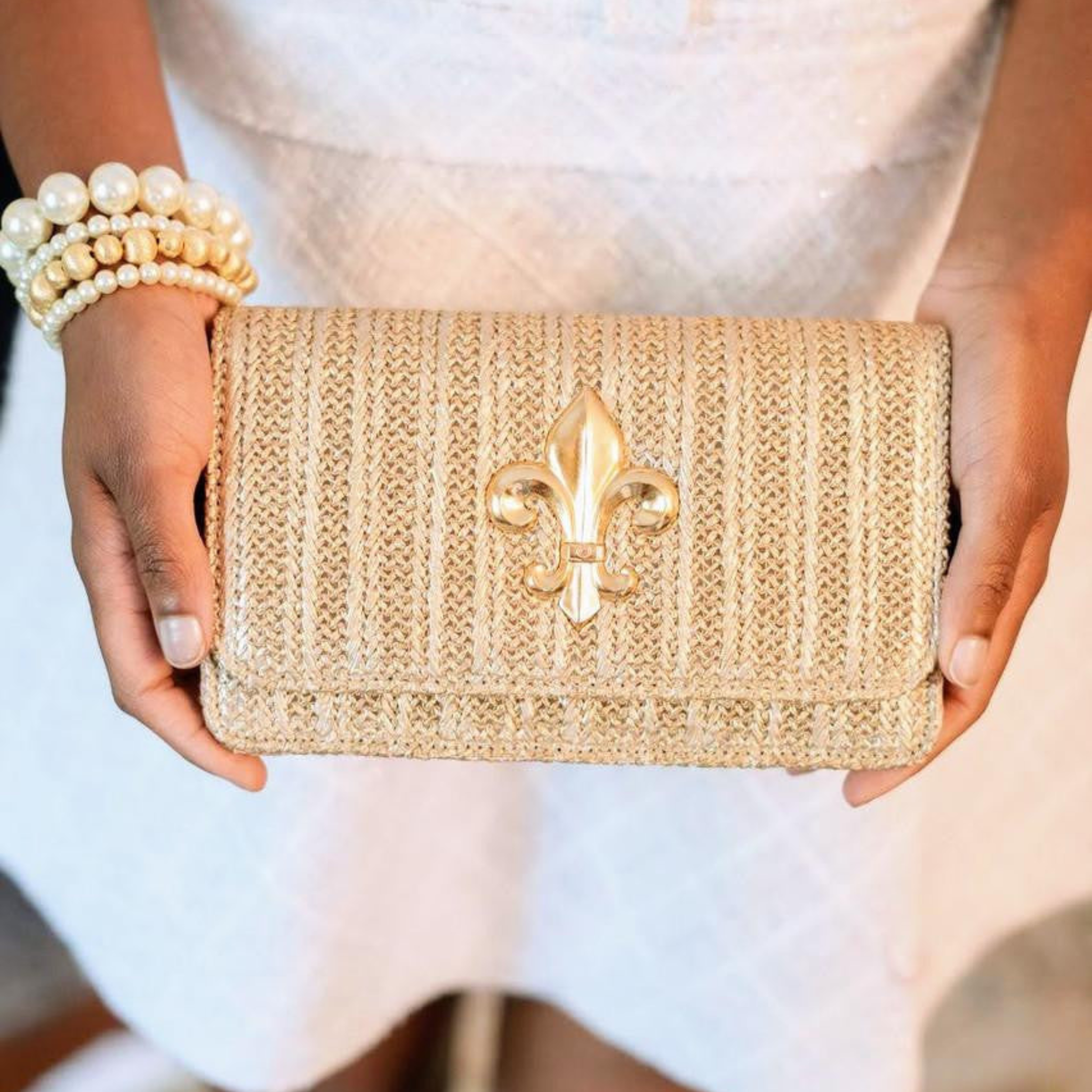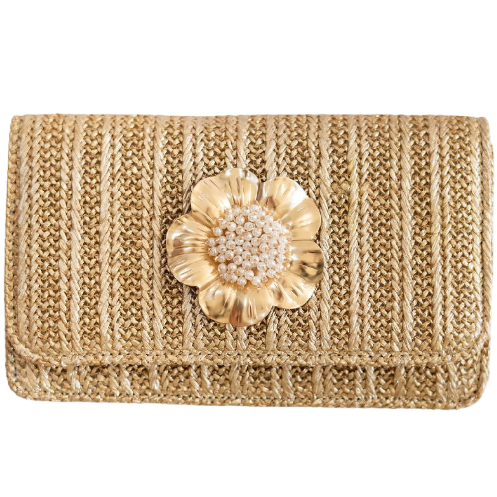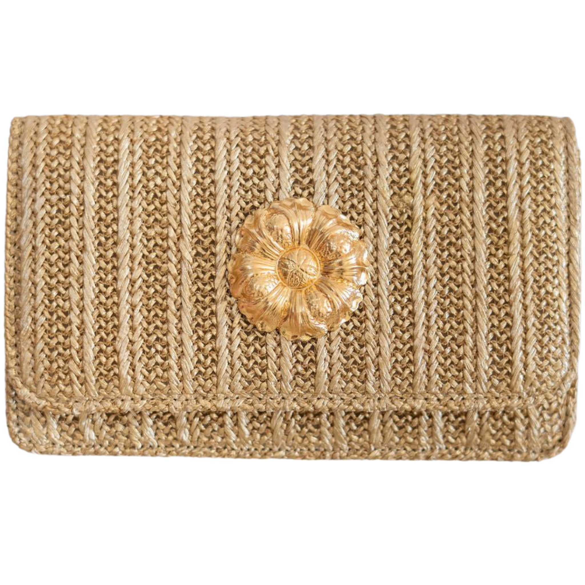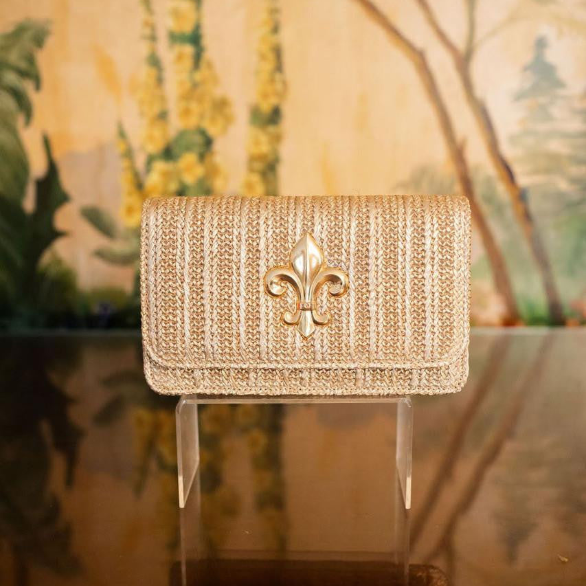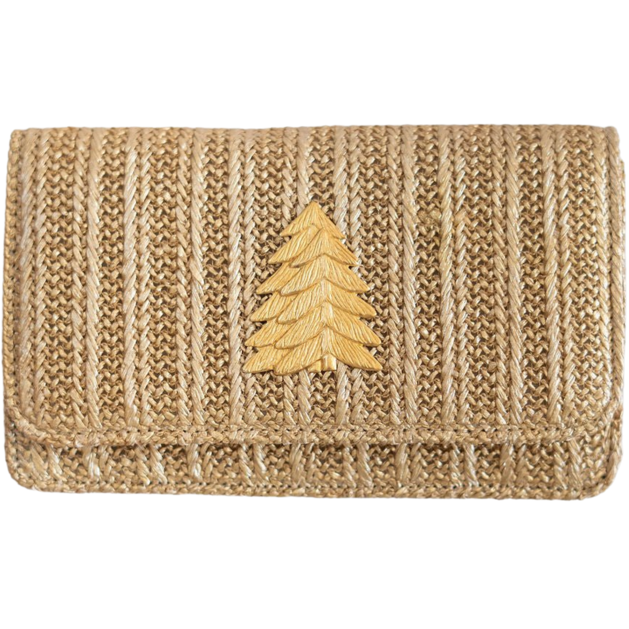 Turn heads with timeless sparkle. This clutch exudes understated glamour, crafted from shimmering metallic fabric that catches the light with every move. Sleek and refined, its minimalist silhouette is elevated by a custom charm - adding a touch of personality and flair to your evening ensemble.