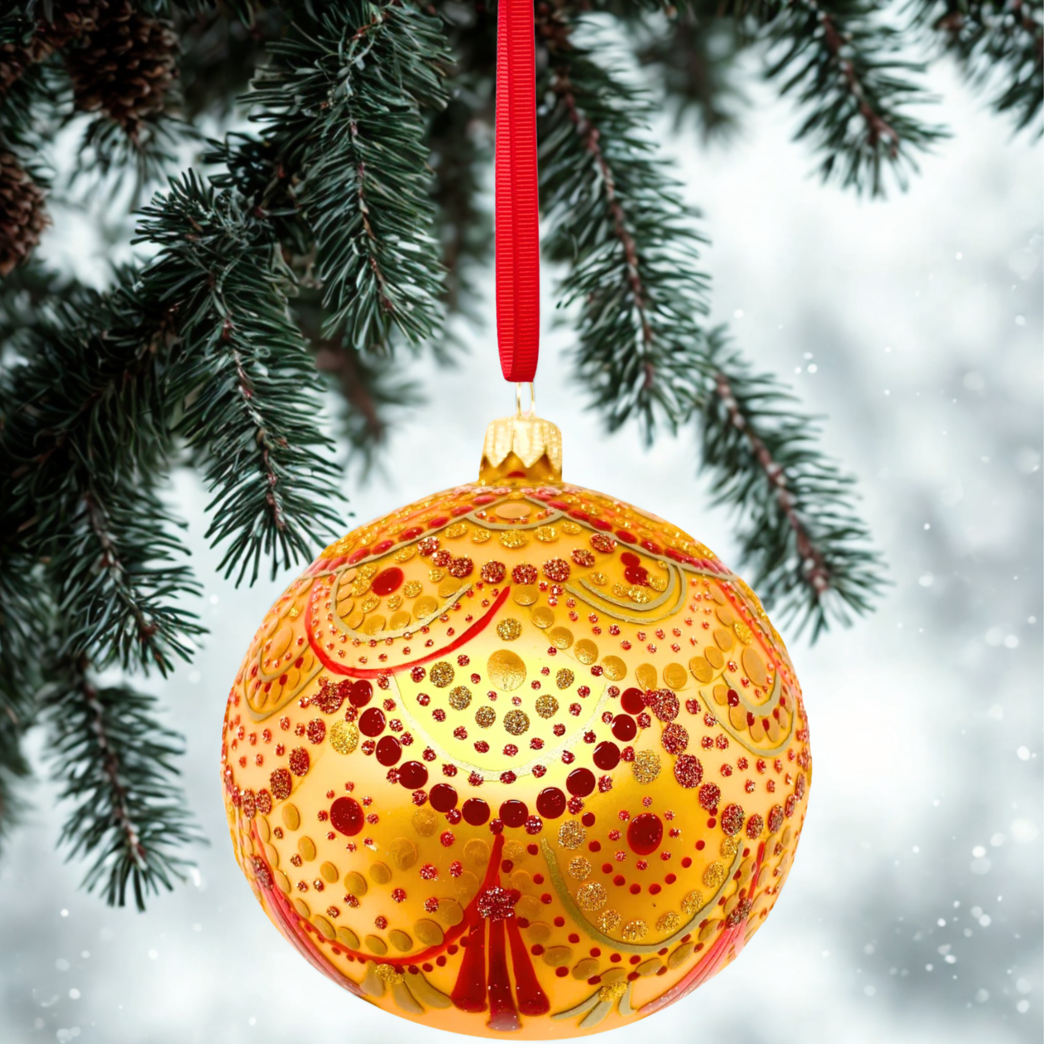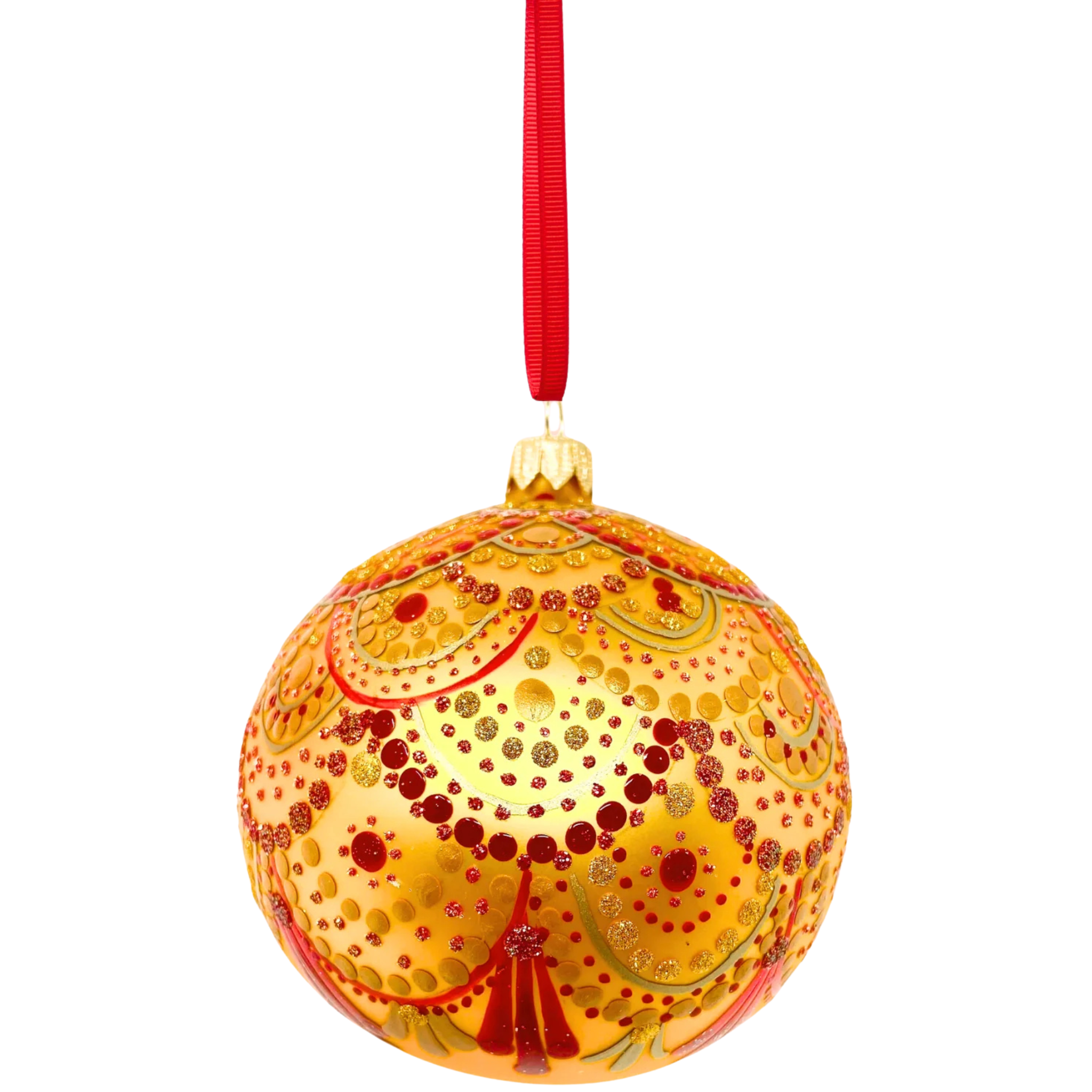 Elevate your holiday décor with the timeless elegance of the Sistine Lace Glass Bauble. This exquisite ornament features a luminous gold finish adorned with intricate red detailing, reminiscent of classic lacework. A refined and regal addition to any Christmas tree.