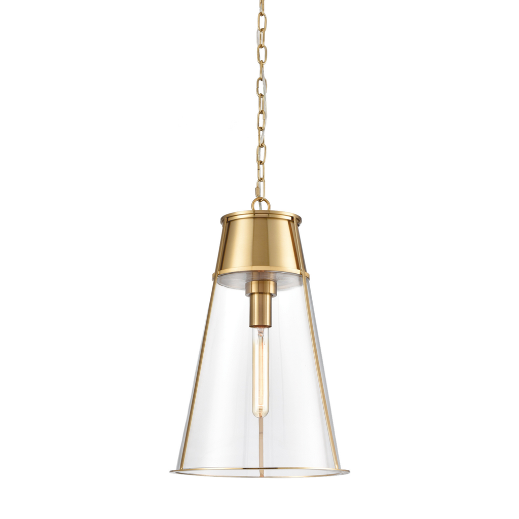 Generous in scale, and made of a modern mix of brass and glass, this pendant is a handsome fixture. Over an island, in an entry or foyer, a solid choice.