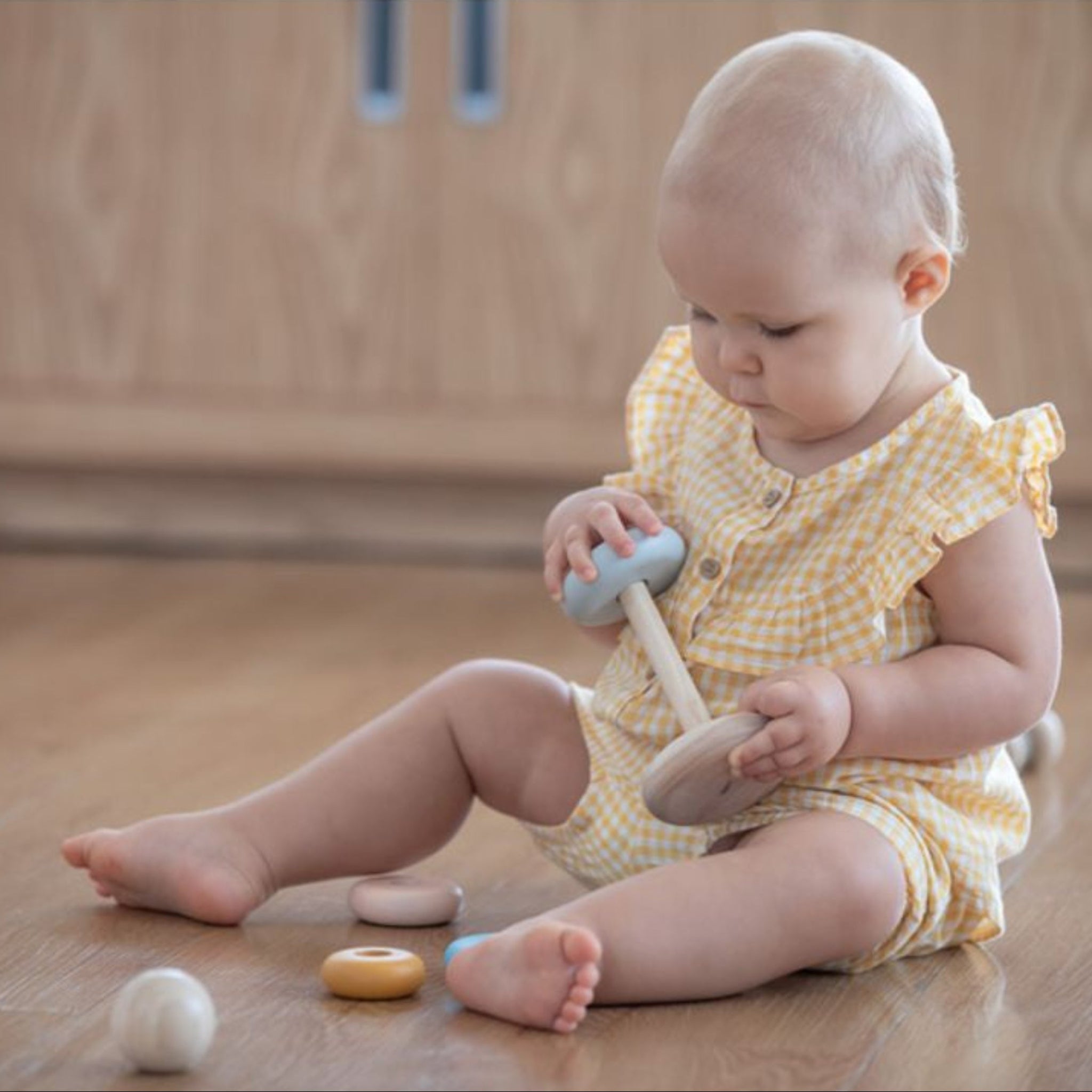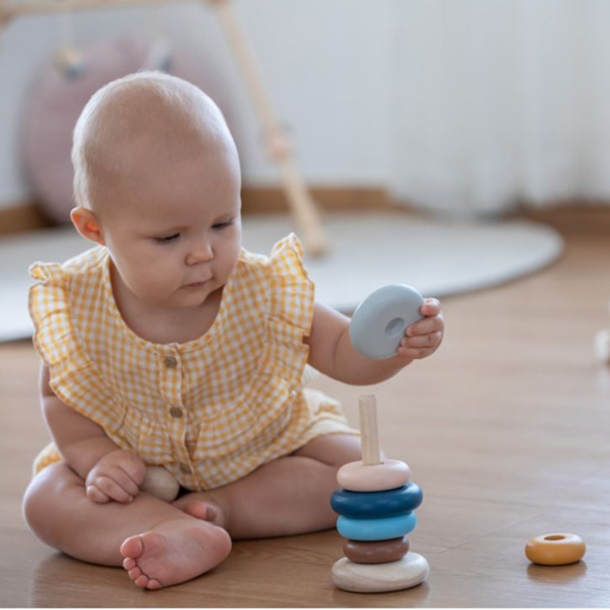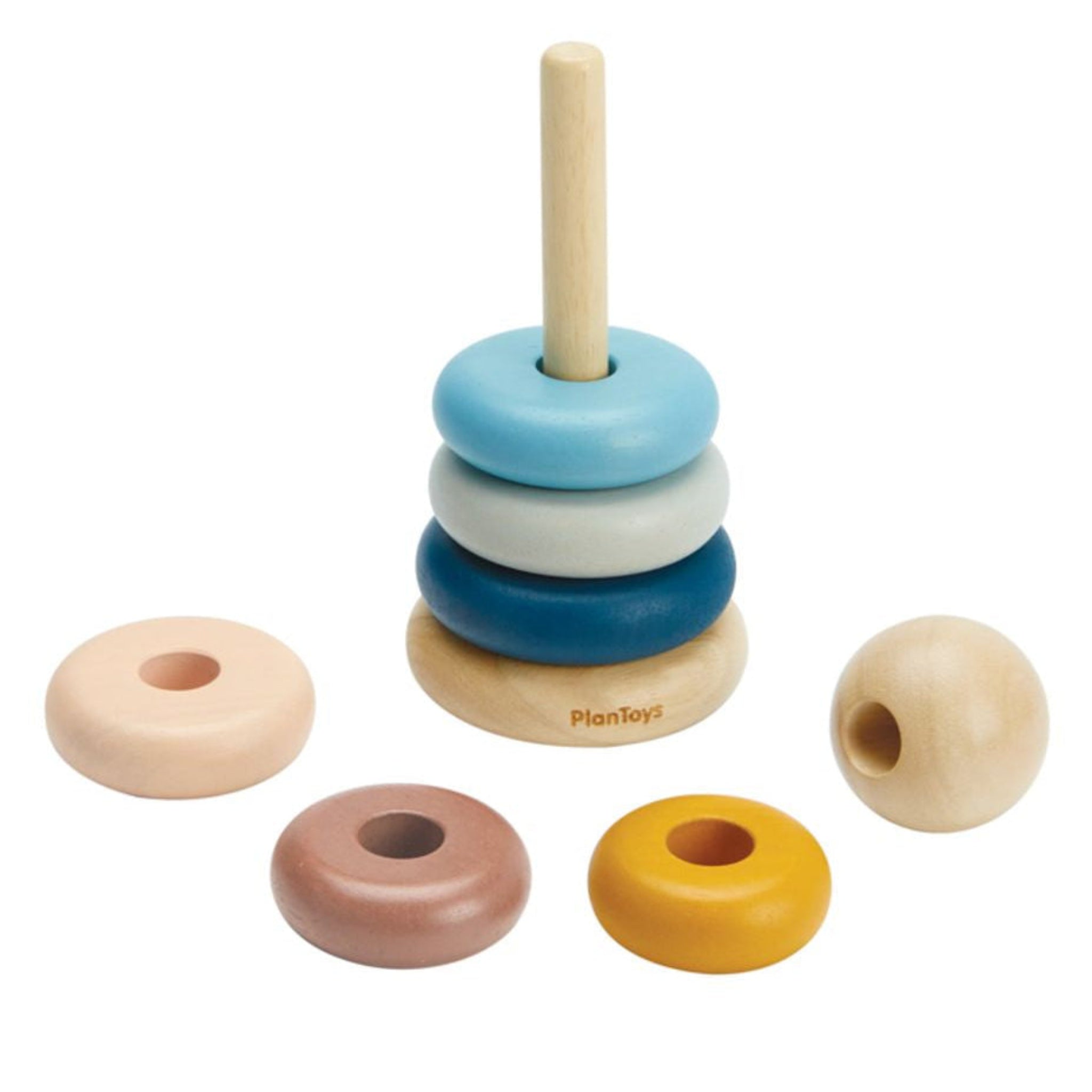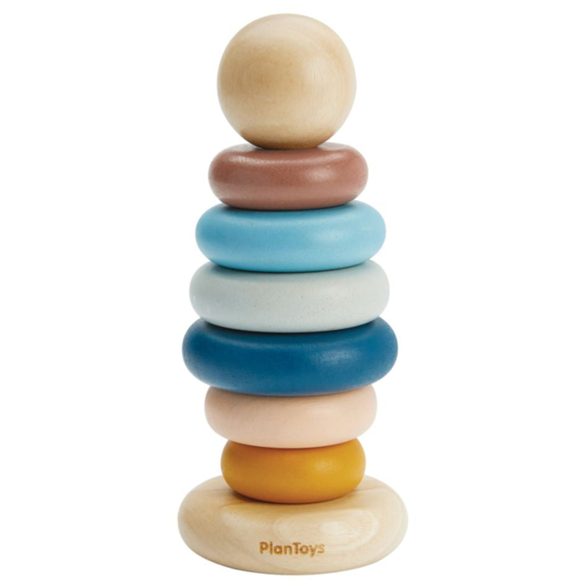 The colorful wooden rings of the PlanTosy Stacking Ring set help teach children about size and colors. For safety precautions, the center rod is foldable. This version of the Stacking Ring comes in our Orchard colorway.