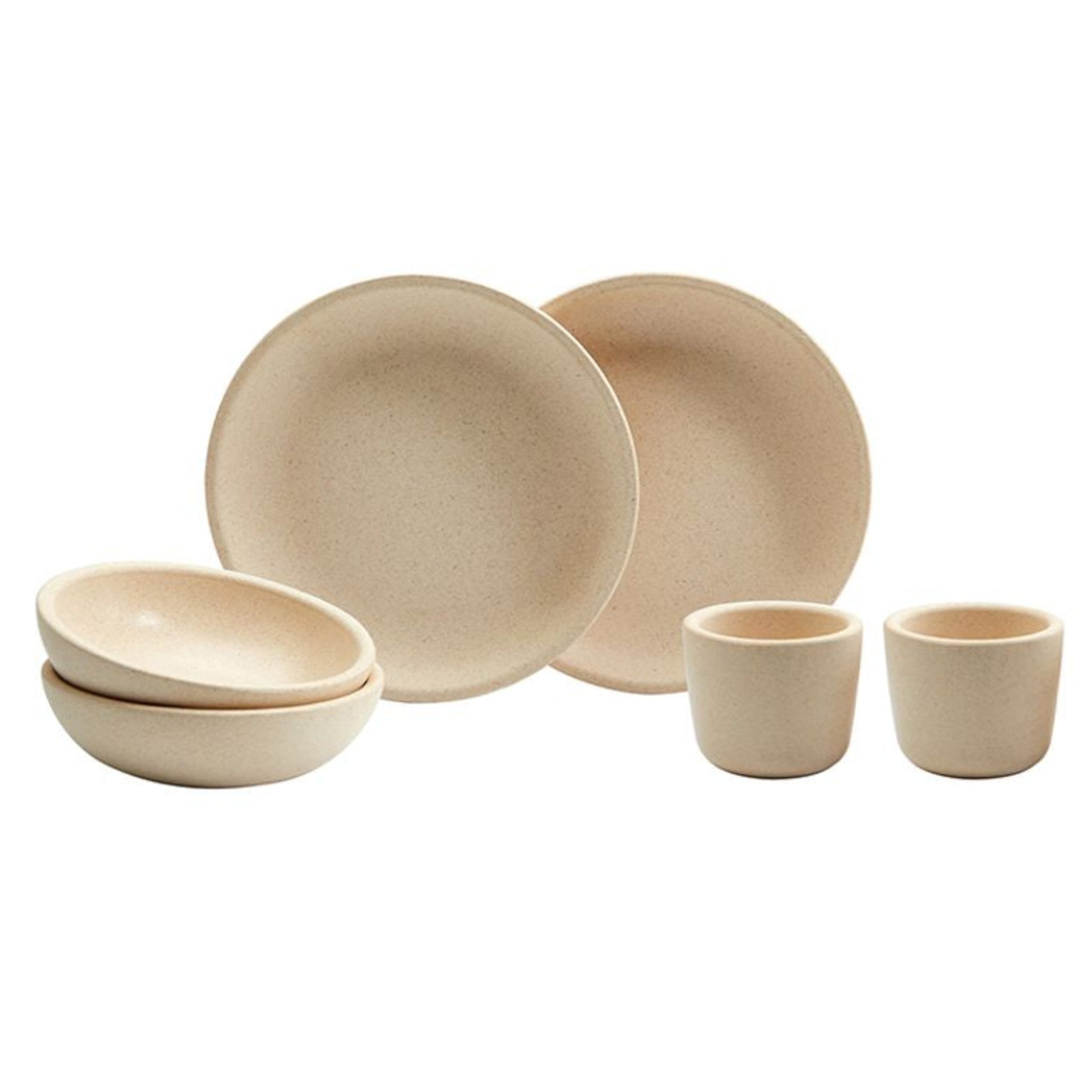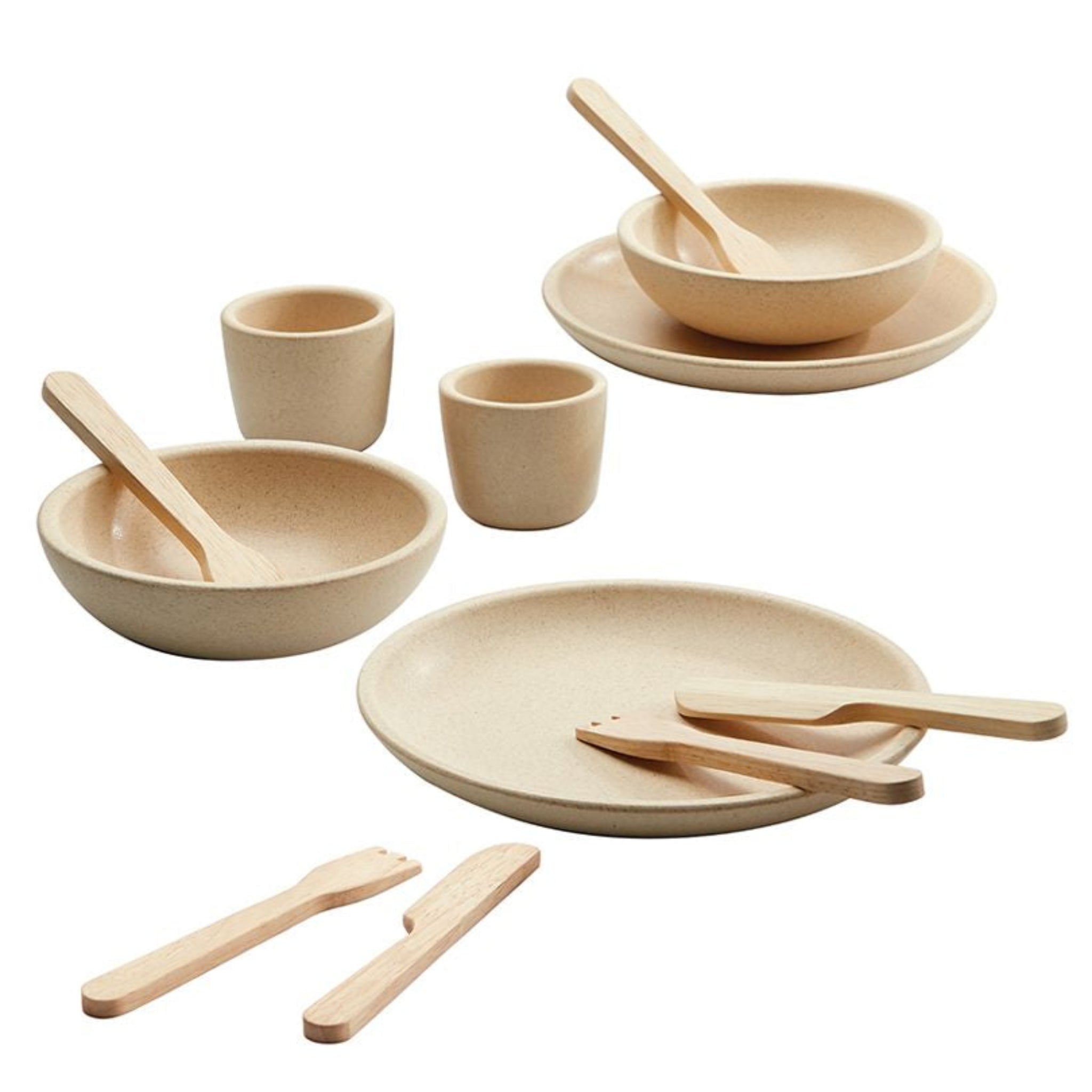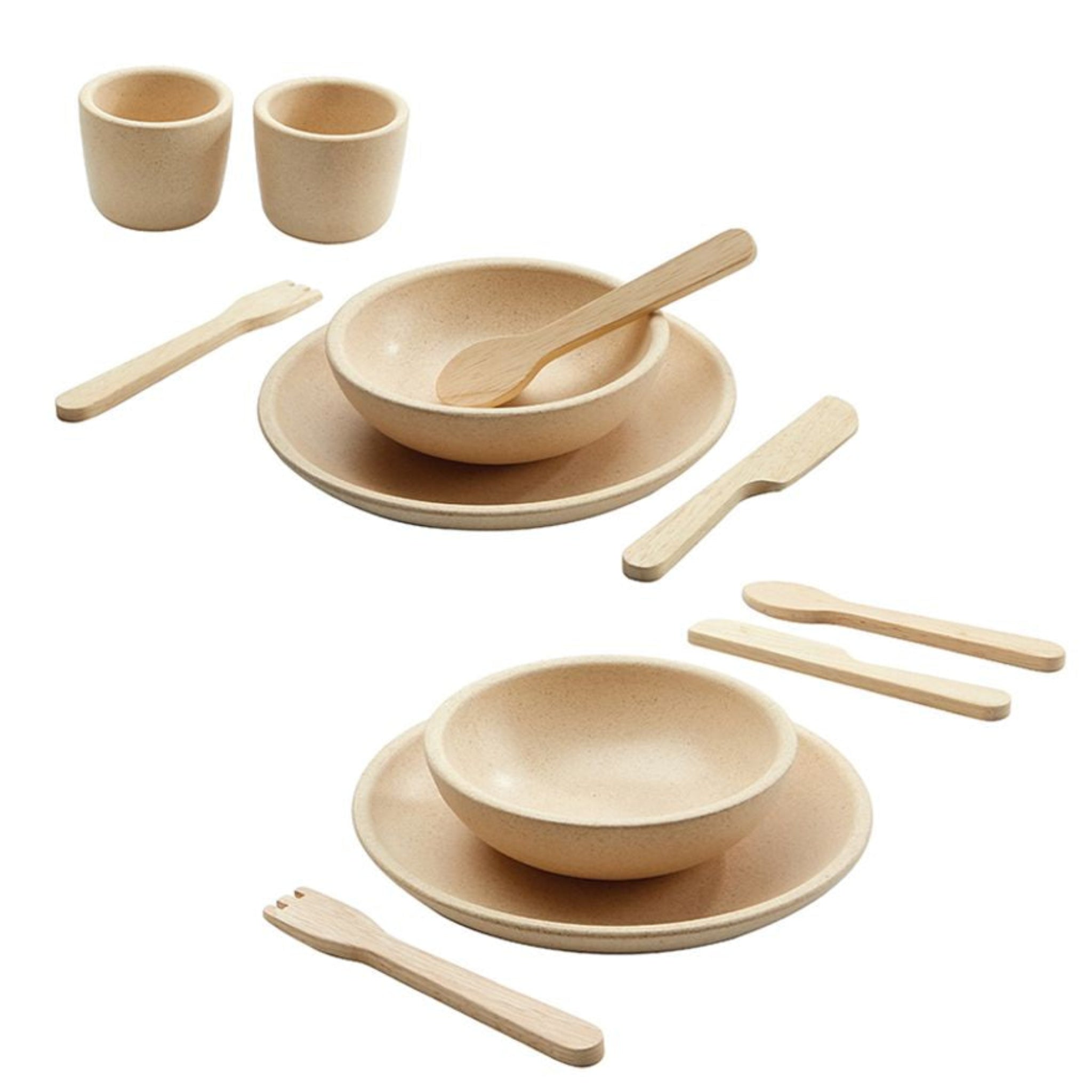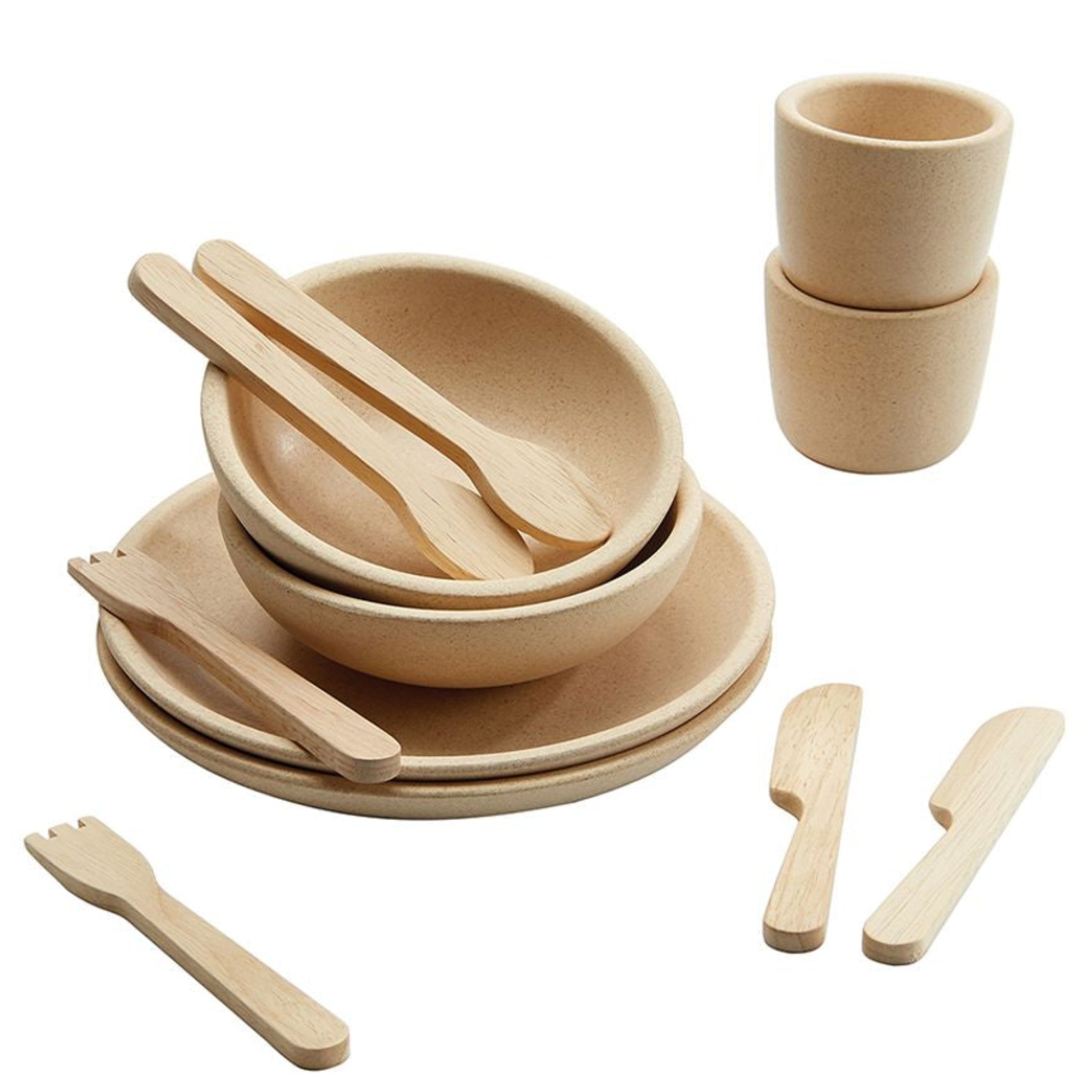 - It's hard to enjoy a meal without the correct dishware! Invite children to pretend play with the PlanToys Tableware Set included. With 2 plates, bowls, spoons, forks, knives and glasses, little ones have everything that they need to bring their imagination to life in the kitchen.
