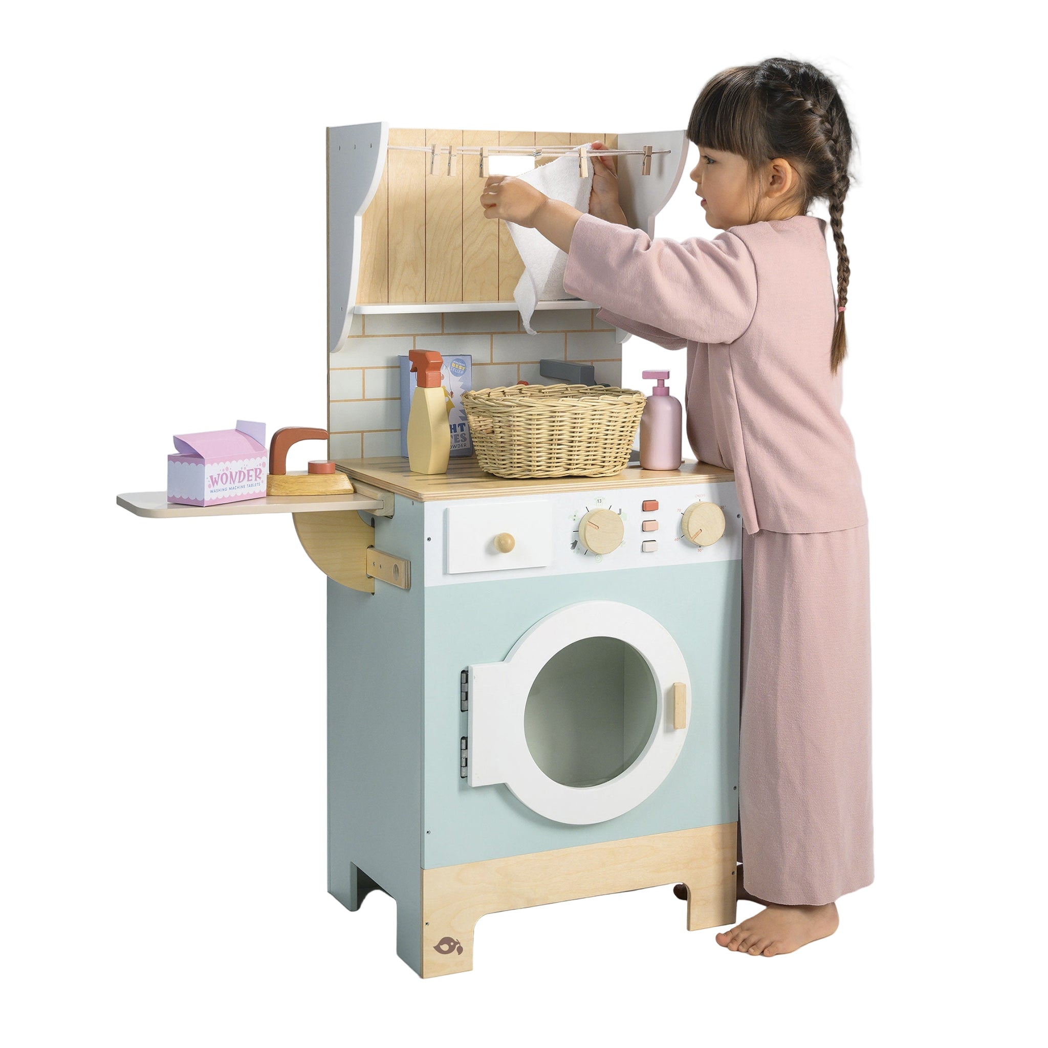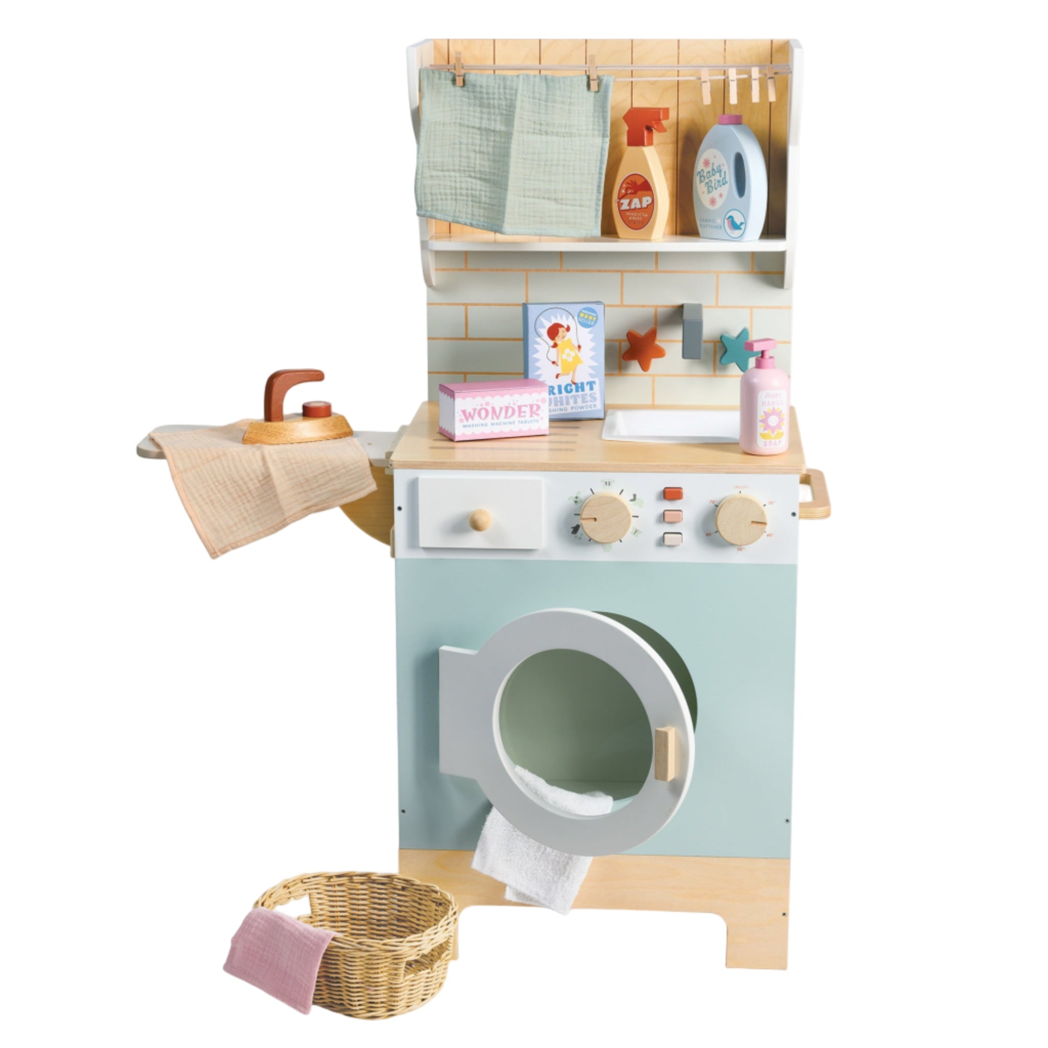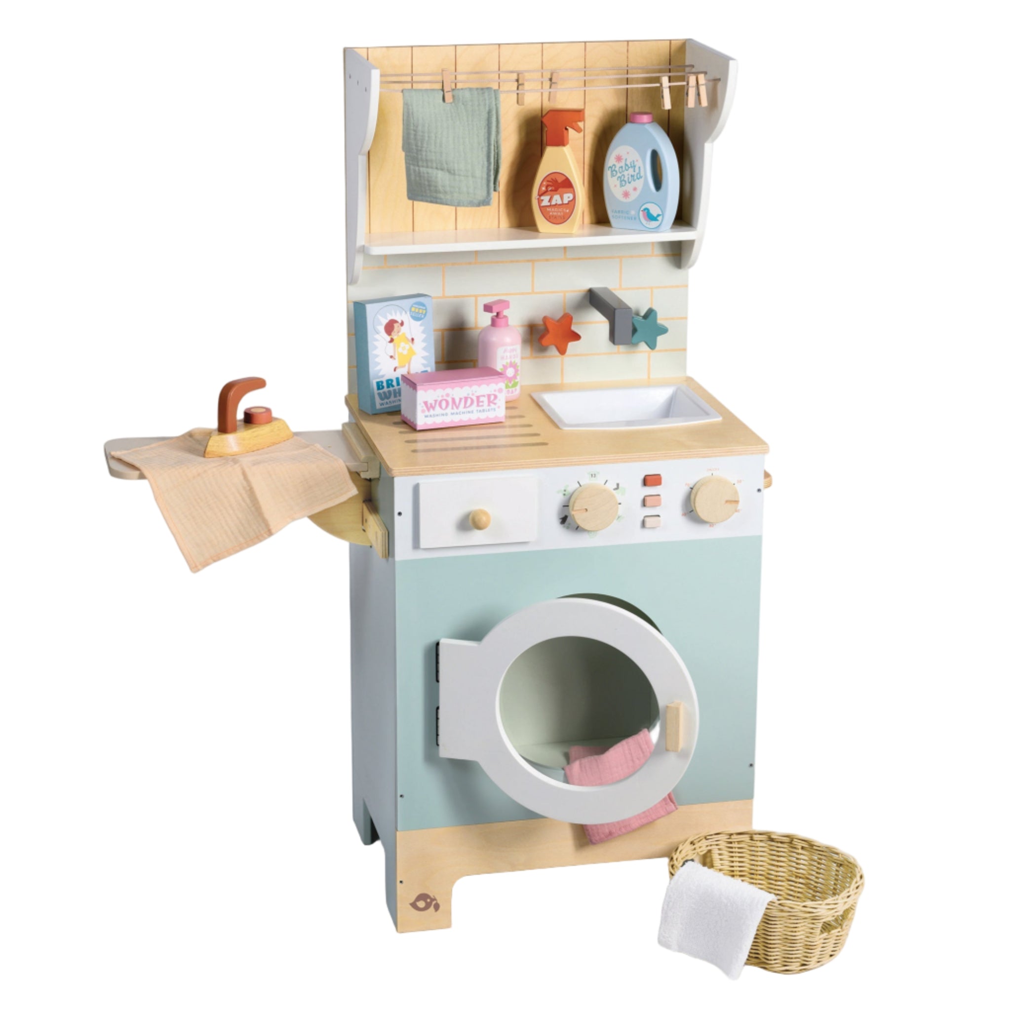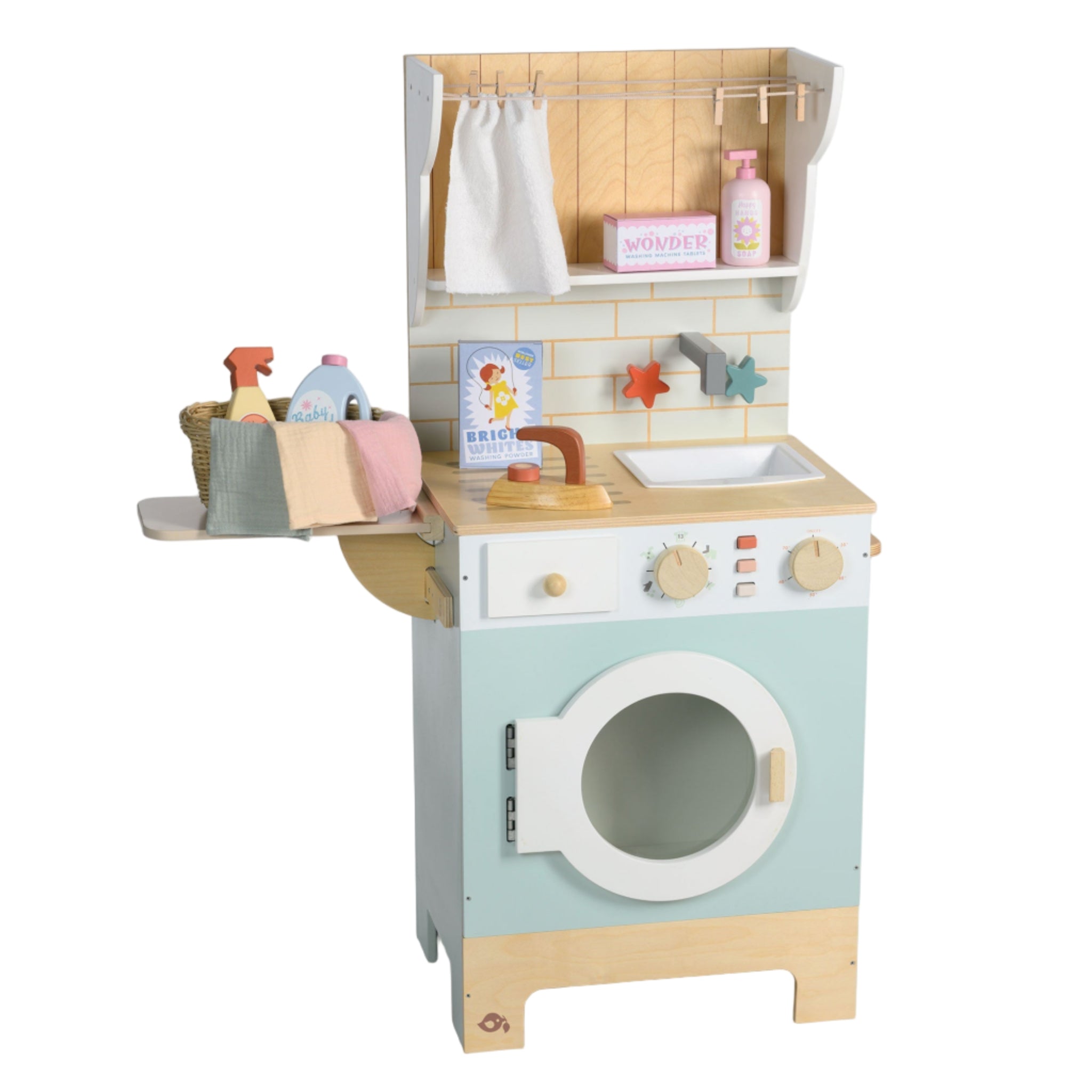 The Tenderleaf Laundrette is a charming wooden playset that brings laundry day to life. Featuring a washer, ironing board, clothesline, and peg accessories, it encourages imaginative role play and fine motor skills. Beautifully crafted from sustainable wood with soft, pastel details for endless fun.