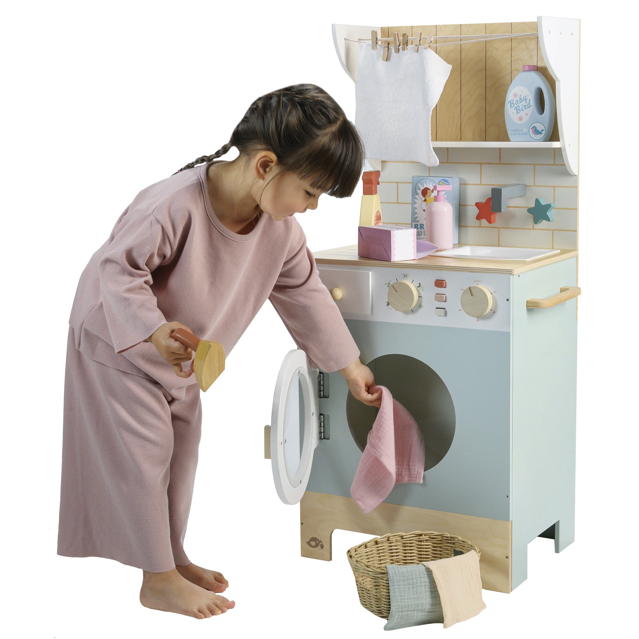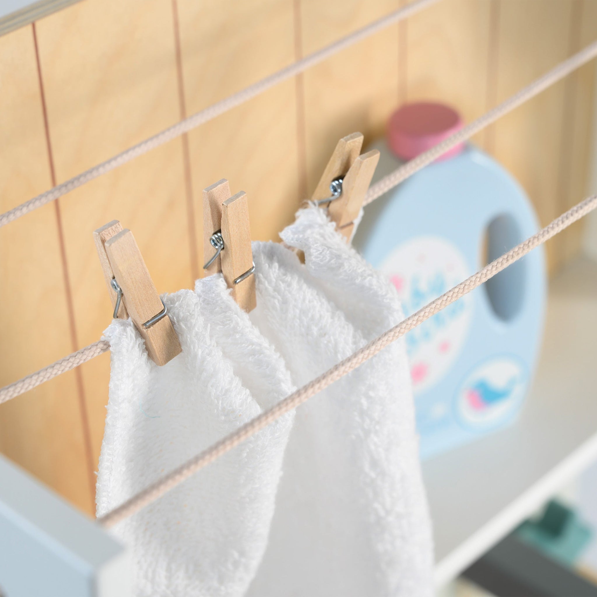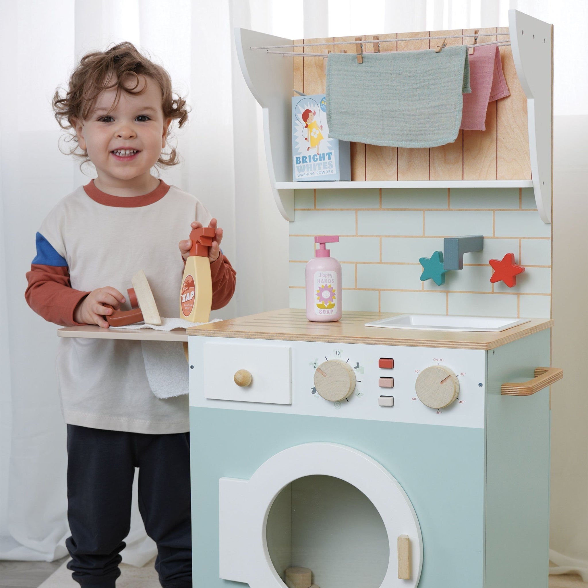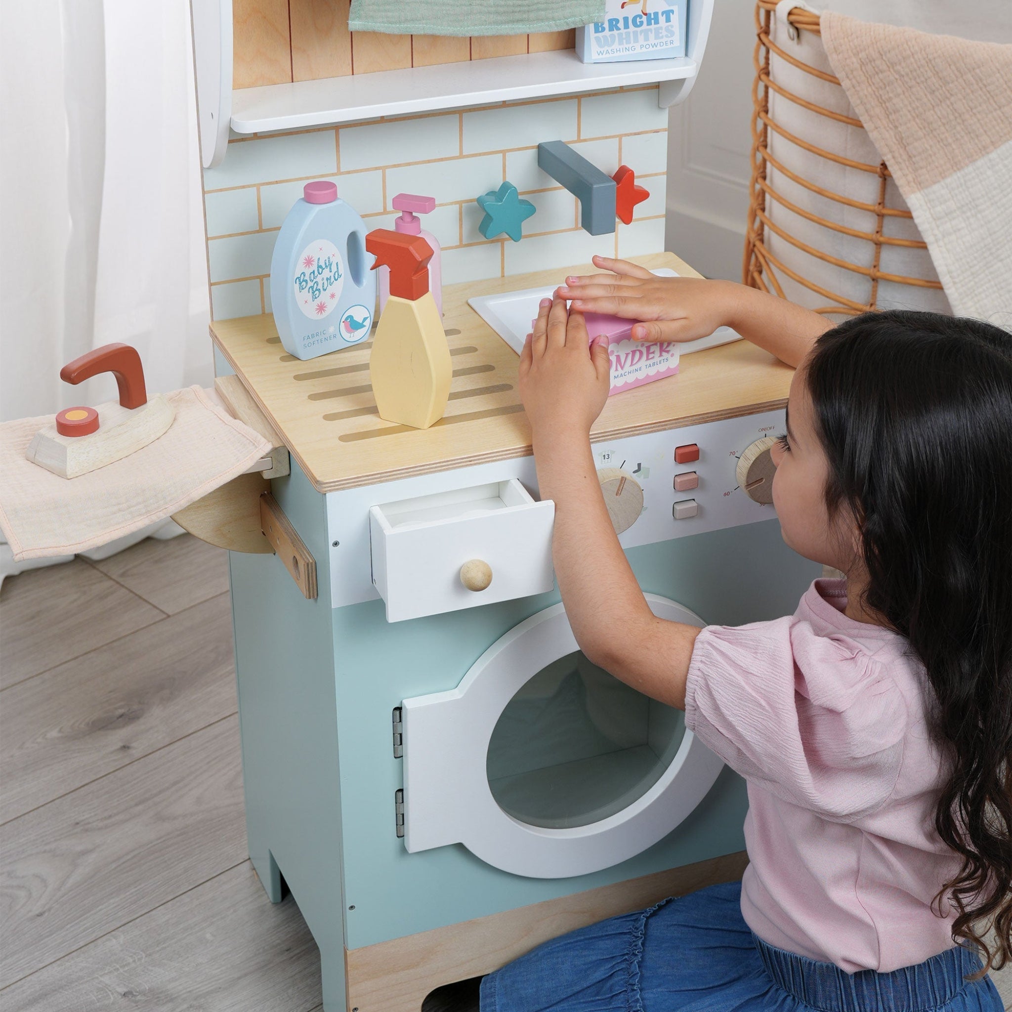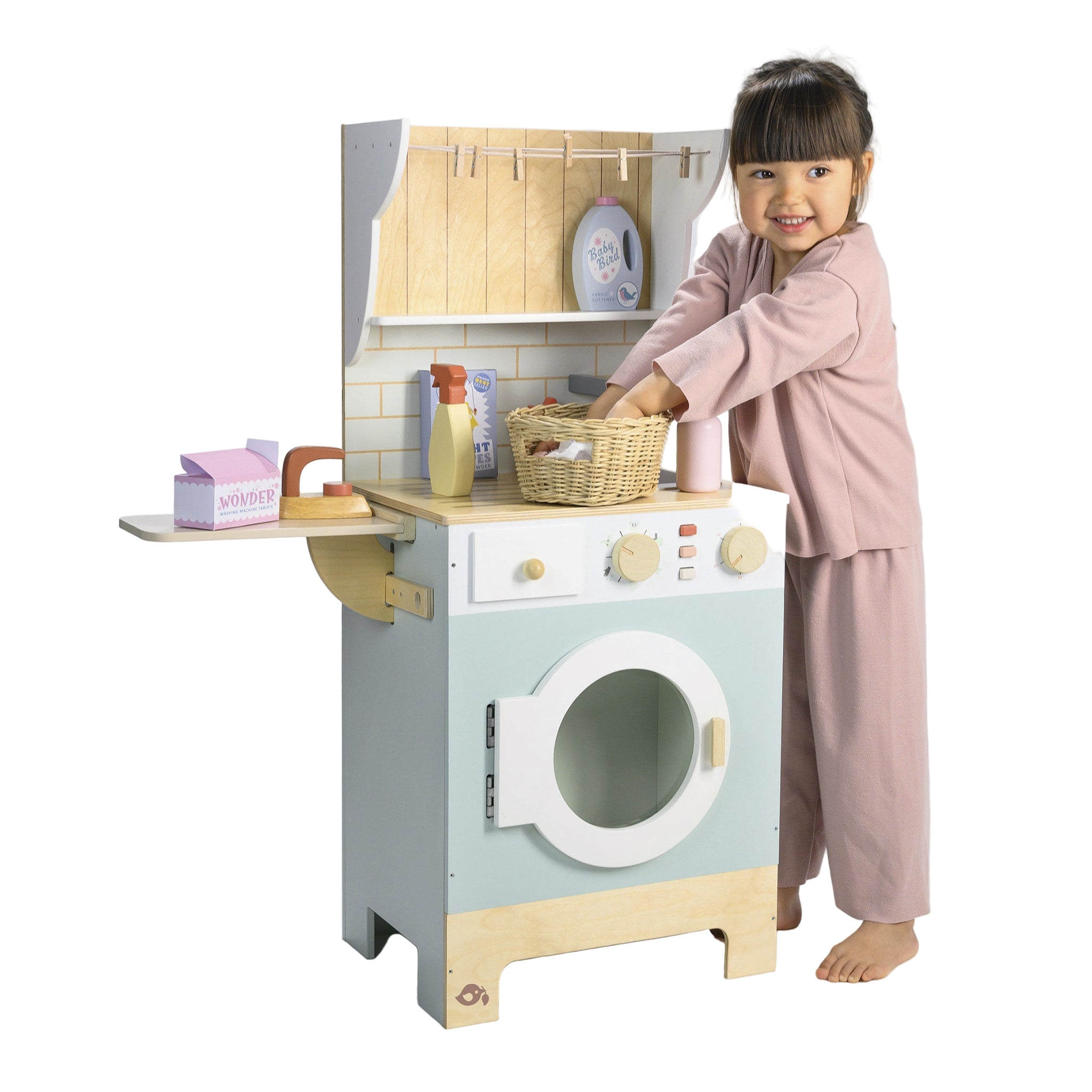 The Tenderleaf Laundrette is a charming wooden playset that brings laundry day to life. Featuring a washer, ironing board, clothesline, and peg accessories, it encourages imaginative role play and fine motor skills. Beautifully crafted from sustainable wood with soft, pastel details for endless fun.