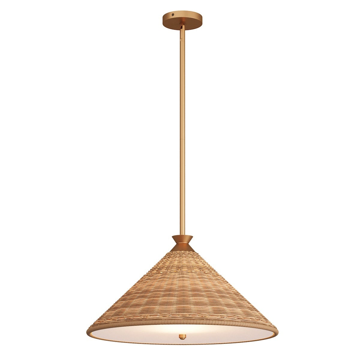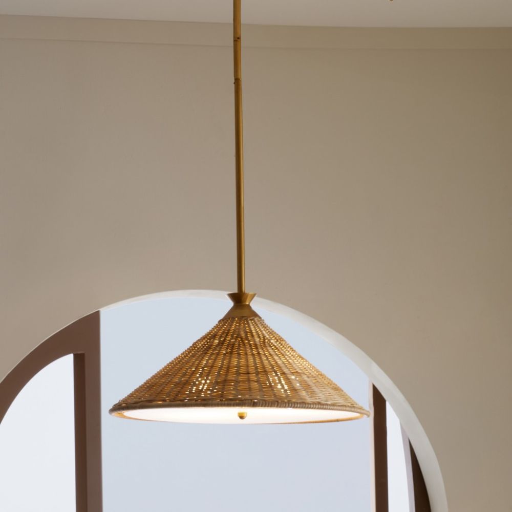 A stylish extension of the Terrace collection, this pendant features natural handwoven rattan that evokes a refined Caribbean charm. Gold-finished iron accents highlight its playful silhouette, adding warmth and sophistication to any space.