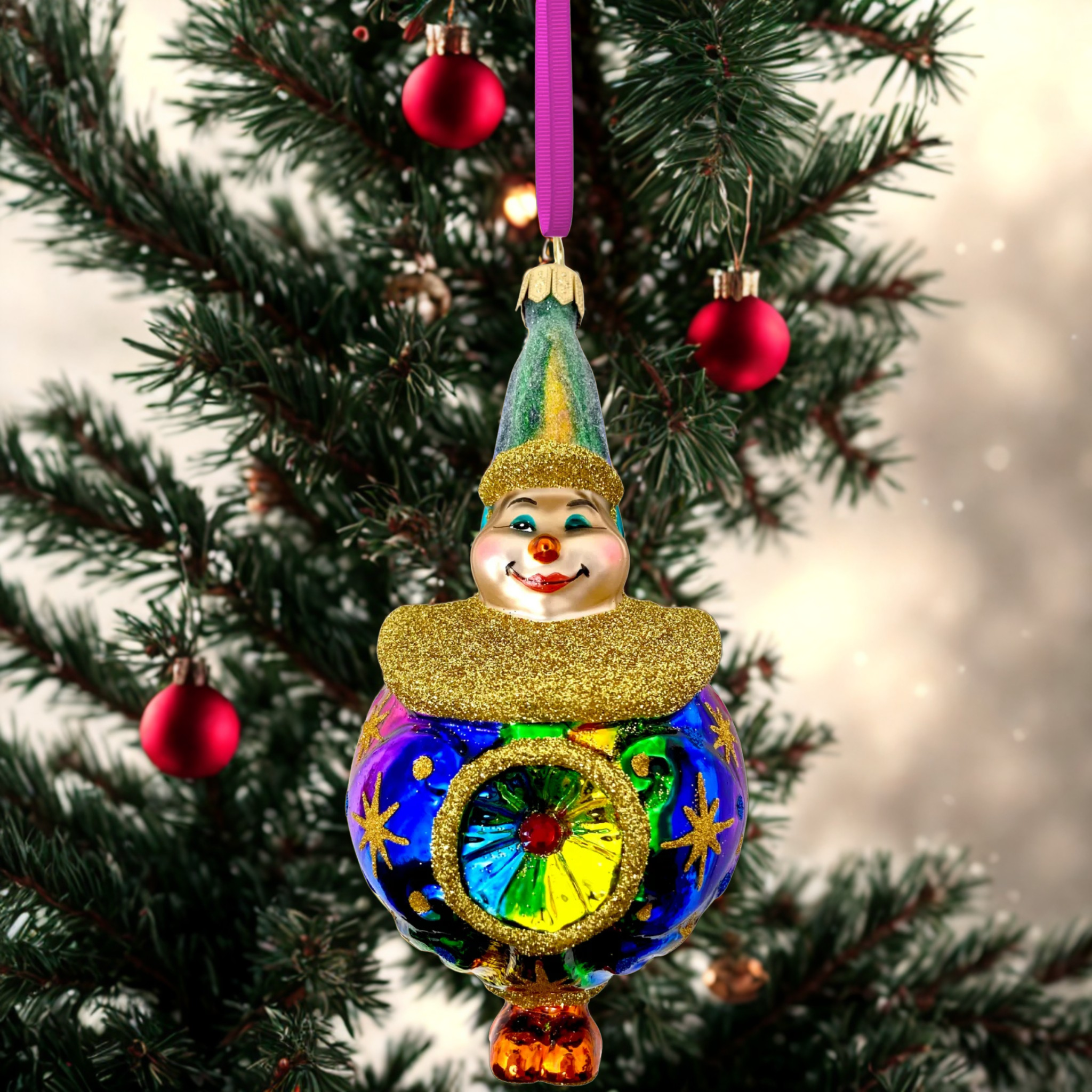 This charming hand-blown ornament features a playful clown, adorned in vibrant colors and sparkling details, capturing the magic and merriment of the circus. A cheerful addition to any holiday collection.