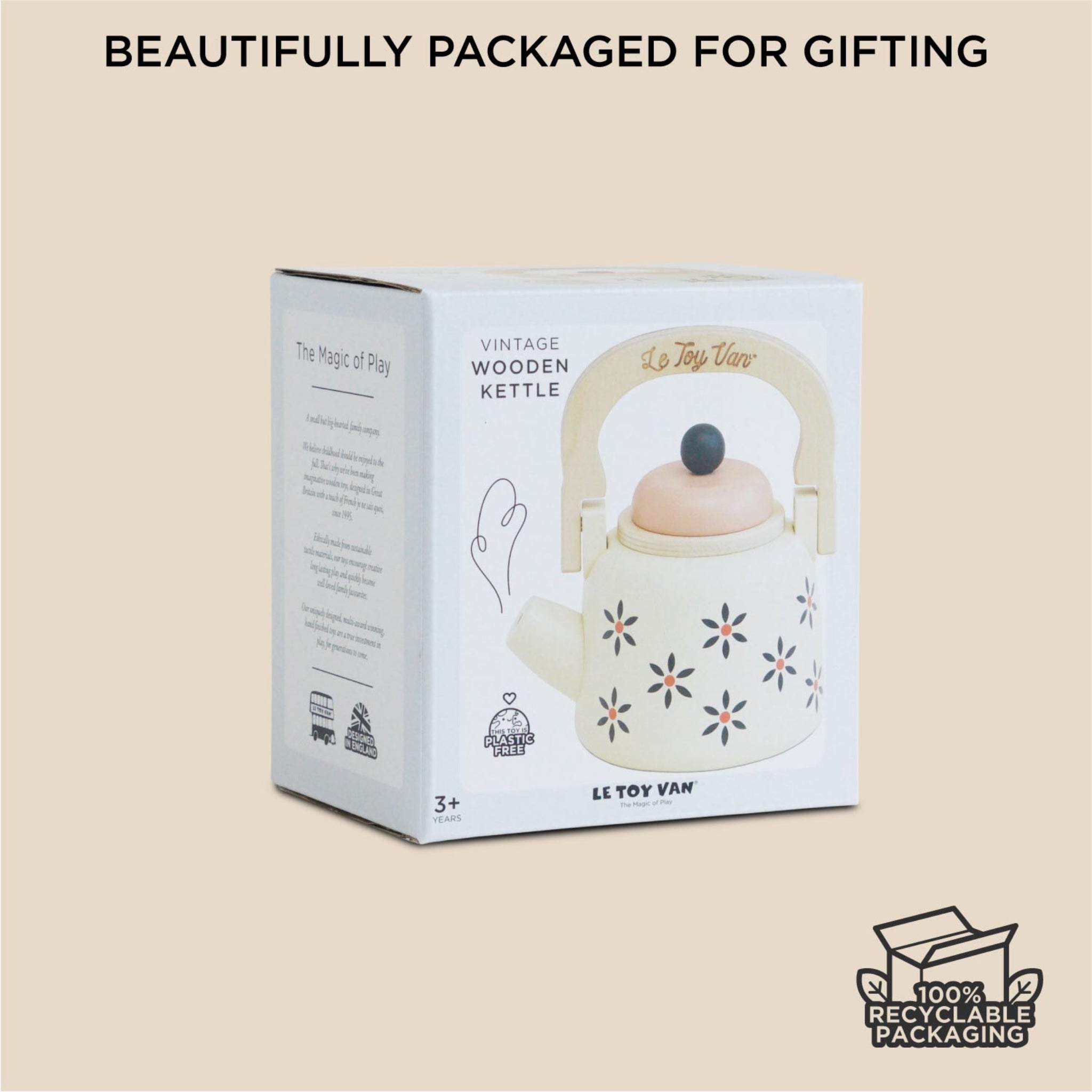 The Wooden Kettle, a charming playtime companion that combines creativity and imagination! Adorned with delicate flora artwork, this toy exudes a timeless beauty that will captivate all young minds. Painted in a non-toxic water-based cream colour for your little ones, this toy is both safe and environmentally friendly. Crafted from FSC® certified wood, the kettle features a pouring handle, complete with engraved details. The removable lid enhances the interactive aspect, allowing children to simulate pouring and brewing their favorite drinks. Furthermore, this toy is proudly plastic-free, promoting sustainability and minimizing environmental impact. Bring joy to your child's playtime while cultivating their love for nature and eco-friendly practices with this truly special Wooden Kettle Toy.