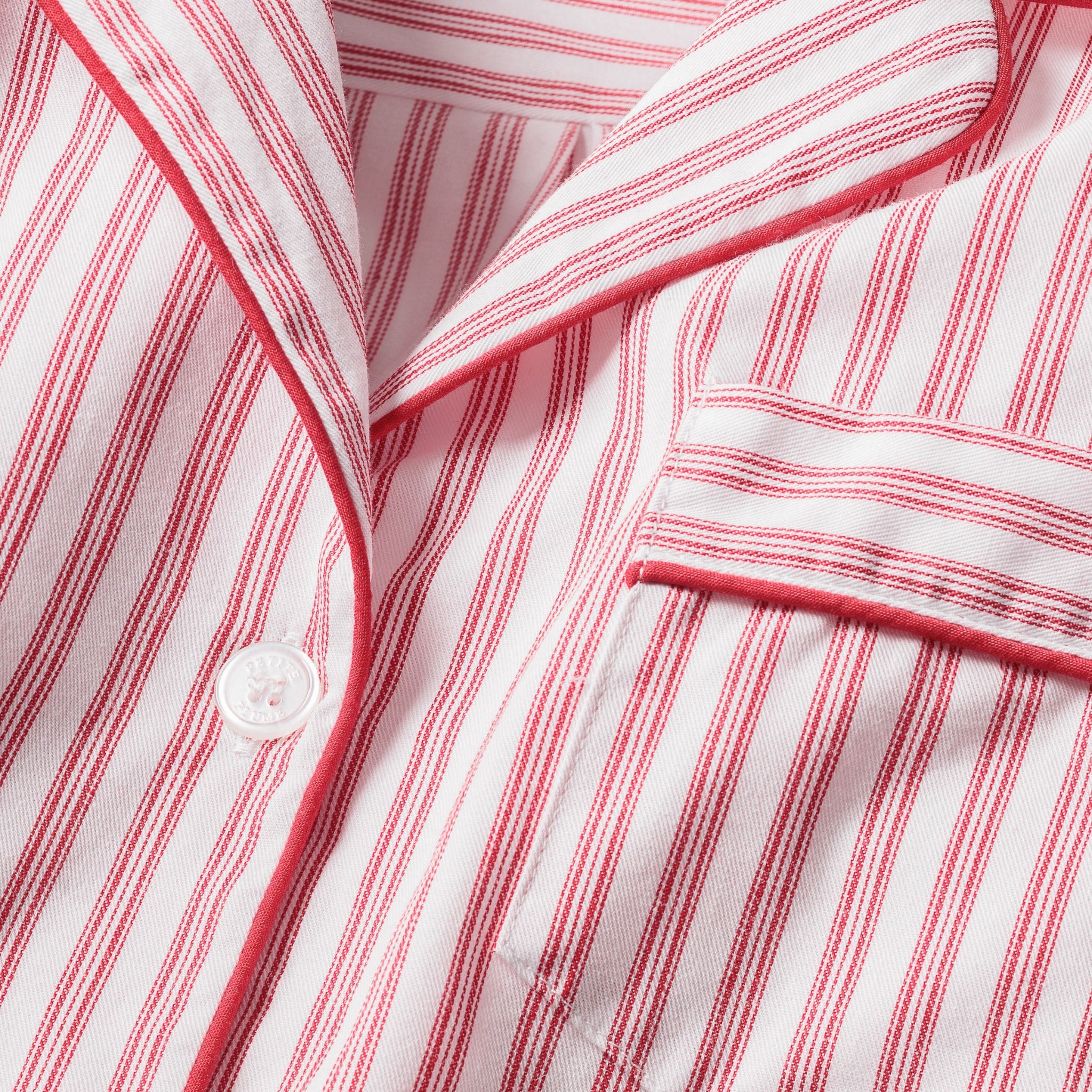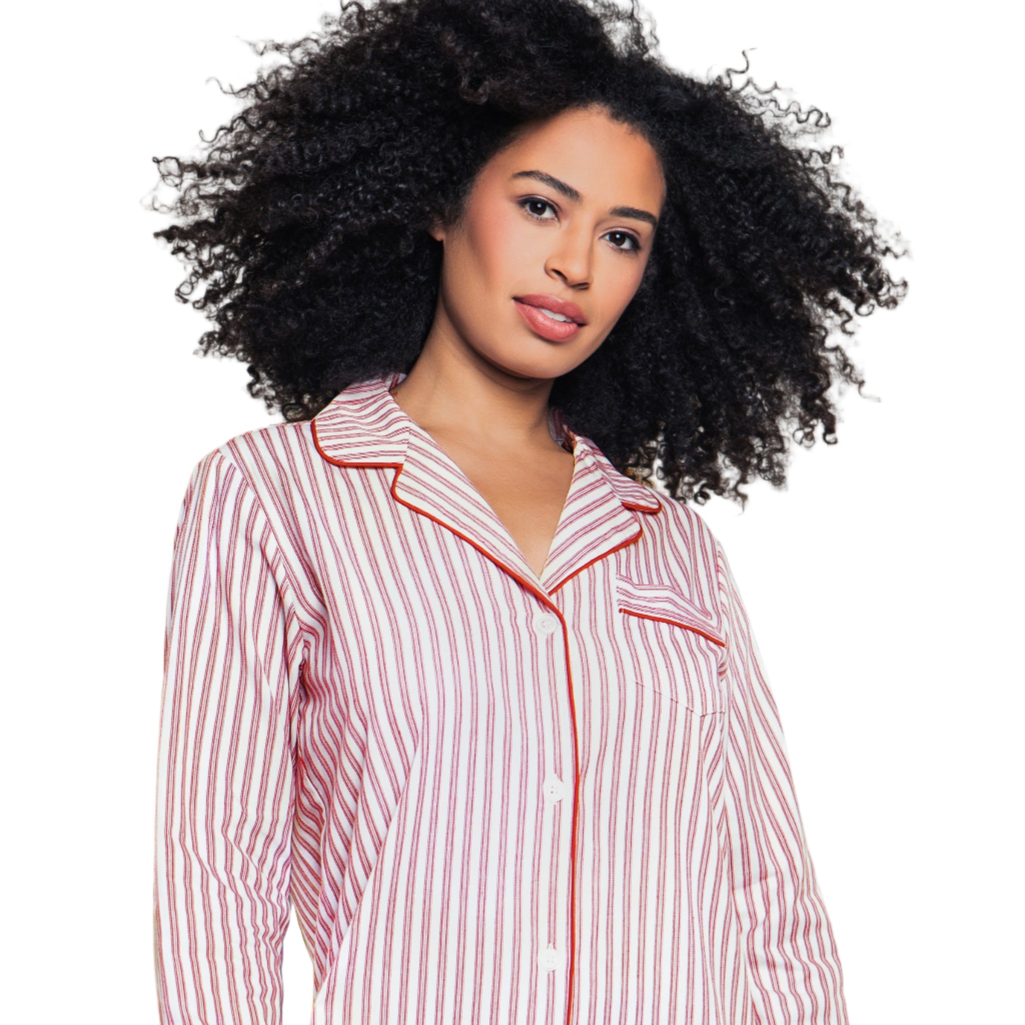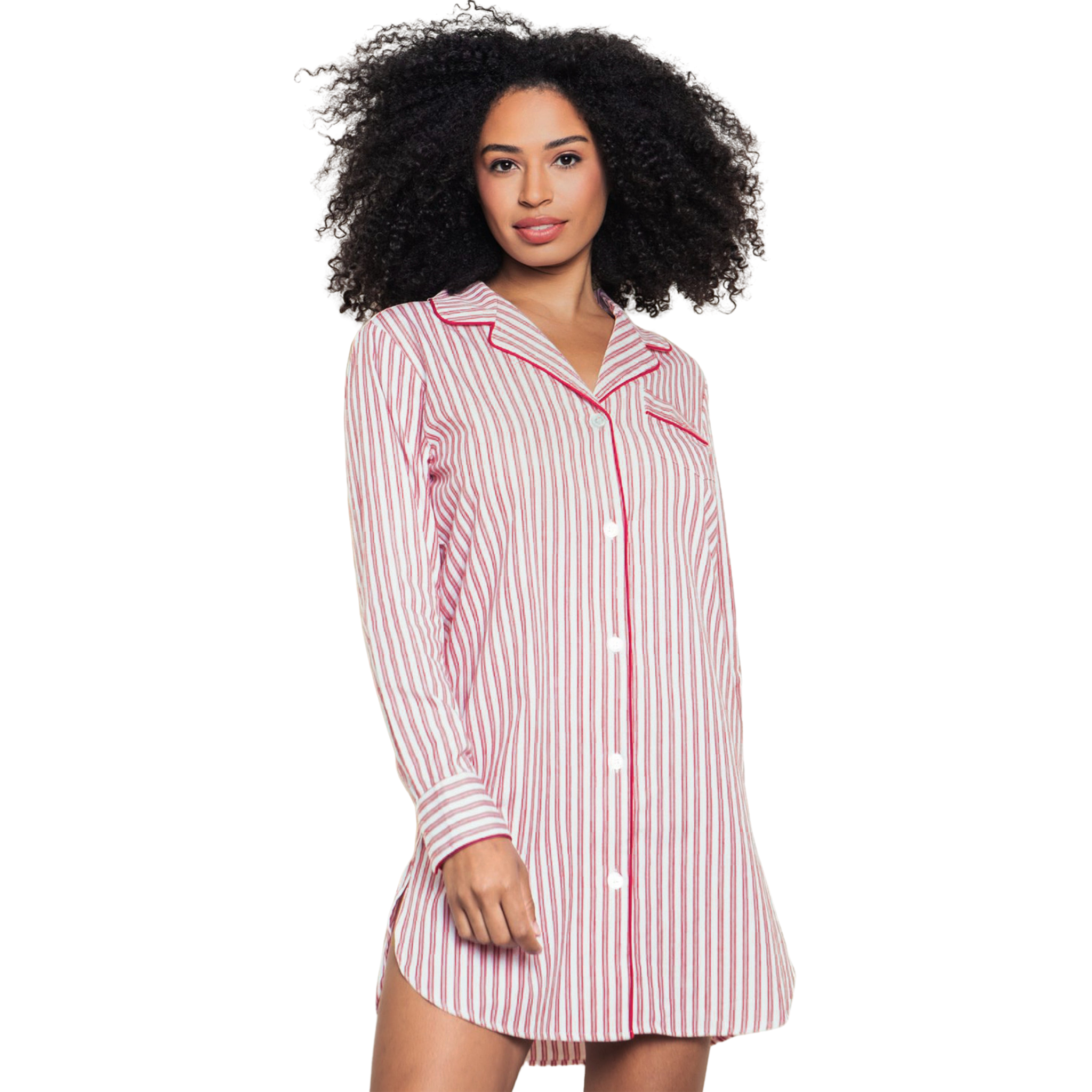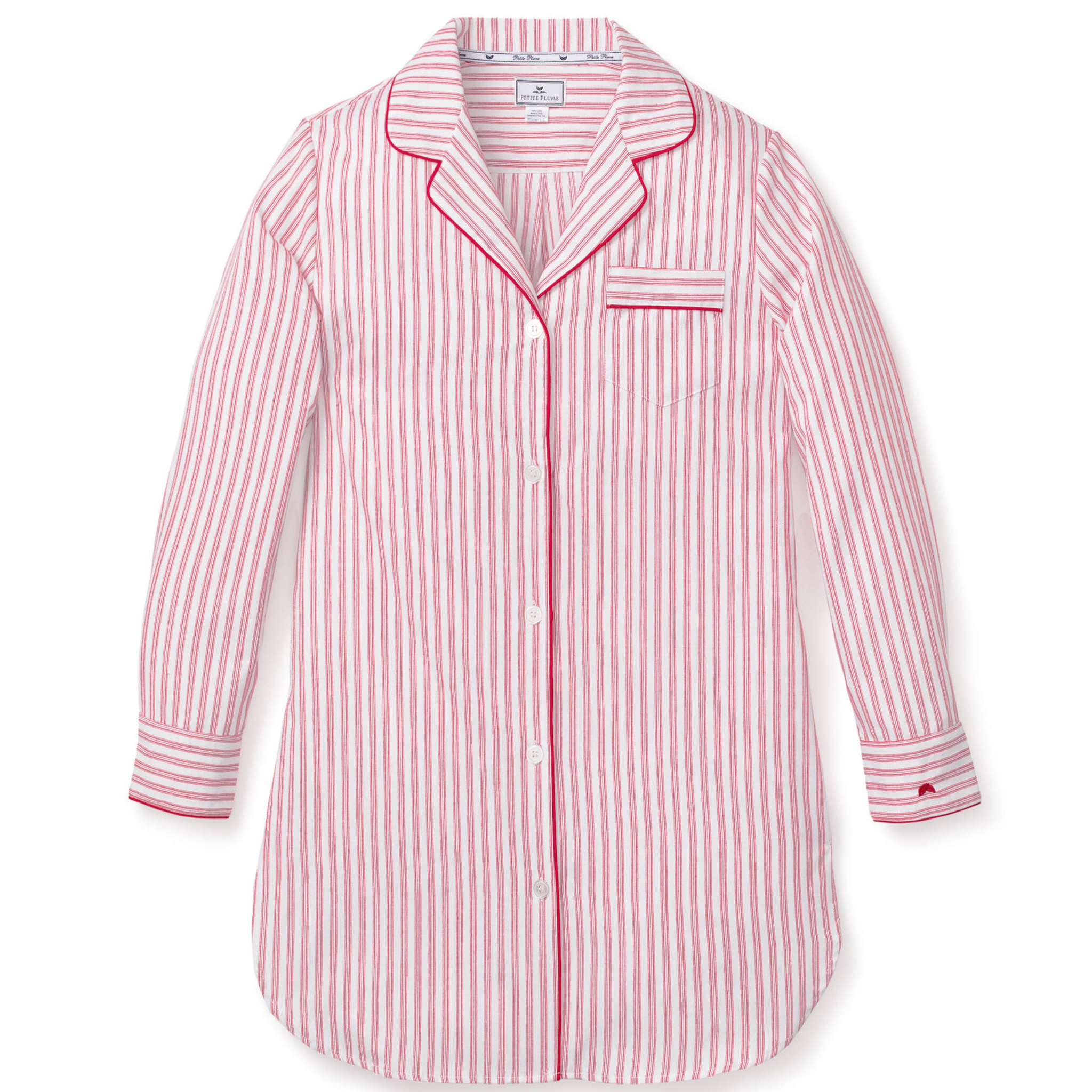 A new take on a classic pattern, with no frills just clean, crisp lines. This gorgeous Antique Red Ticking nightshirt is a perfect fit! This exquisite nightshirt is trimmed with red piping and finished with pearl buttons. The fabric is made from 100% of the finest quality cotton. It is yarn-dyed to prevent fade and brushed for added softness, making the sleepwear feel absolutely luxurious. Machine washable, our sleepwear gets cozier with each wash. You will be tucked in luxury and off to dreamland. Bonne nuit.