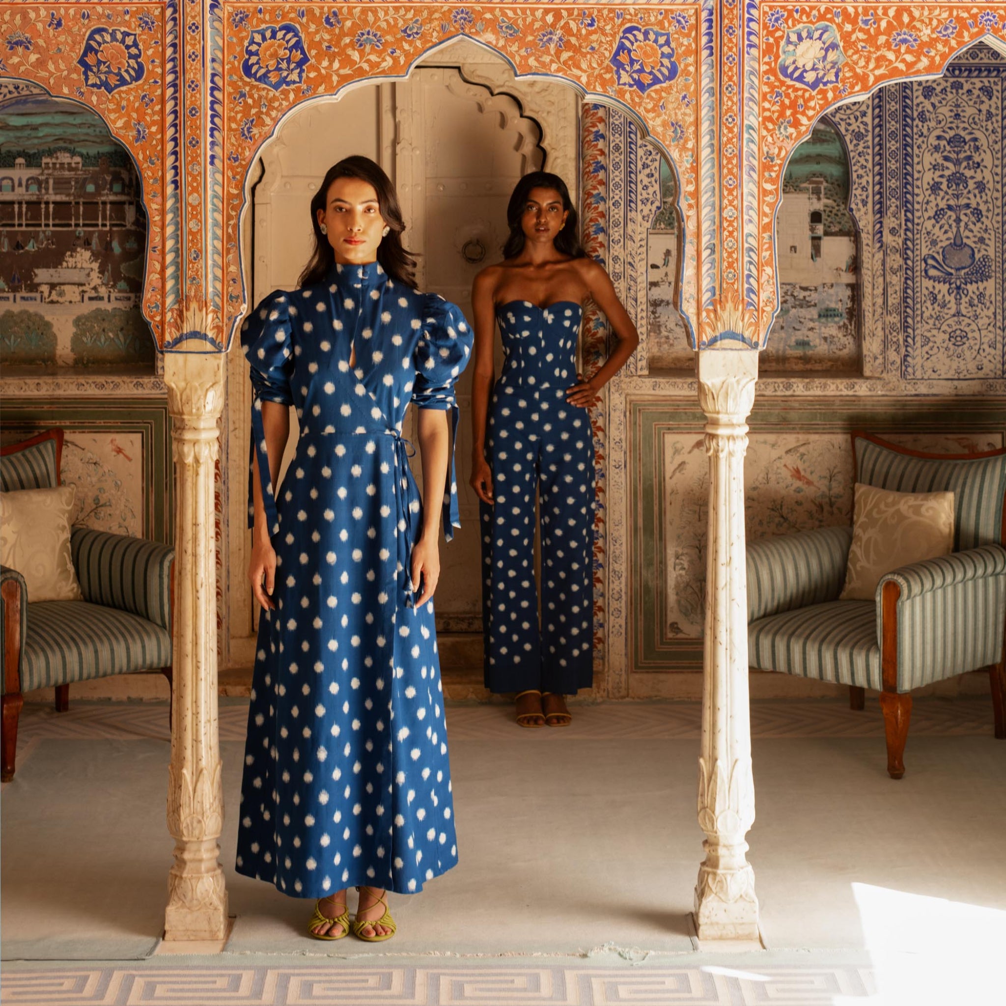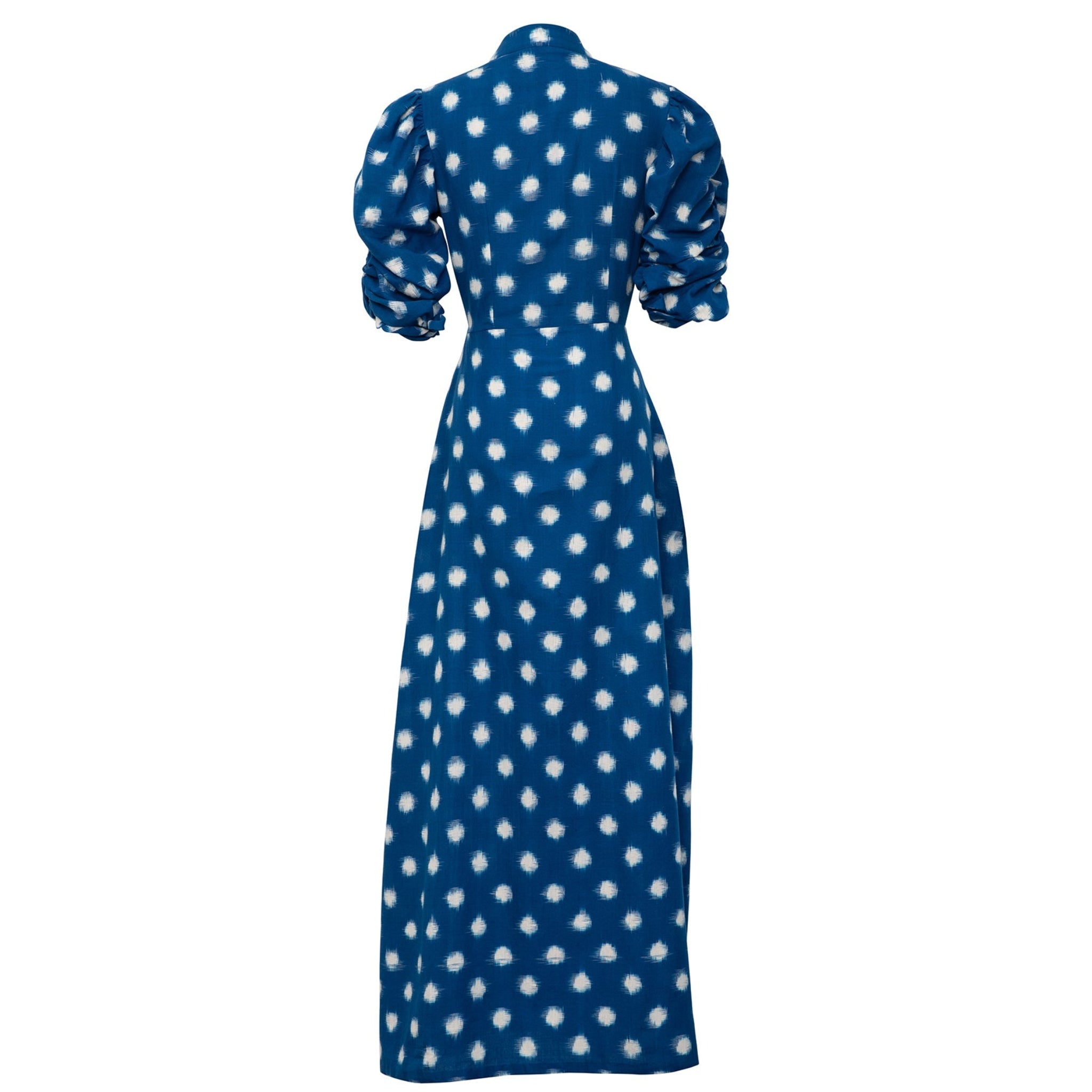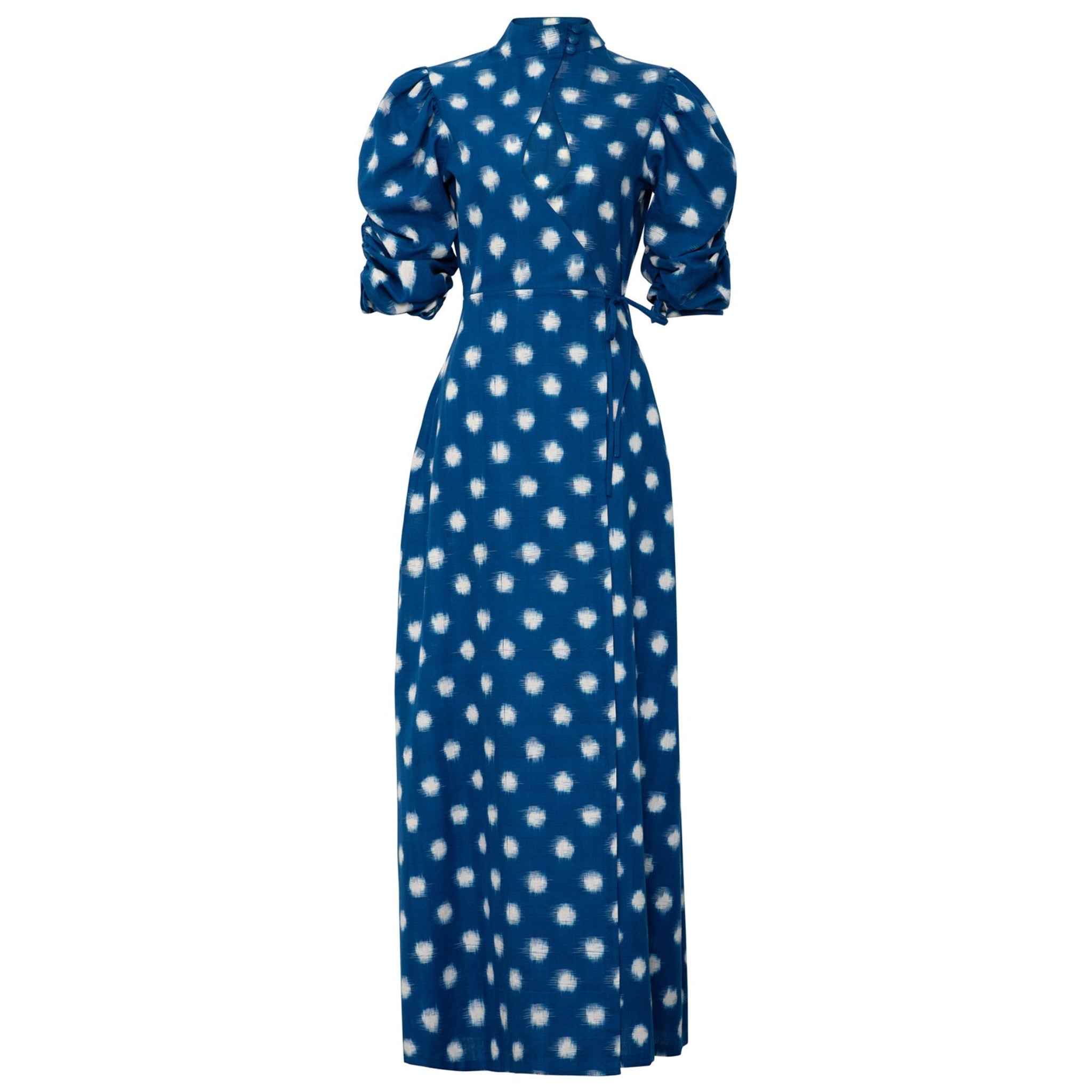 The Campo dress boasts a sophisticated and seductive design, featuring a wrap mandarin collar and deep geometric neckline. It is crafted from double Ikat fabric from India, with a captivating white dot-like pattern against a blue background. The gathered puff sleeves add a touch of elegance to the overall look.