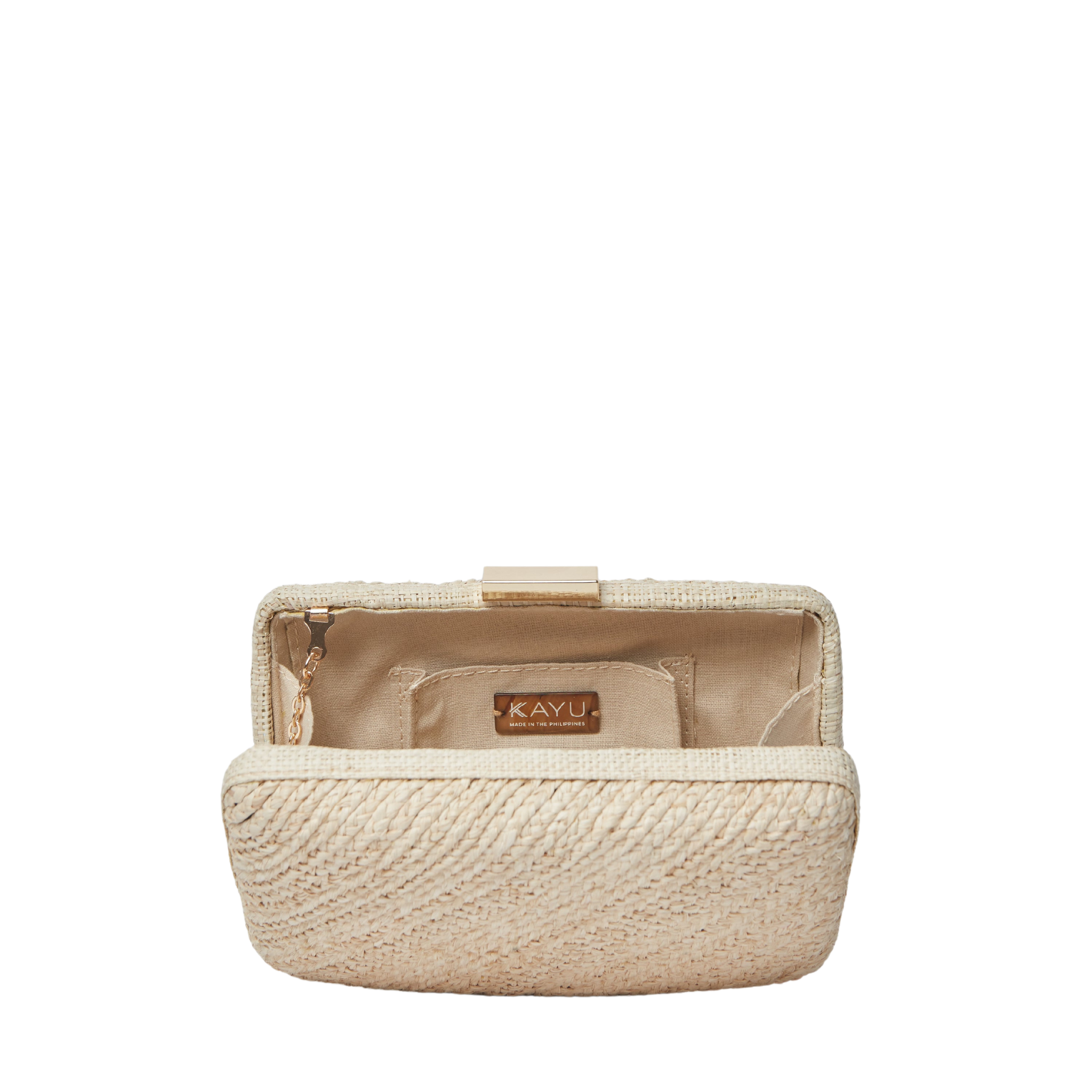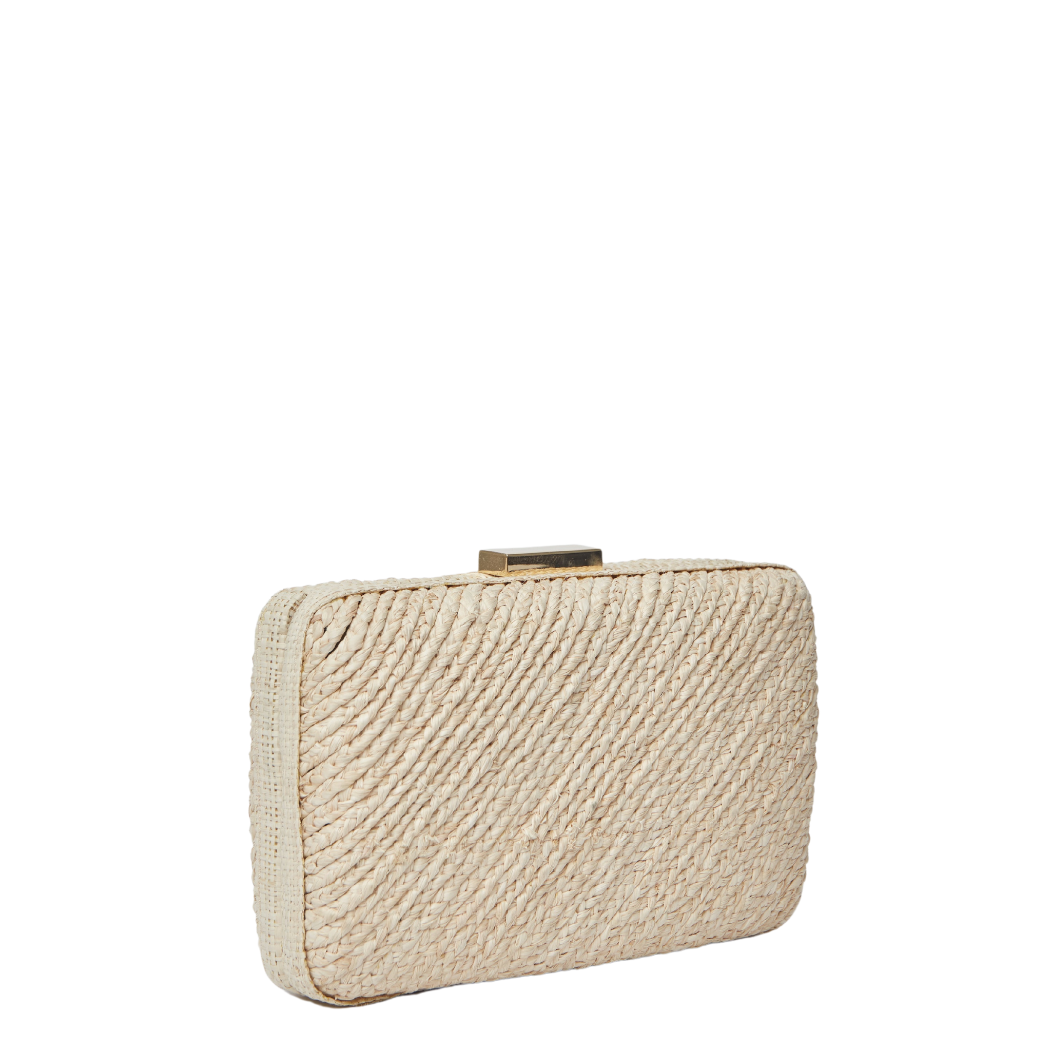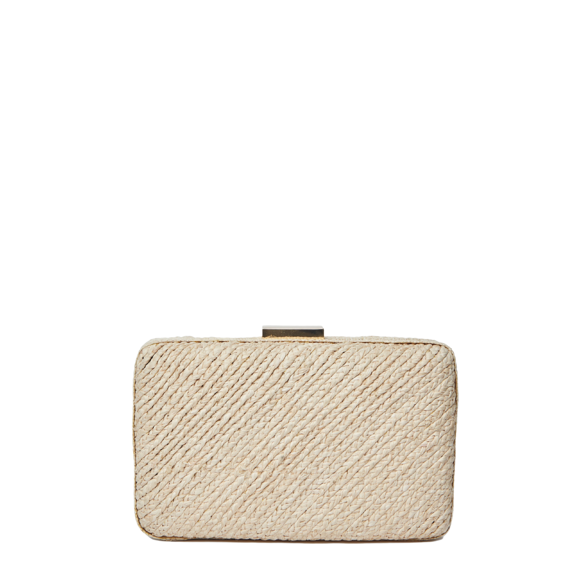 Intricately braided raffia, topped with a delicate gold bar, for a clutch that blends artistry and sustainability.