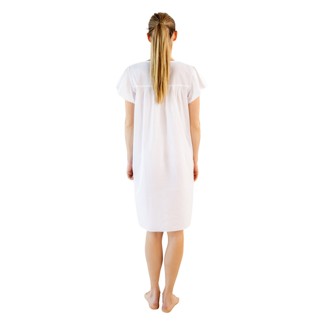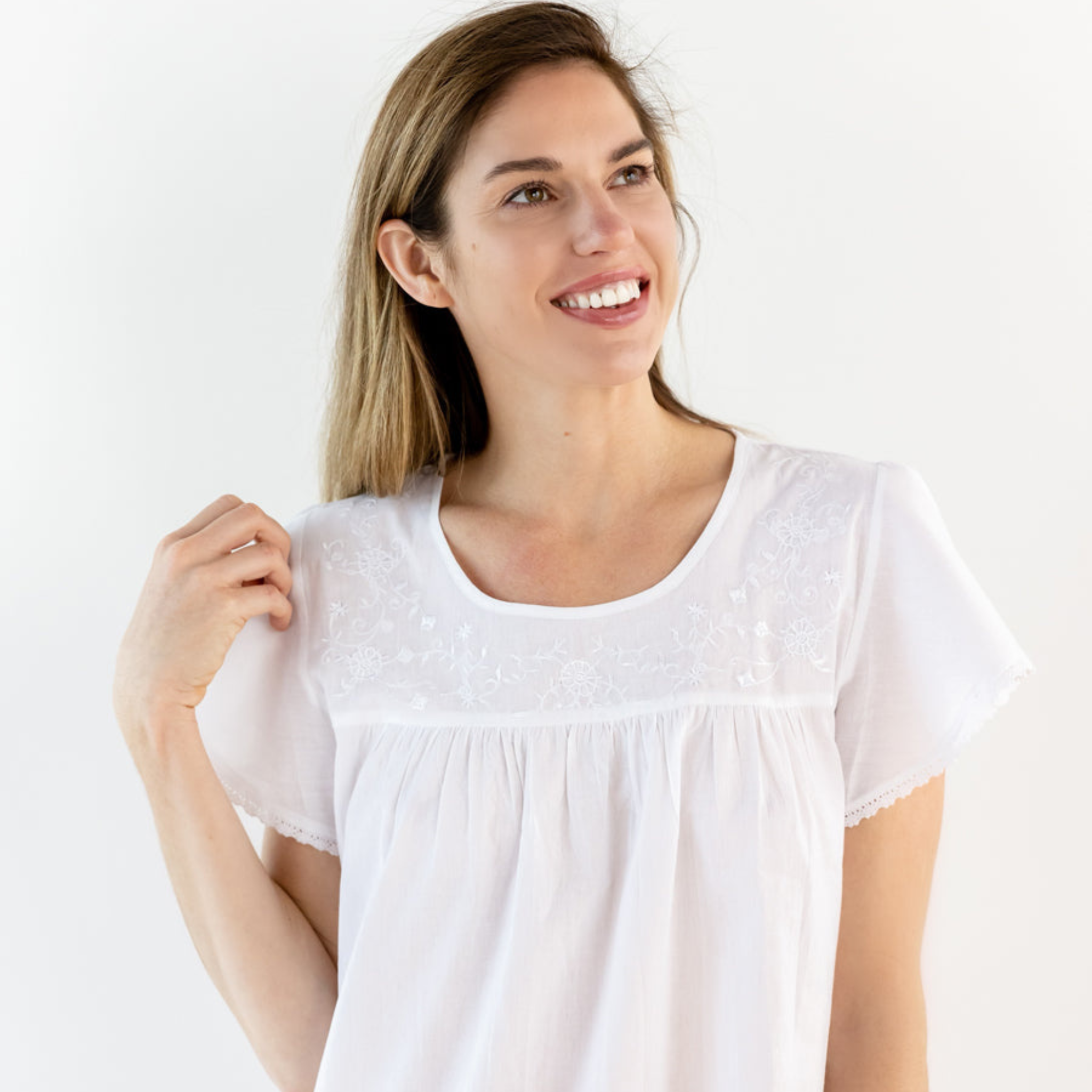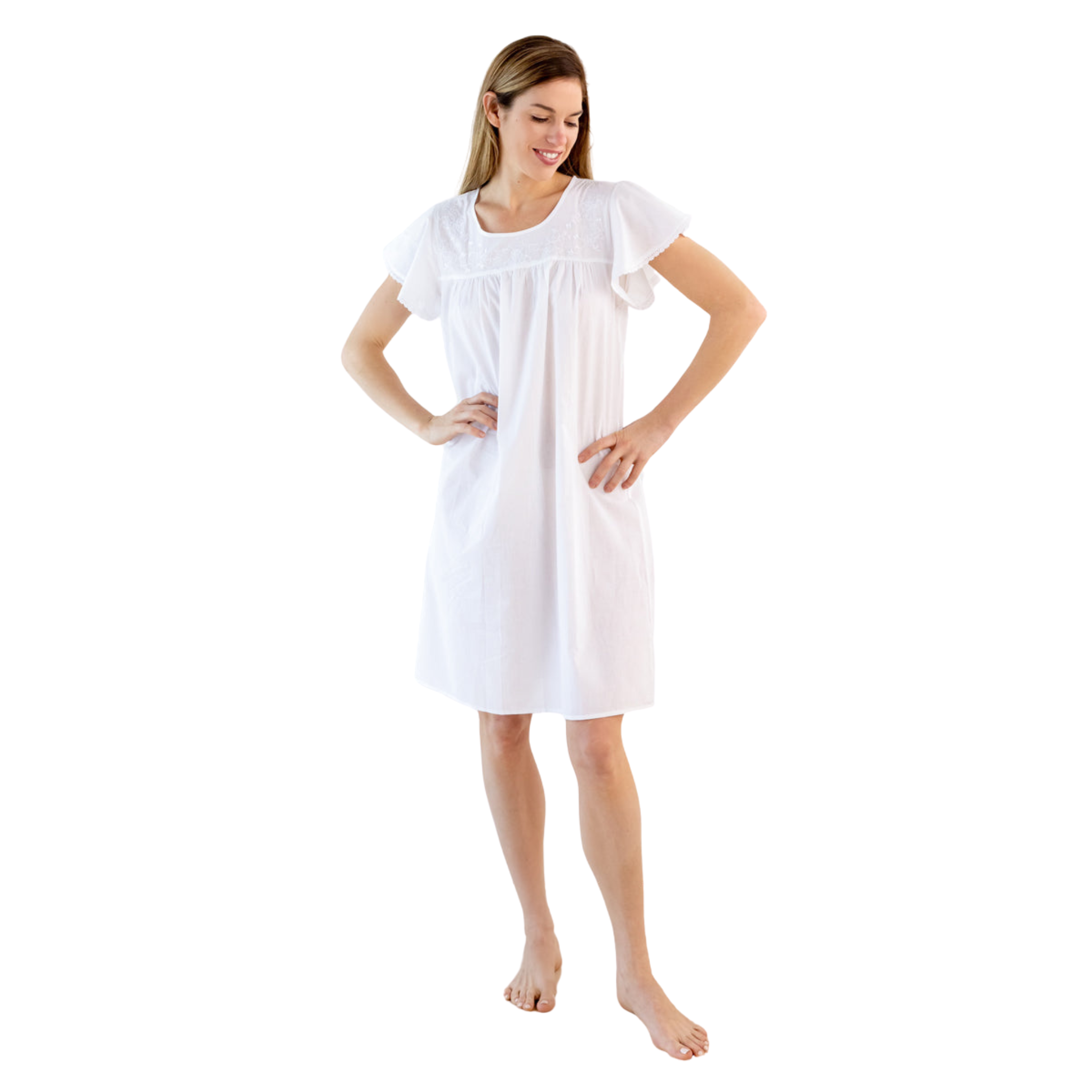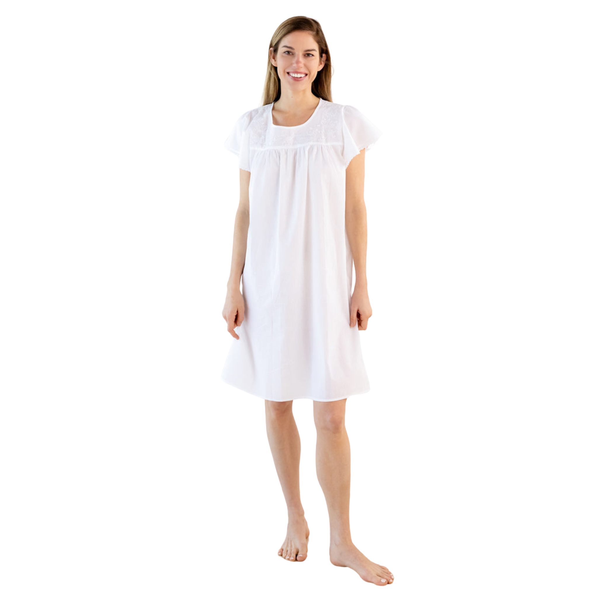 Our Celeste Nightgown is a darling new style with flutter sleeves and white floral embroidery. The nightgown features a flattering neckline with lovely white flowers along the bodice. It falls just below the knee and is extremely comfortable, made from fine quality 100% cotton lawn. A perfect year round nightgown that will help you get a good night's sleep.