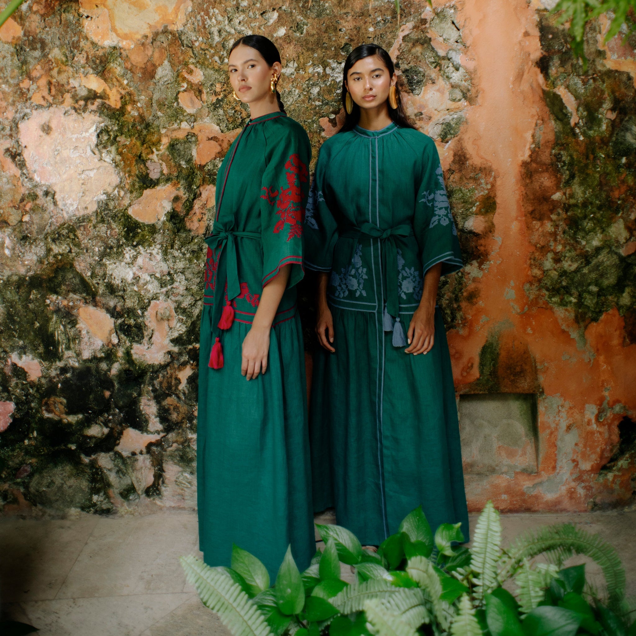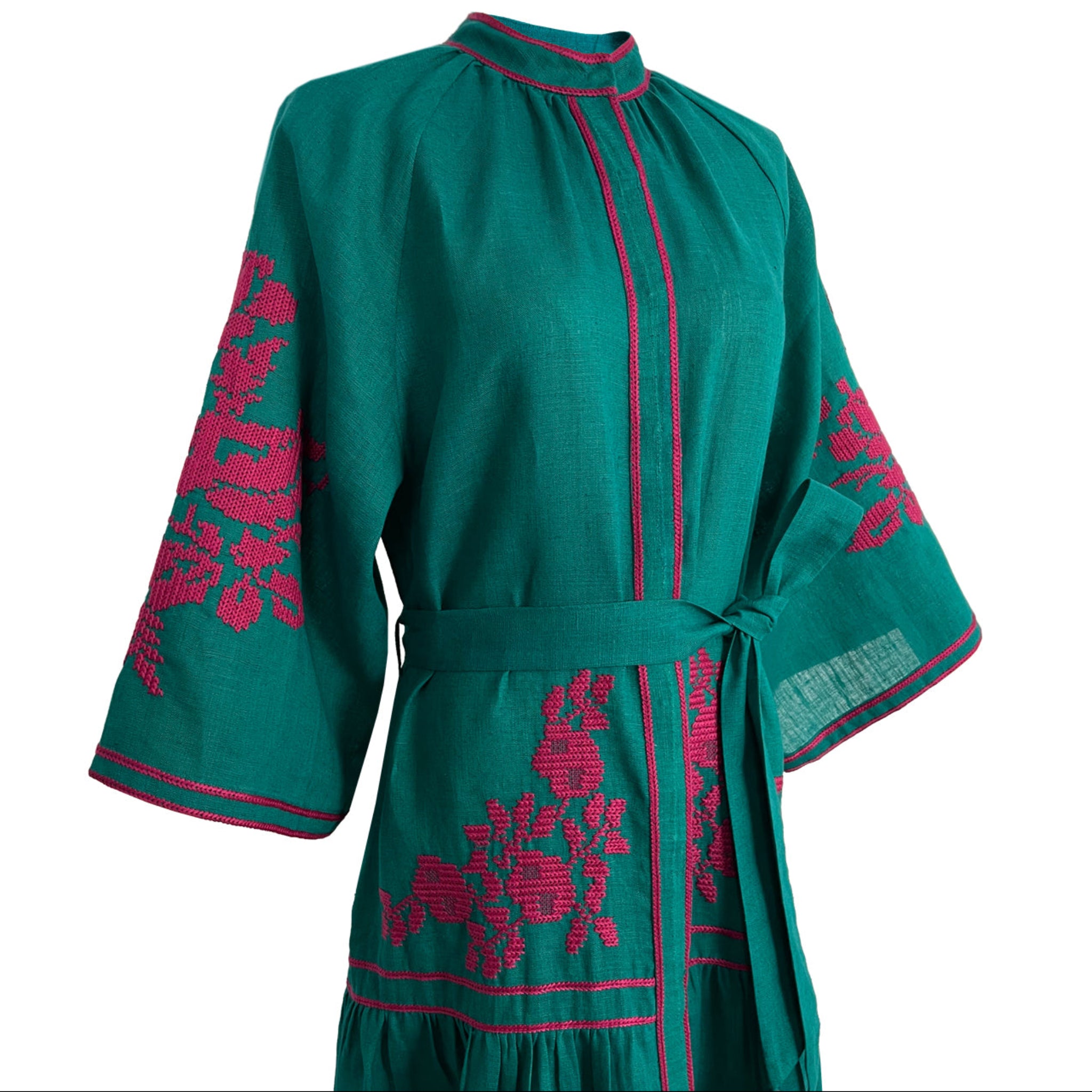 Handwoven in the southern region of India using luxurious, crisp linen, this elegant Emerald Swan Dress is the perfect addition to your summer wardrobe. Boasting bell-shaped raglan sleeves adorned with contrasting sky fascia abstract floral embroidery, a loose fit, a charming tasseled belt, a Nehru collar, and full length, it exudes sophistication and exclusivity.