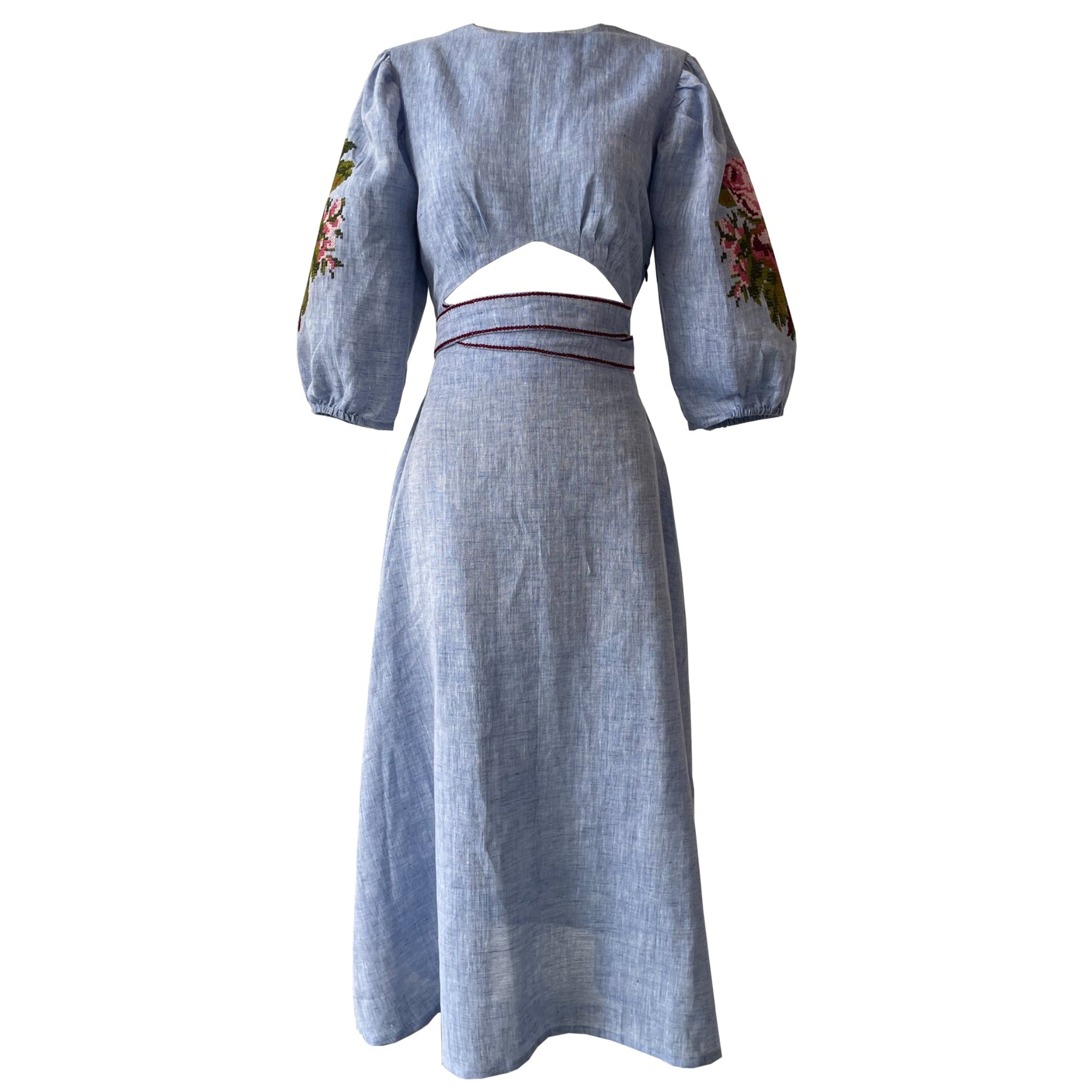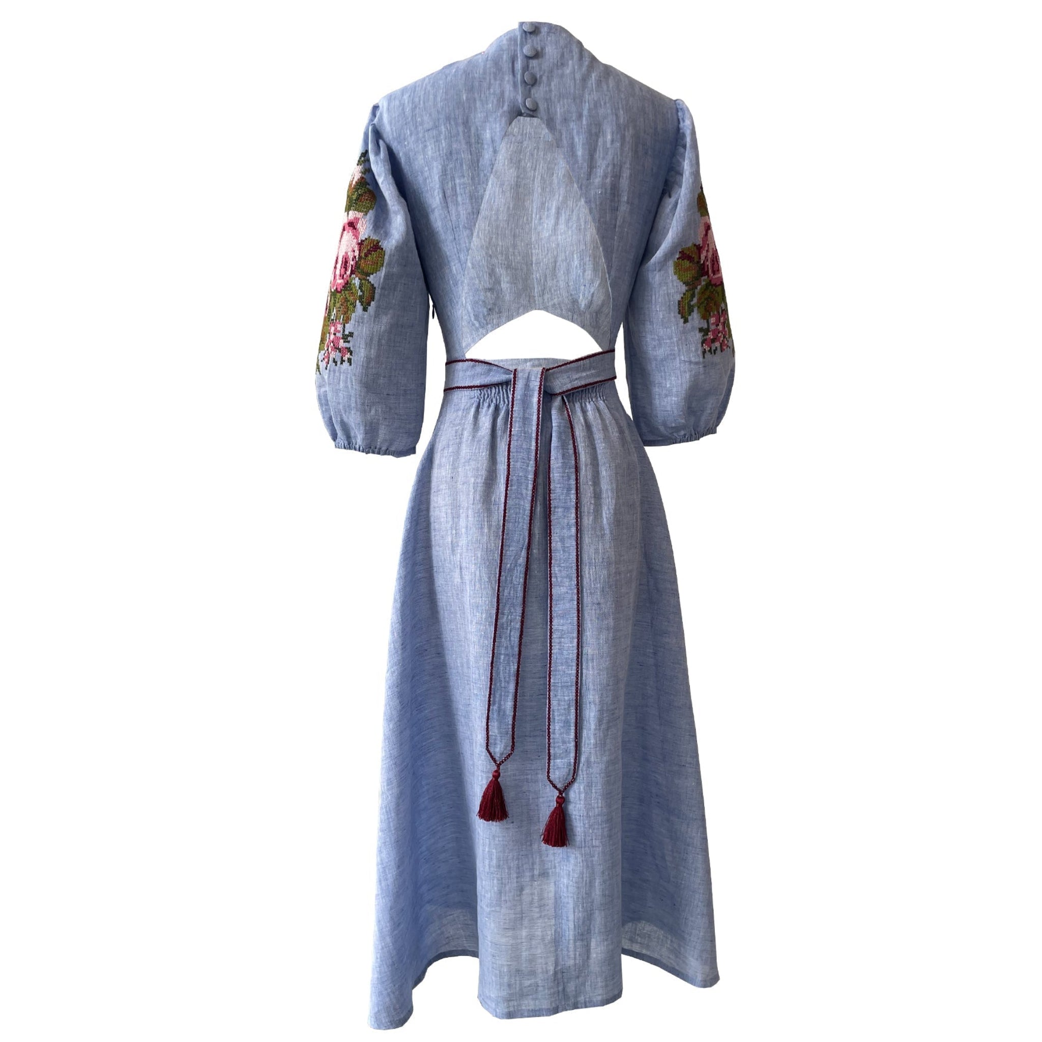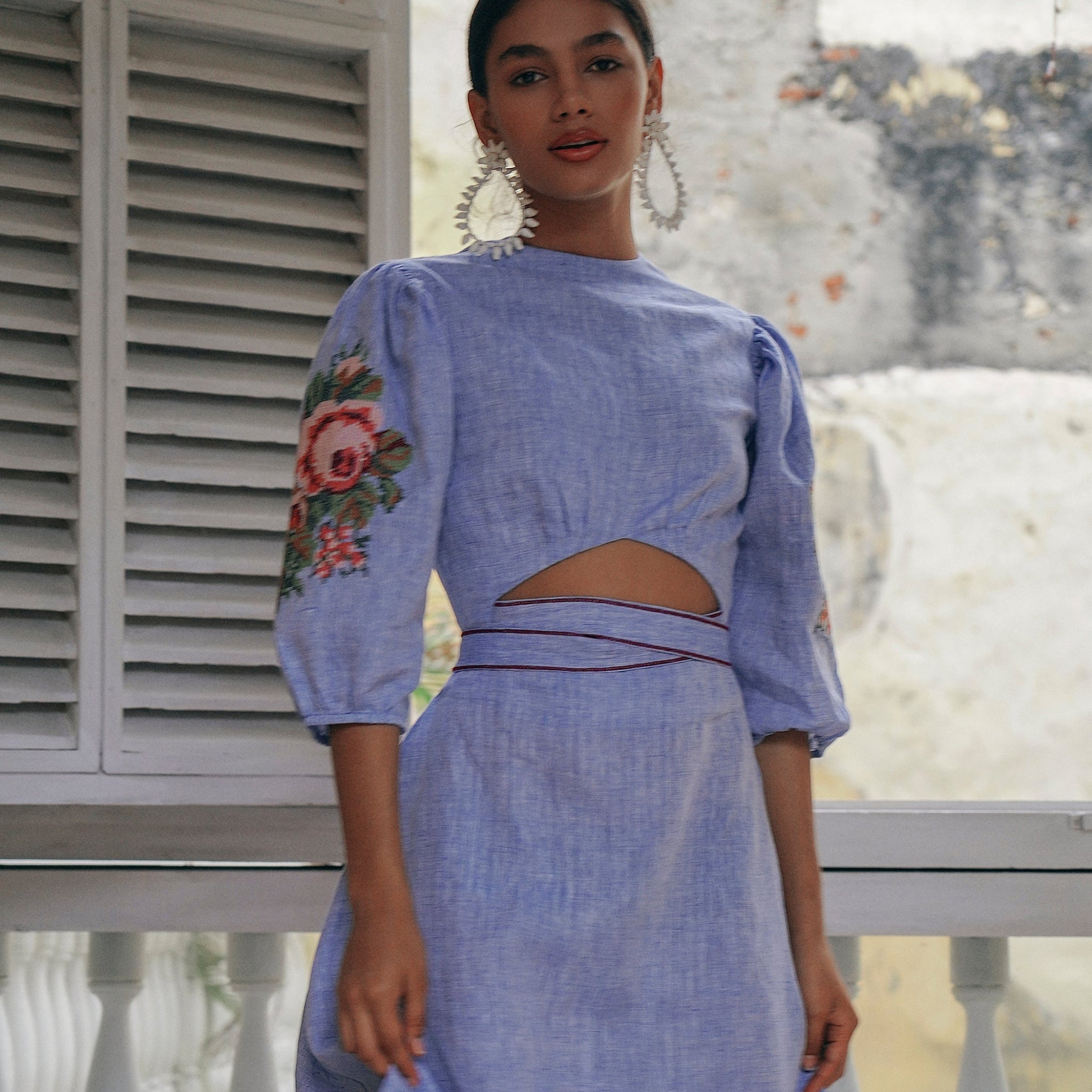 The Forget-me-not Dress is a kaftan-style dress made of handwoven linen from the South of India. It features floral cross-stitch hand-embroidery on sleeves, front and back openings at the waist, and a tasseled belt.