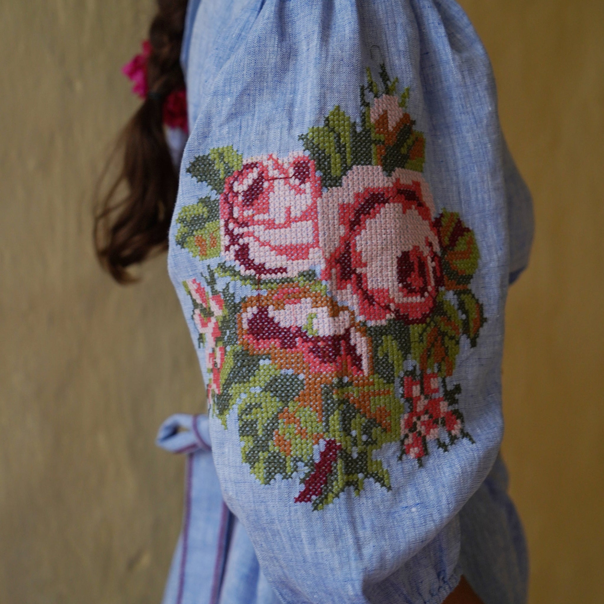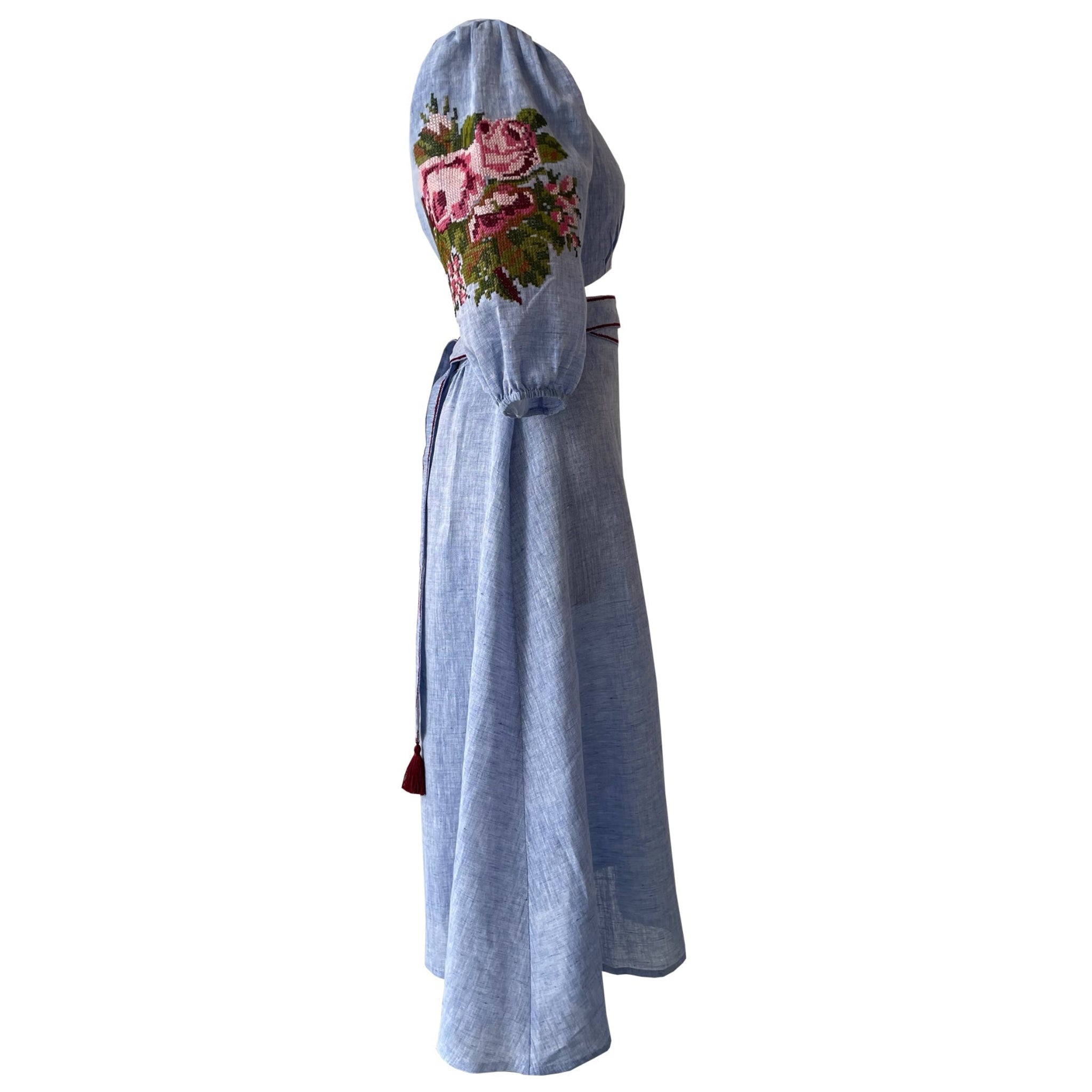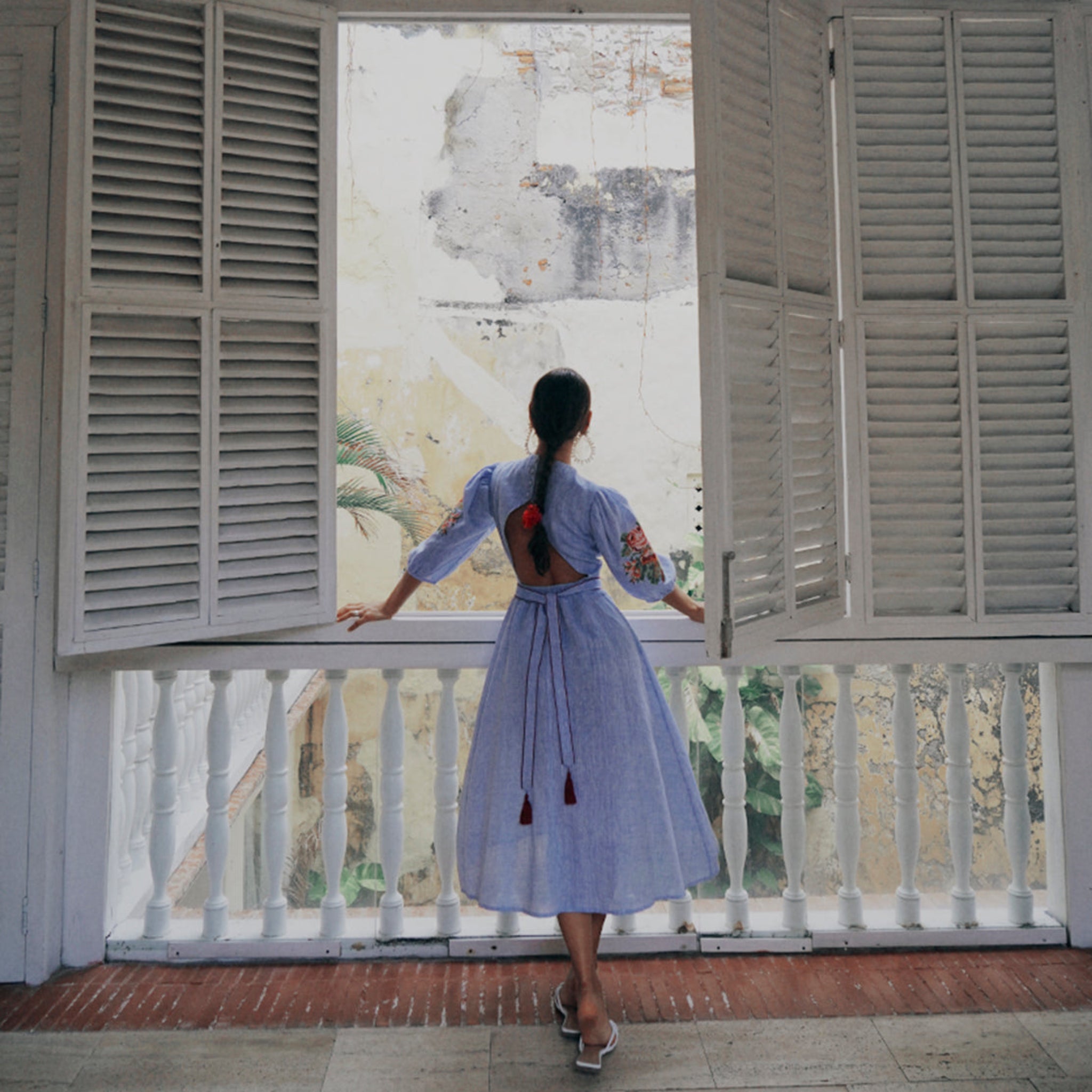 The Forget-me-not Dress is a kaftan-style dress made of handwoven linen from the South of India. It features floral cross-stitch hand-embroidery on sleeves, front and back openings at the waist, and a tasseled belt.