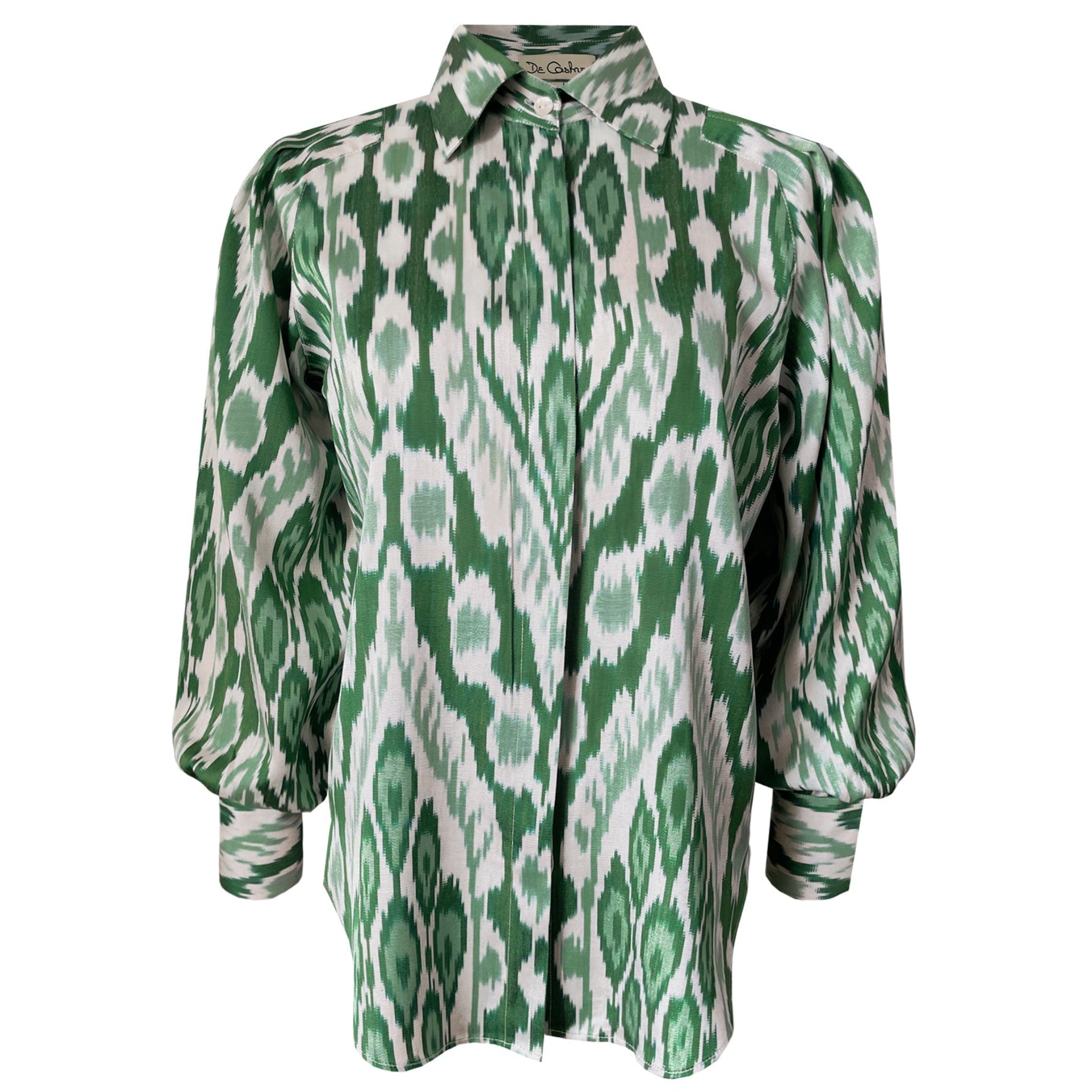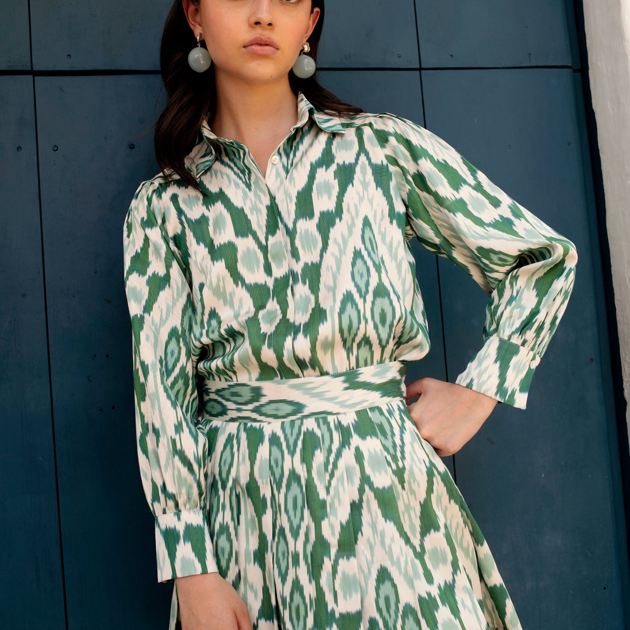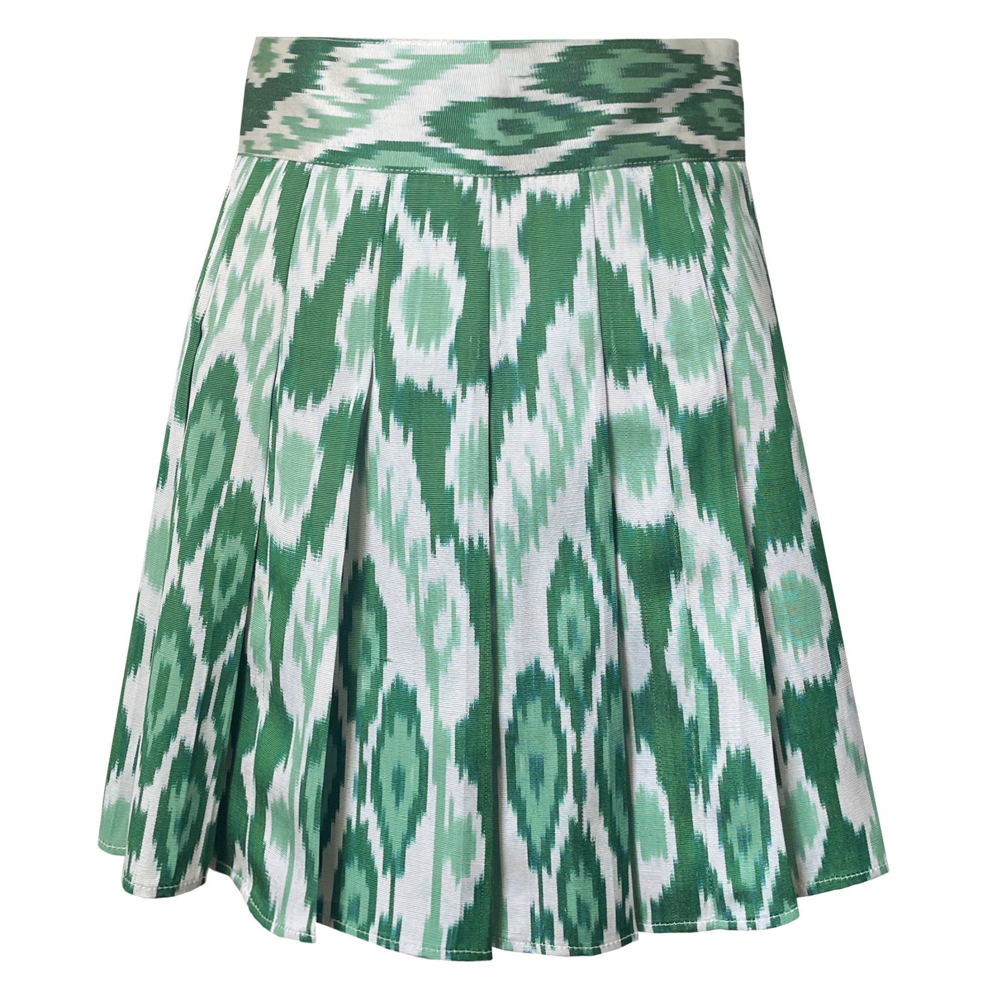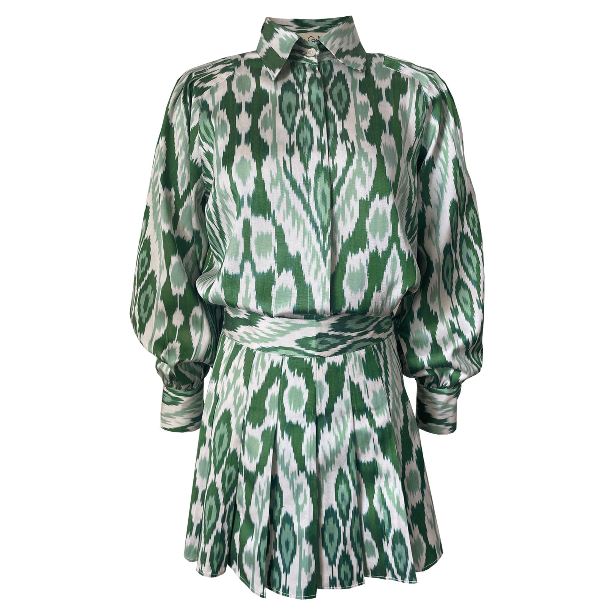 This Green Ikat Set is crafted from luxurious Uzbek Silk. Included in the set is a button-up blouse with long sleeves and a mini pleated skirt, making it an ideal choice for vibrant summer events.