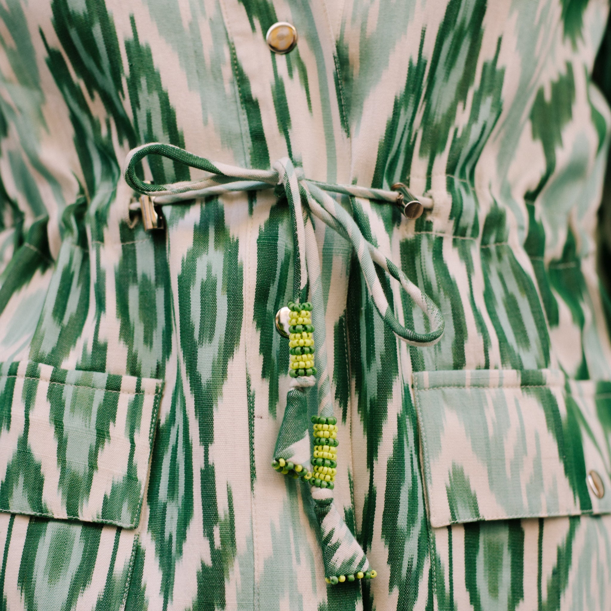 Introducing the Green Silk Safari Jacket, meticulously crafted from silk ikat from the South of India. This exquisite handloom textile showcases a captivating blend of green, mint, and white hues, forming an abstract pattern. Designed for both style and functionality, it features a fabric string at the waist for a flattering silhouette, adorned with embroidered tassels, frontal opening, front pockets, and a distinguished Nehru neck, this jacket effortlessly combines elegance with adventure.